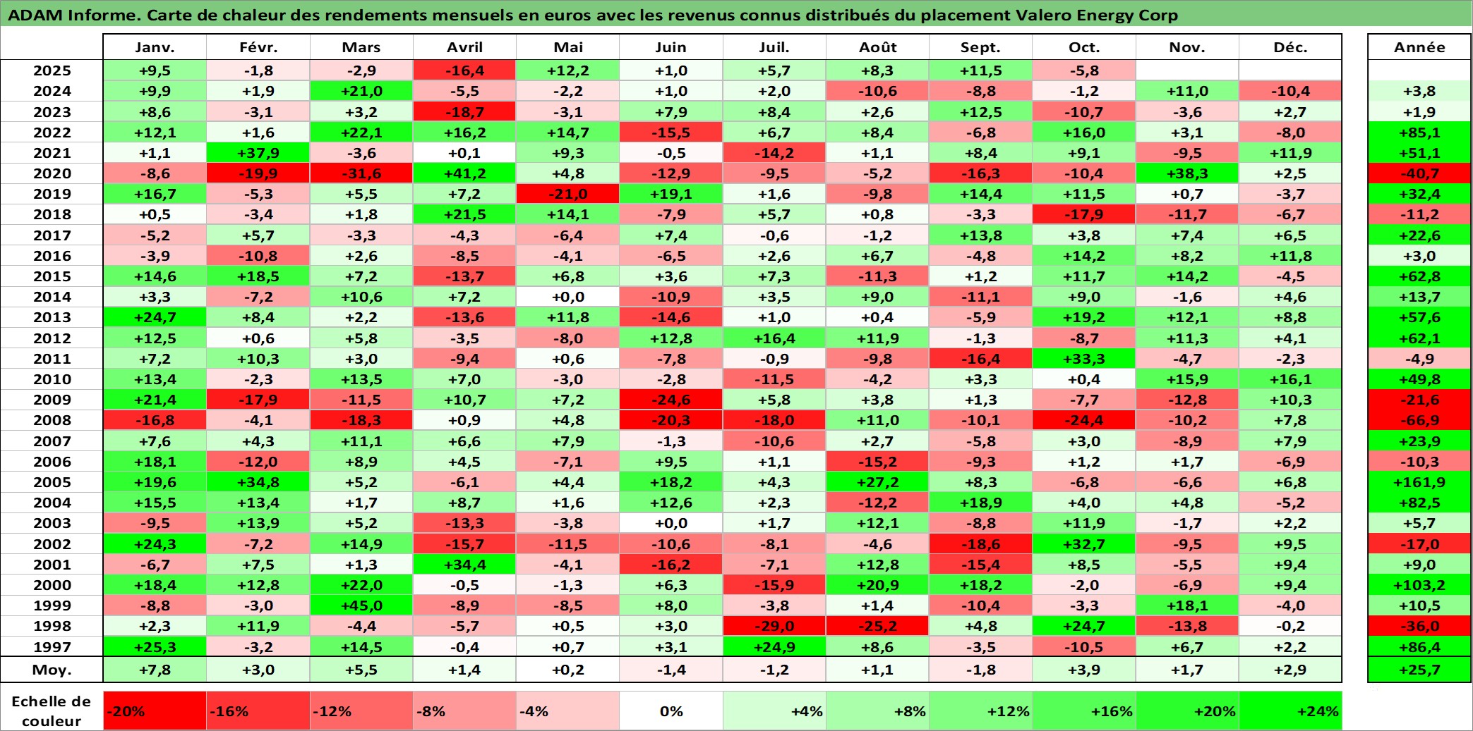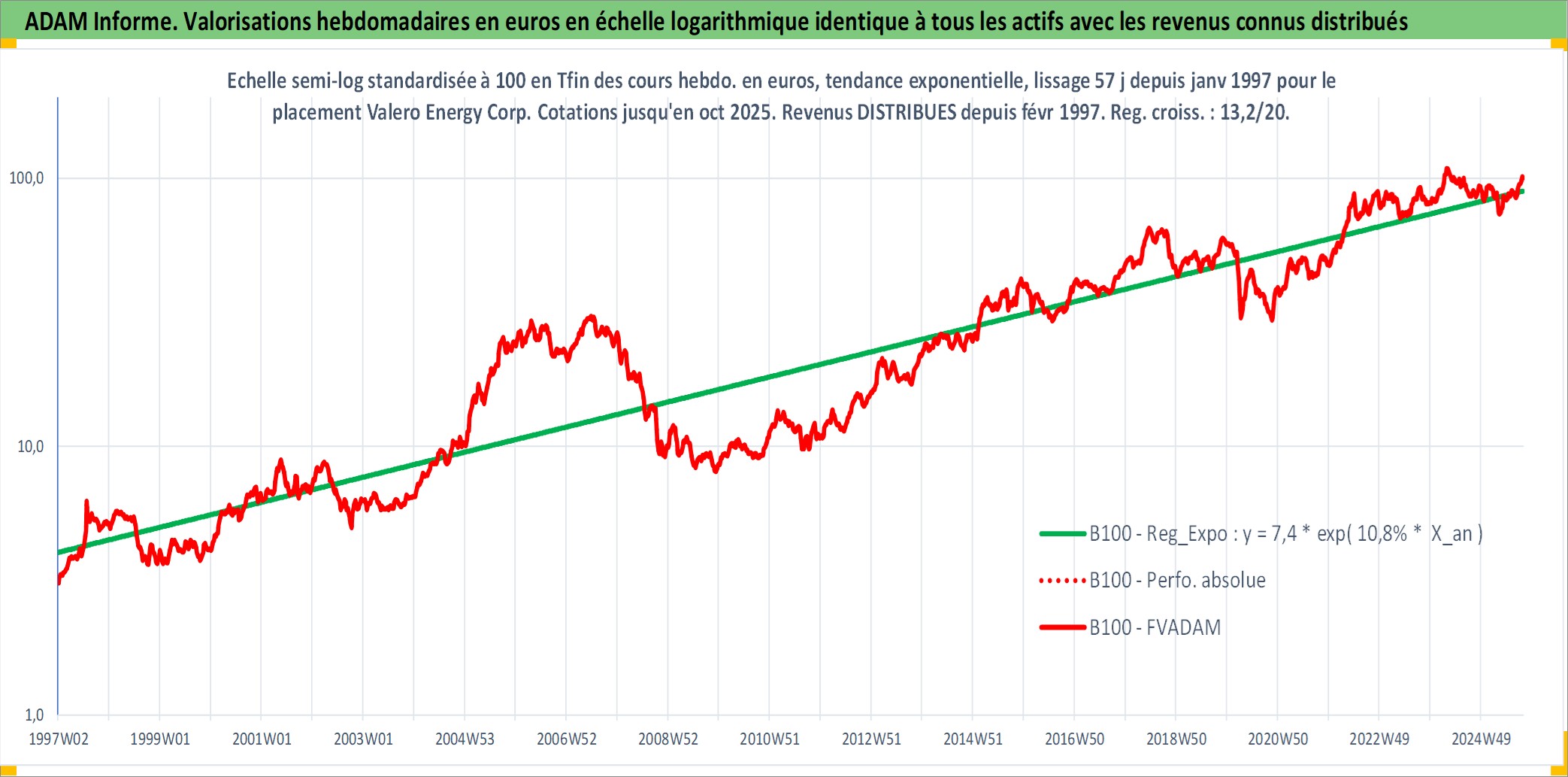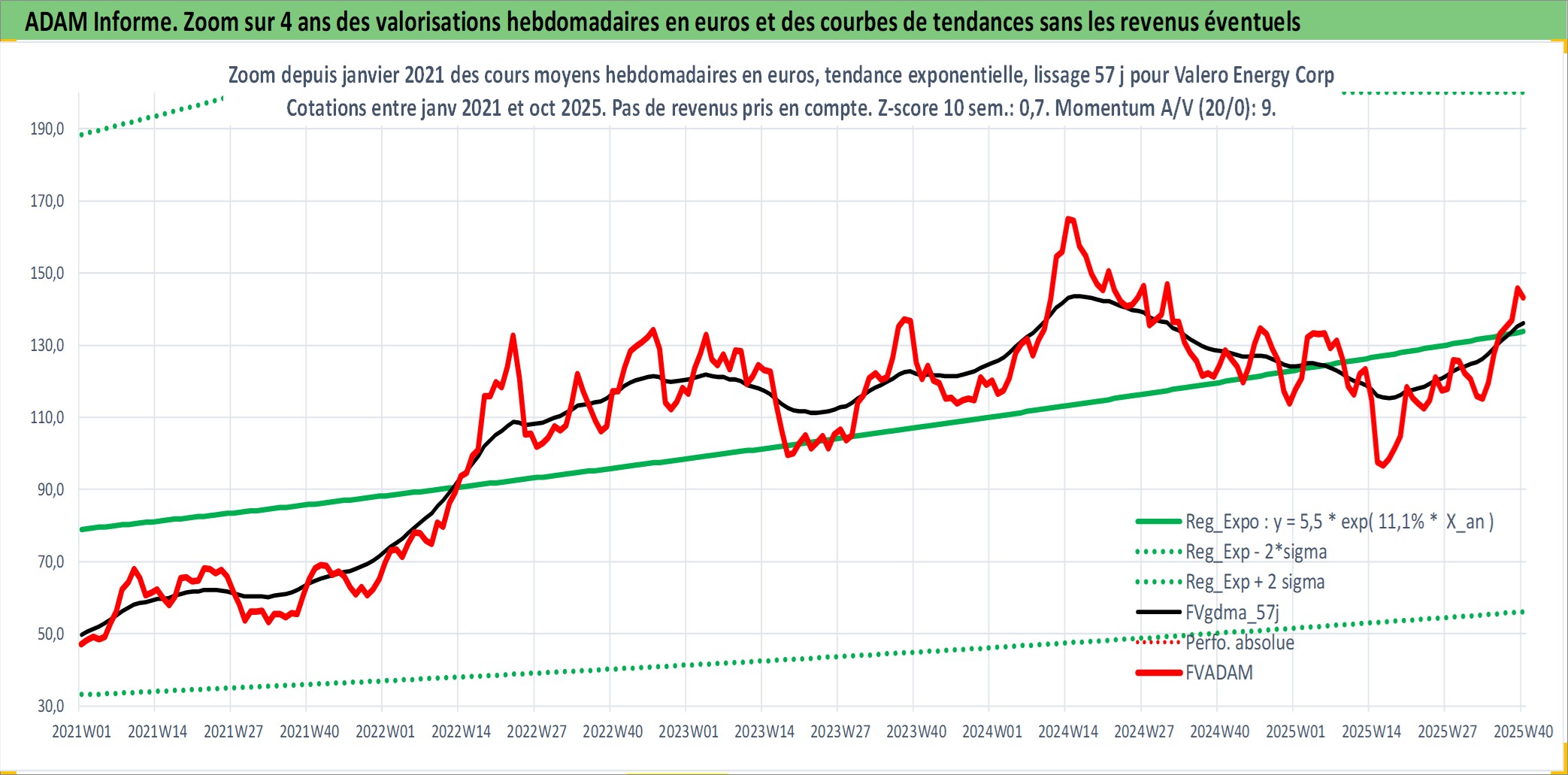 Site dédié aux investisseursPage dédiée sur site financeAnalyse des valorisations hebdomadaires de l'action Valero Energy Corp. Cet actif est cote en USD. Les valorisations sont en contrevaleur EURO et couvrent les semaines 1997W01 a 2025W40. Les revenus de cet actif financier sont pris en compte depuis la semaine 1997W06. La note globale ESG de cet actif est estimee a 5.0 (apres rebasage entre 0 et 20).
