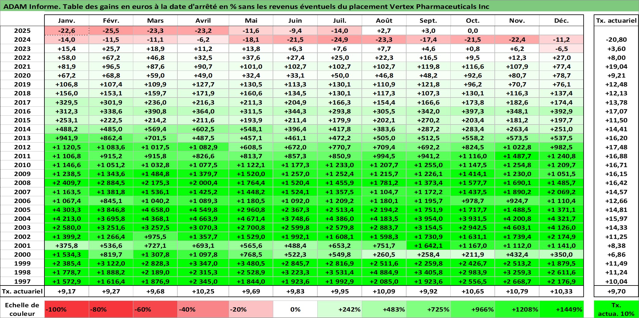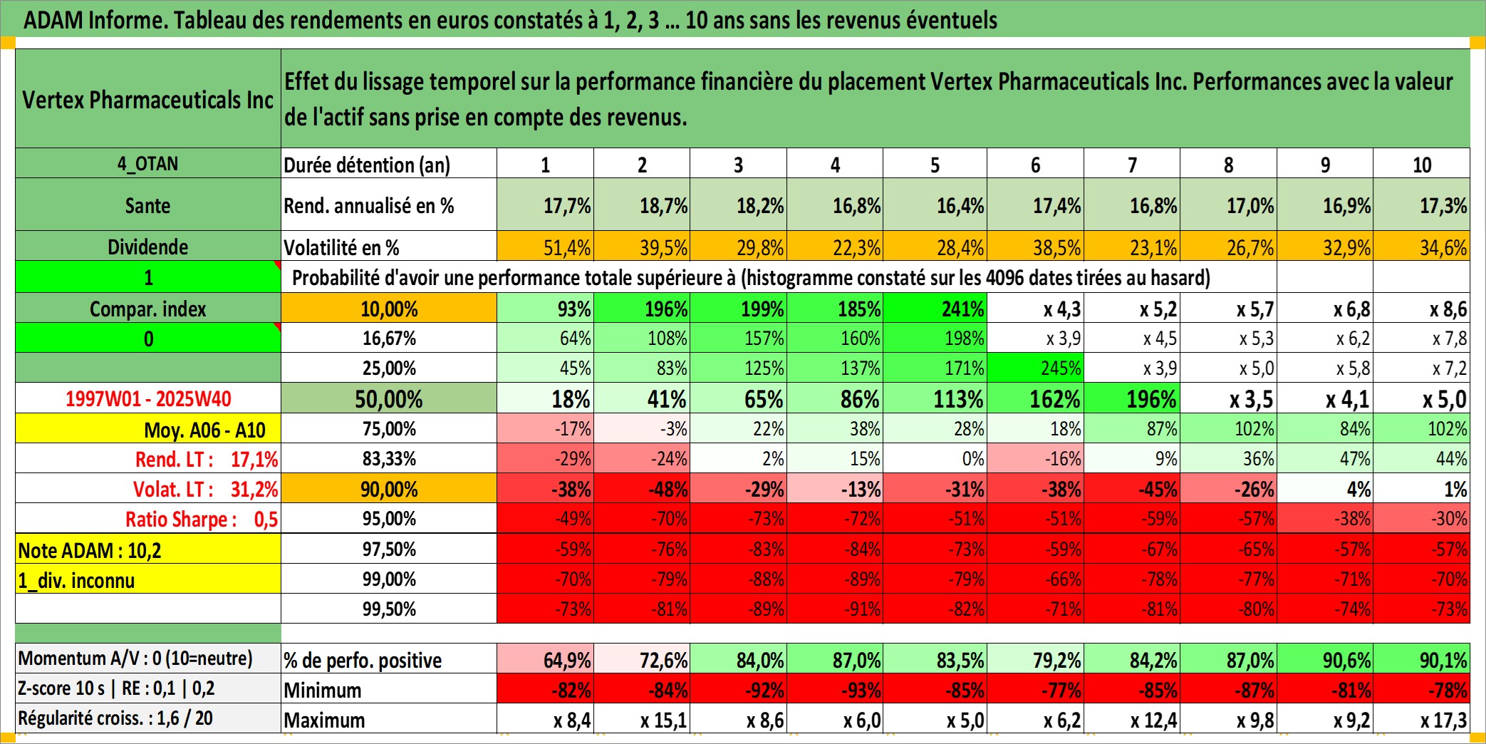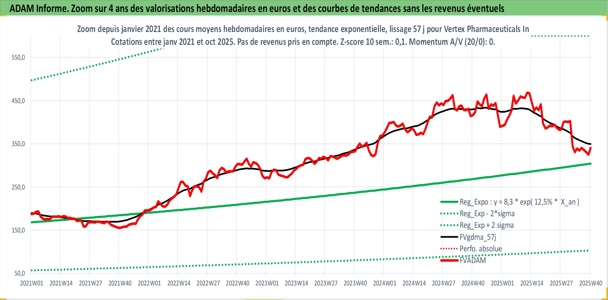 Site dédié aux investisseursPage dédiée sur site financeAnalyse des valorisations hebdomadaires de l'action Vertex Pharmaceuticals Inc. Cet actif est cote en USD. Les valorisations sont en contrevaleur EURO et couvrent les semaines 1997W01 a 2025W40. Les revenus de cet actif financier ne sont pas connus car non existants ou non disponibles sur le site Yahoo Finance. La note globale ESG de cet actif est estimee a 9.0 (apres rebasage entre 0 et 20).