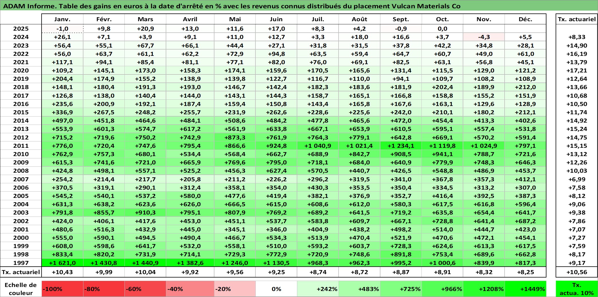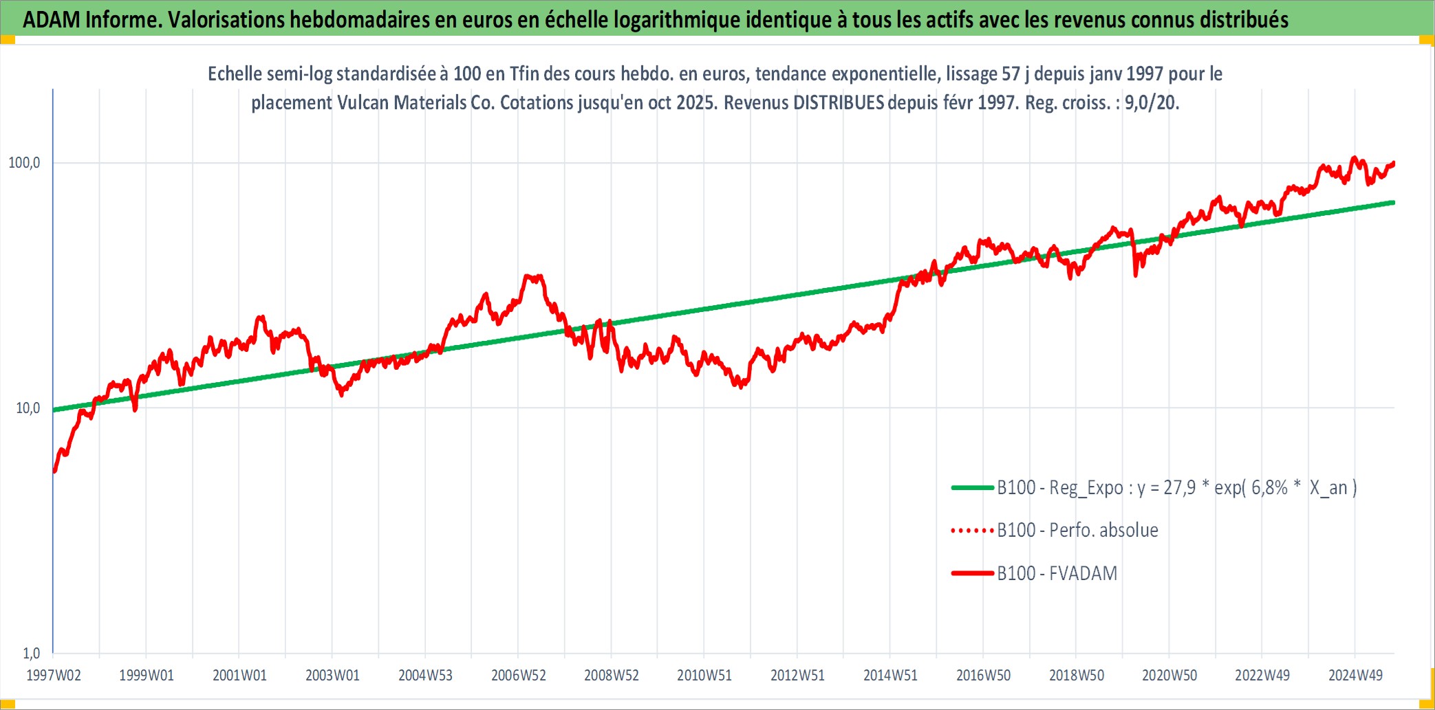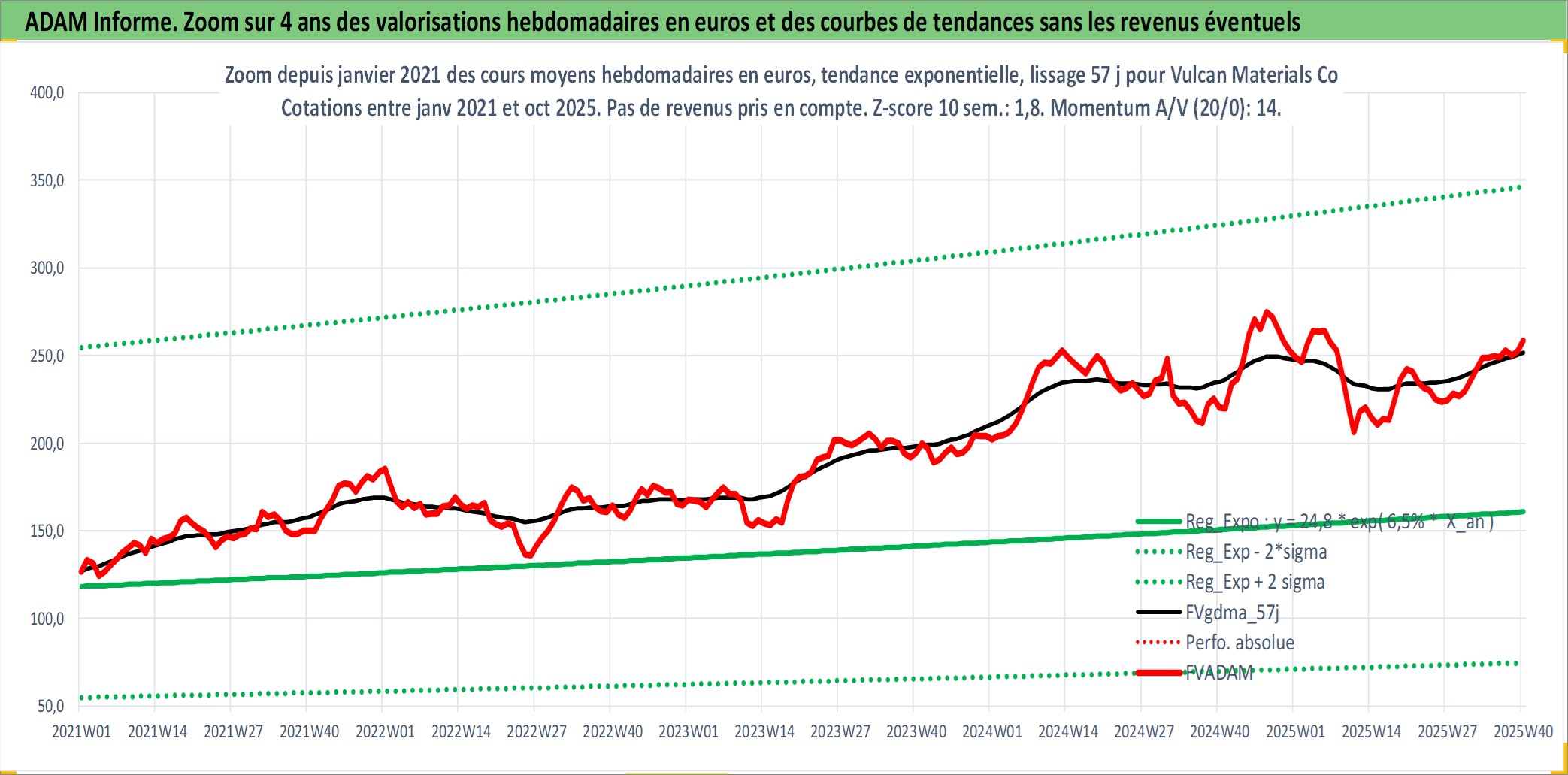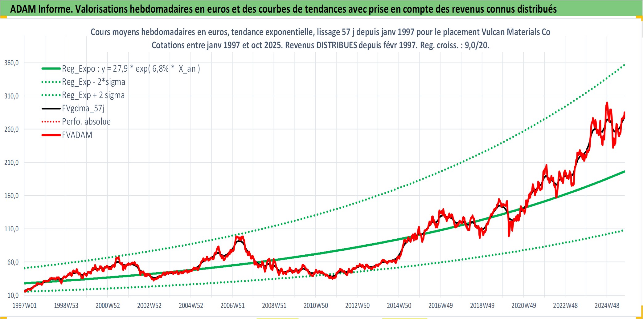 Site dédié aux investisseursPage dédiée sur site financeAnalyse des valorisations hebdomadaires de l'action Vulcan Materials Co. Cet actif est cote en USD. Les valorisations sont en contrevaleur EURO et couvrent les semaines 1997W01 a 2025W40. Les revenus de cet actif financier sont pris en compte depuis la semaine 1997W08. La note globale ESG de cet actif est estimee a 6.0 (apres rebasage entre 0 et 20).