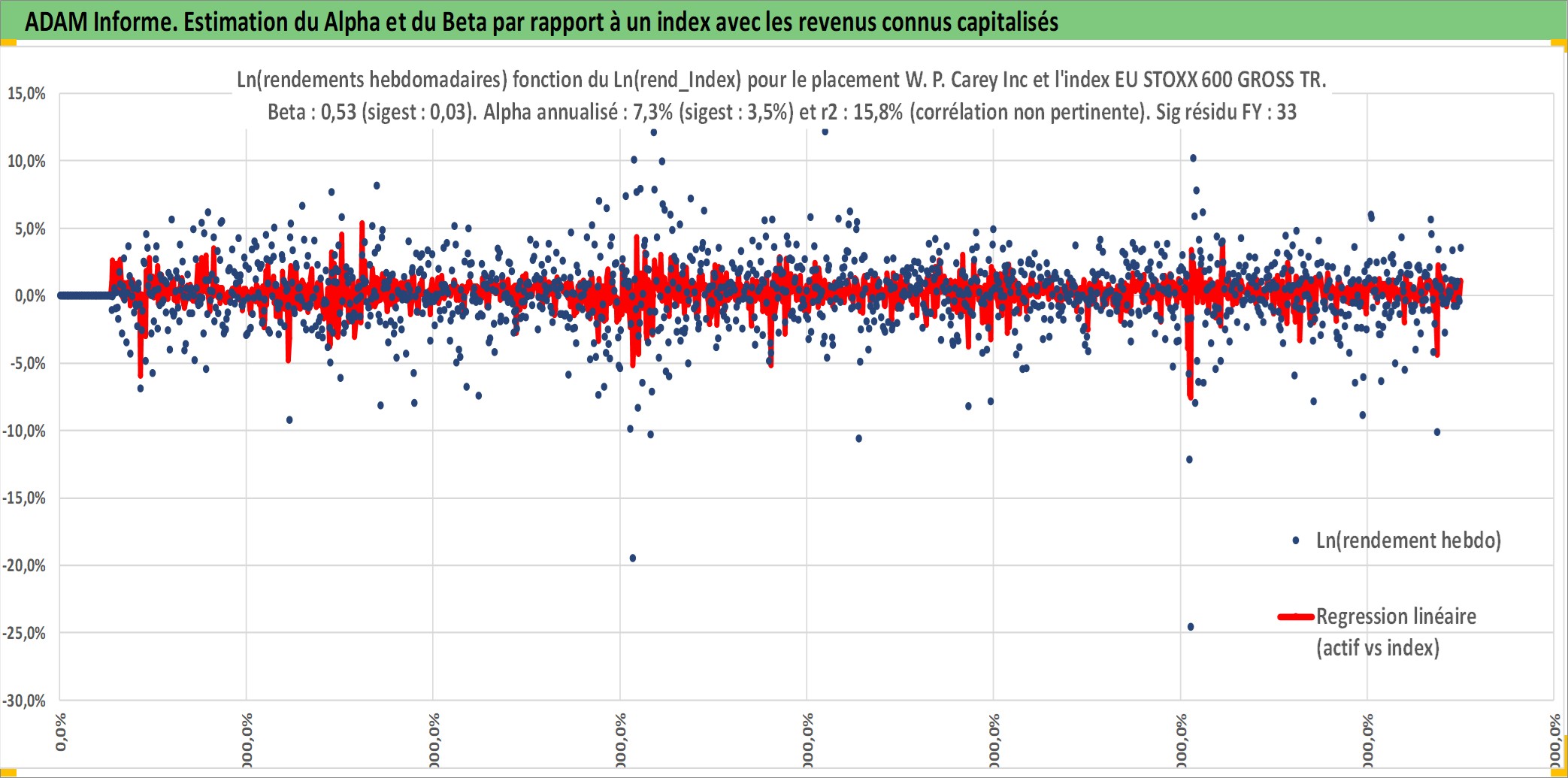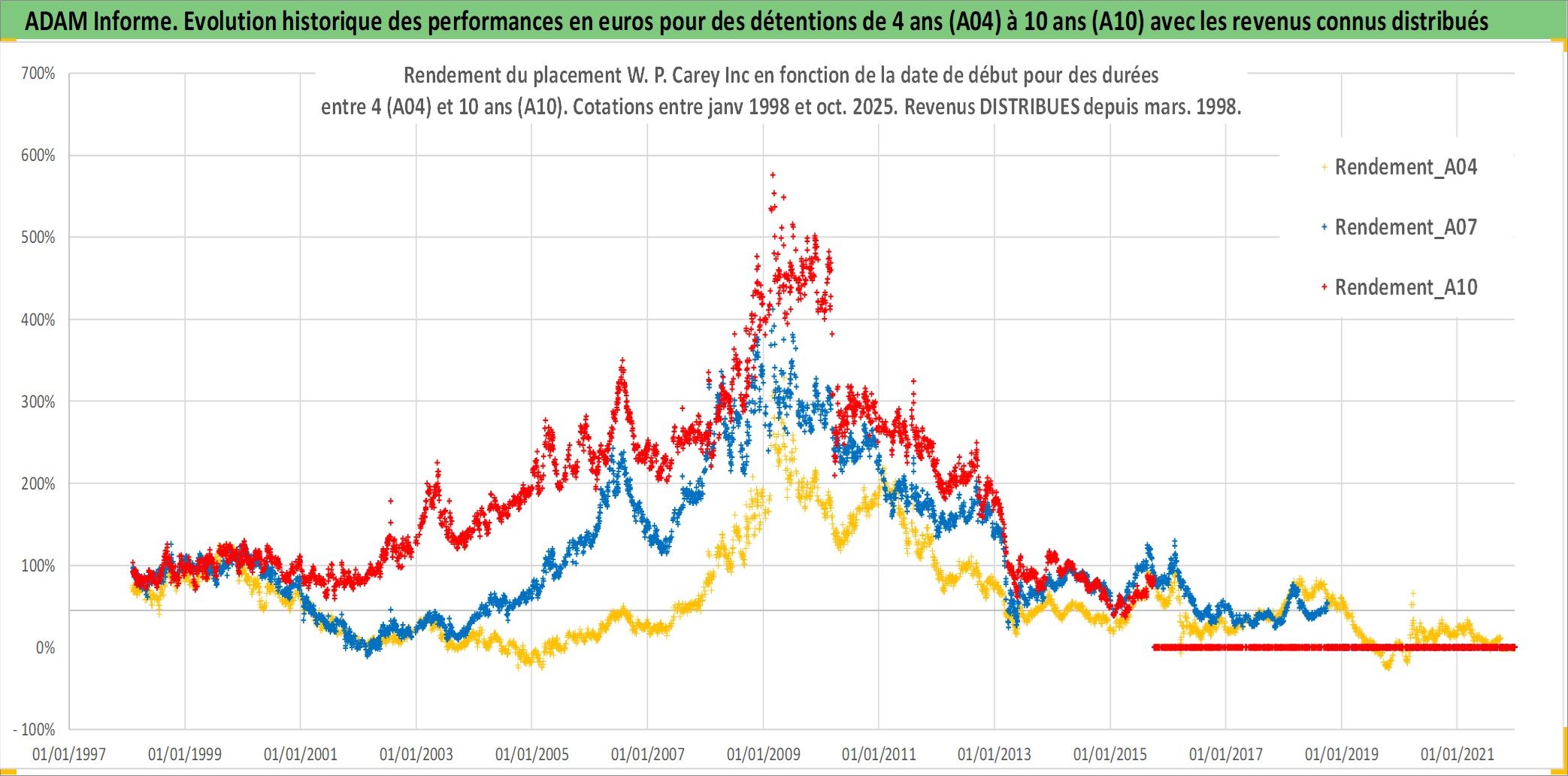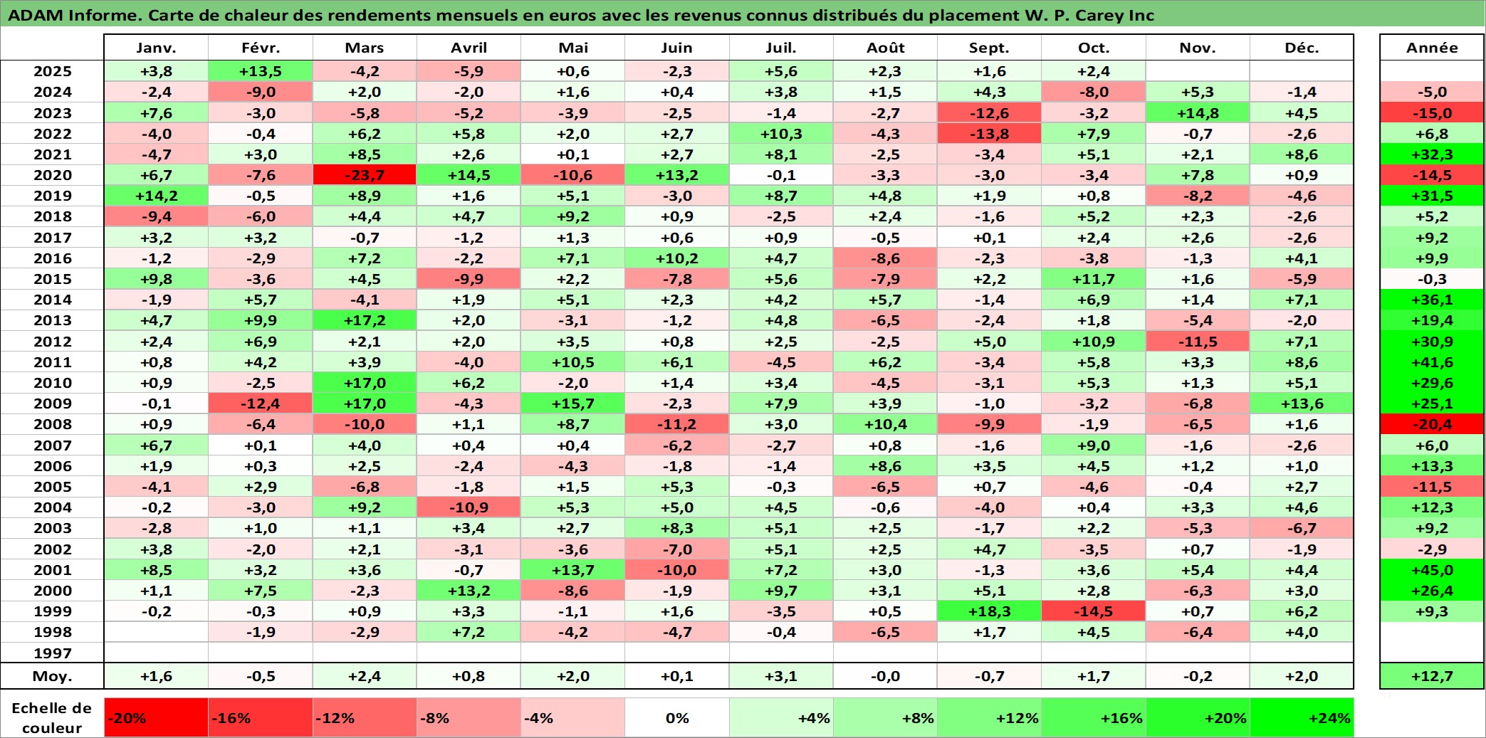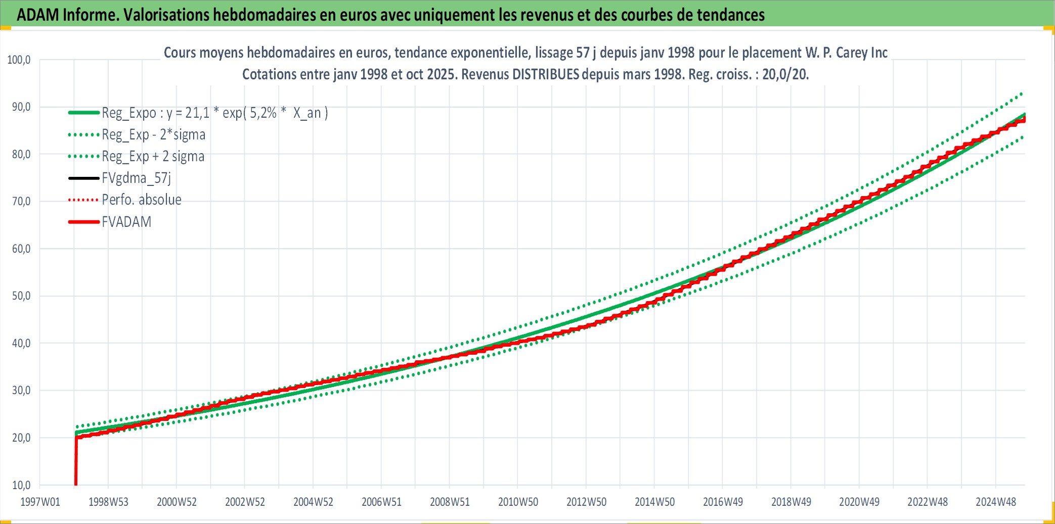 Site dédié aux investisseursPage dédiée sur site financeAnalyse des valorisations hebdomadaires de l'action W. P. Carey Inc. Cet actif est cote en USD. Les valorisations sont en contrevaleur EURO et couvrent les semaines 1998W04 a 2025W40. Les revenus de cet actif financier sont pris en compte depuis la semaine 1998W13. La note globale ESG de cet actif est estimee a 13.0 (apres rebasage entre 0 et 20).