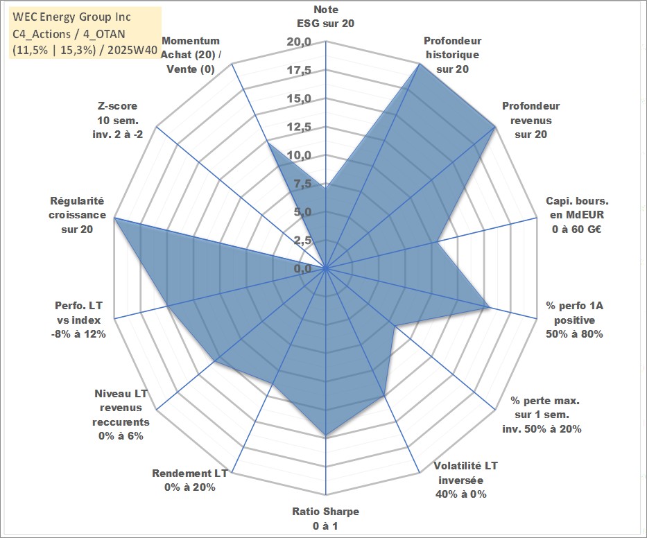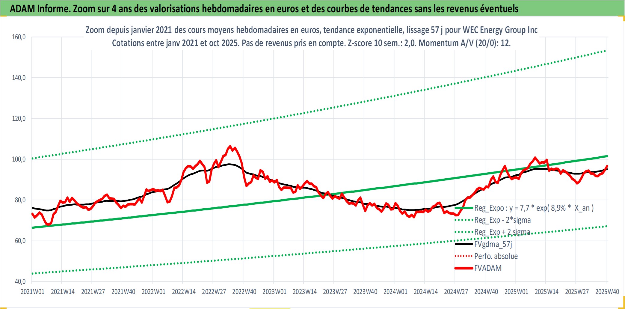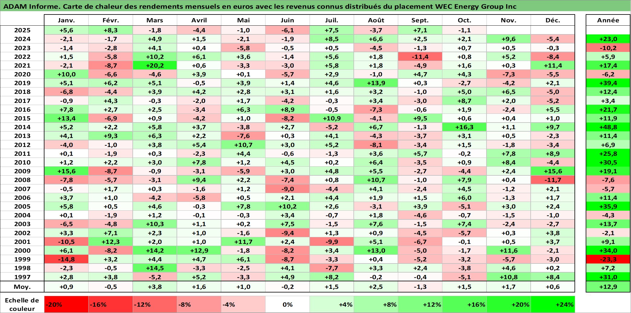 Site dédié aux investisseursPage dédiée sur site financeAnalyse des valorisations hebdomadaires de l'action WEC Energy Group Inc. Cet actif est cote en USD. Les valorisations sont en contrevaleur EURO et couvrent les semaines 1997W01 a 2025W40. Les revenus de cet actif financier sont pris en compte depuis la semaine 1997W07. La note globale ESG de cet actif est estimee a 7.0 (apres rebasage entre 0 et 20).