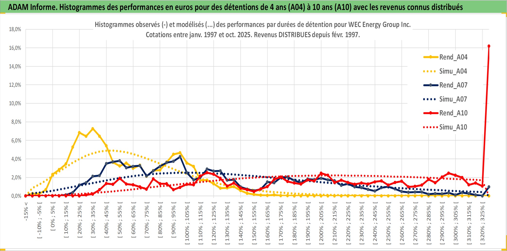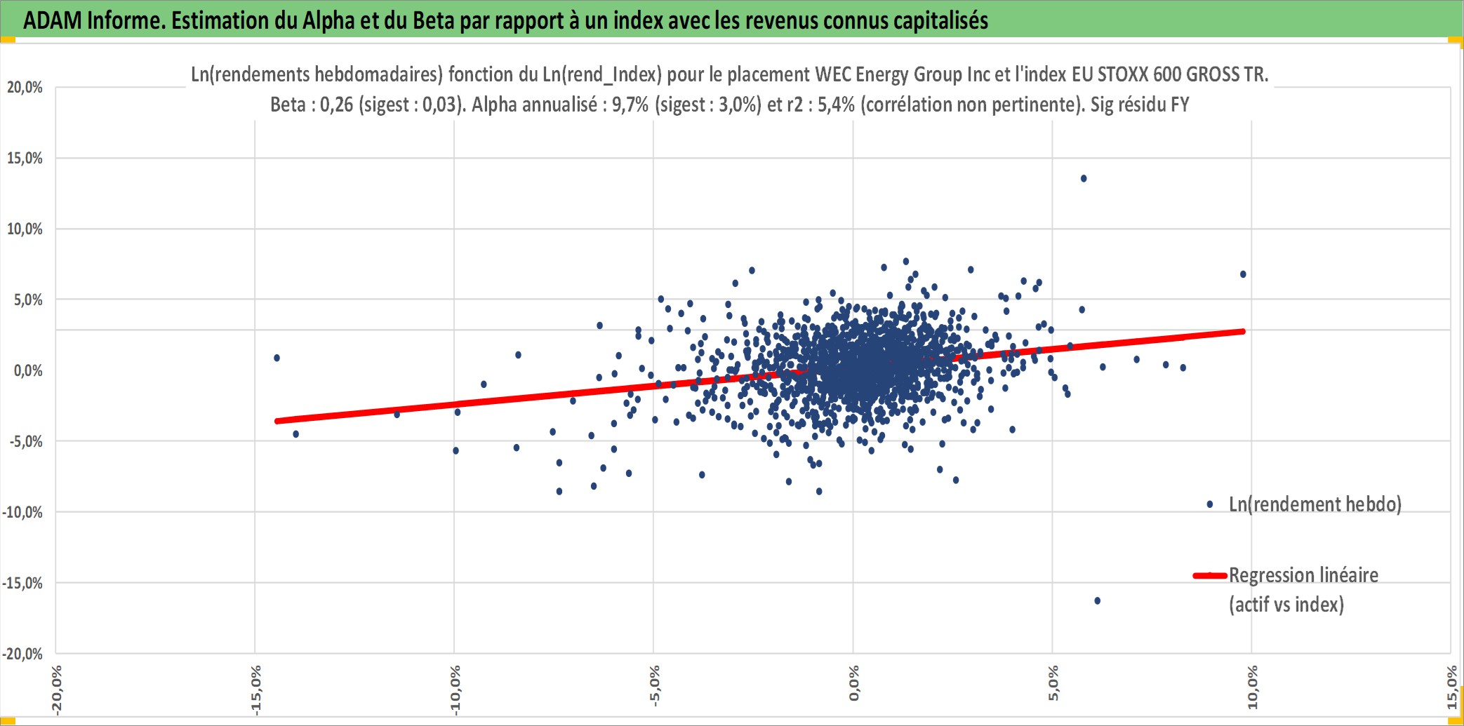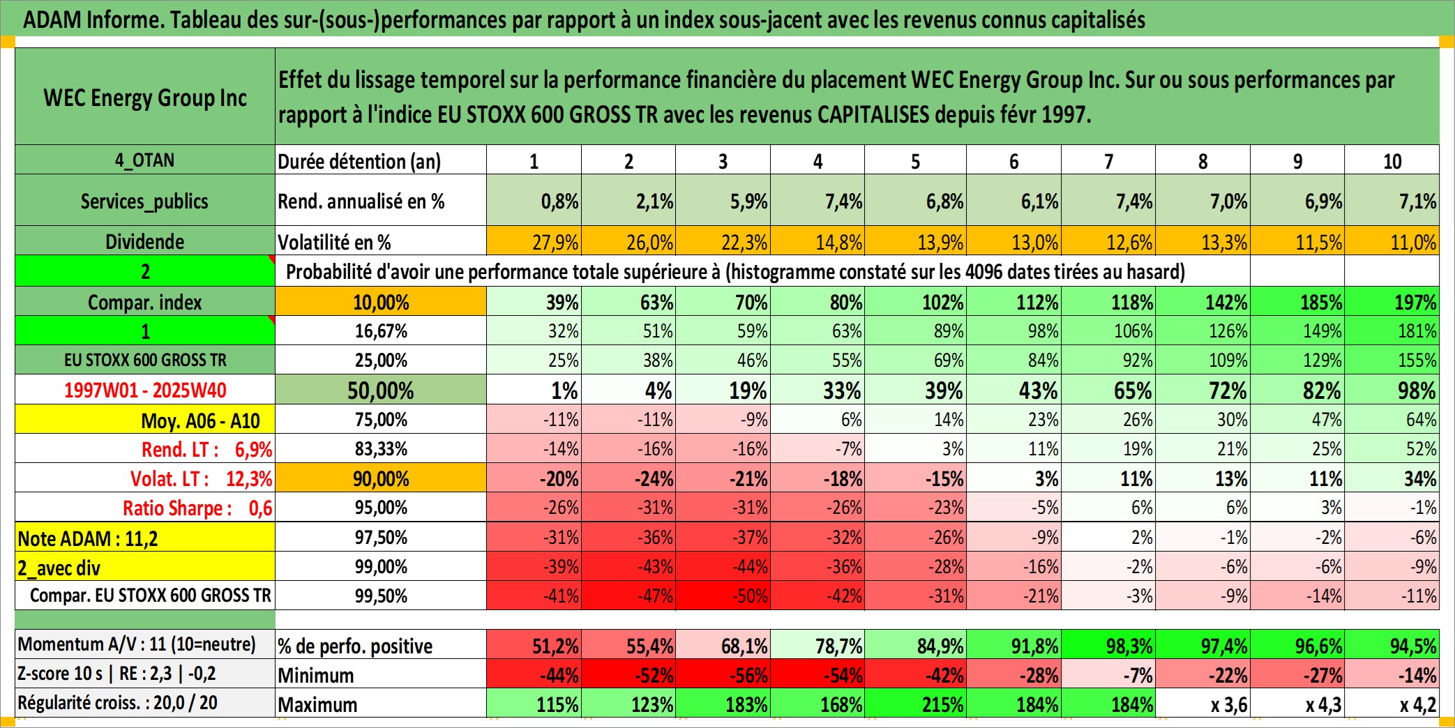 Site dédié aux investisseursPage dédiée sur site financeAnalyse des valorisations hebdomadaires de l'action WEC Energy Group Inc. Cet actif est cote en USD. Les valorisations sont en contrevaleur EURO et couvrent les semaines 1997W01 a 2025W40. Les revenus de cet actif financier sont pris en compte depuis la semaine 1997W07. La note globale ESG de cet actif est estimee a 7.0 (apres rebasage entre 0 et 20).