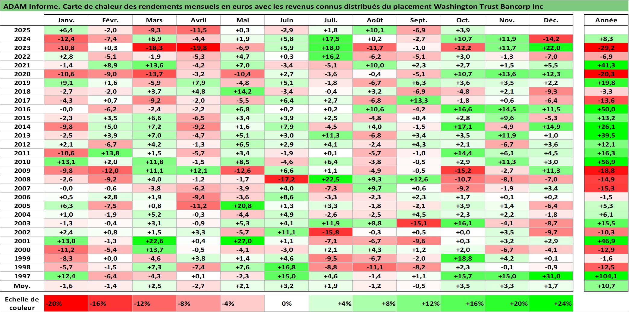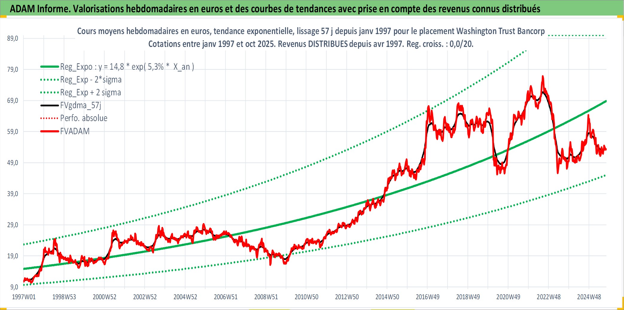 Site dédié aux investisseursPage dédiée sur site financeAnalyse des valorisations hebdomadaires de l'action Washington Trust Bancorp Inc. Cet actif est cote en USD. Les valorisations sont en contrevaleur EURO et couvrent les semaines 1997W01 a 2025W40. Les revenus de cet actif financier sont pris en compte depuis la semaine 1997W14. La note ESG de cet actif n'est pas connue.