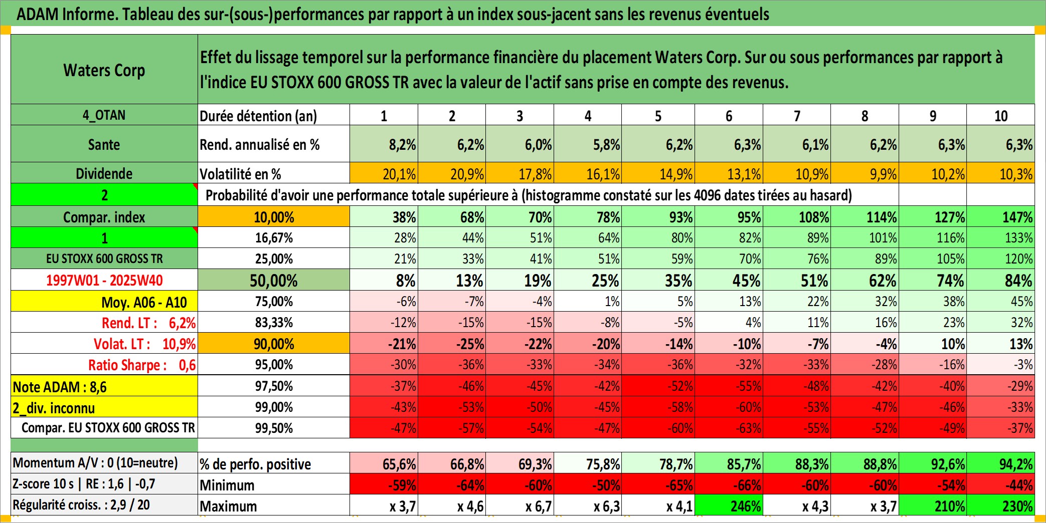 Site dédié aux investisseursPage dédiée sur site financeAnalyse des valorisations hebdomadaires de l'action Waters Corp. Cet actif est cote en USD. Les valorisations sont en contrevaleur EURO et couvrent les semaines 1997W01 a 2025W40. Les revenus de cet actif financier ne sont pas connus car non existants ou non disponibles sur le site Yahoo Finance. La note globale ESG de cet actif est estimee a 12.0 (apres rebasage entre 0 et 20).