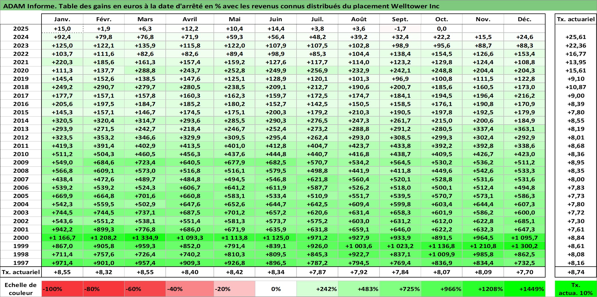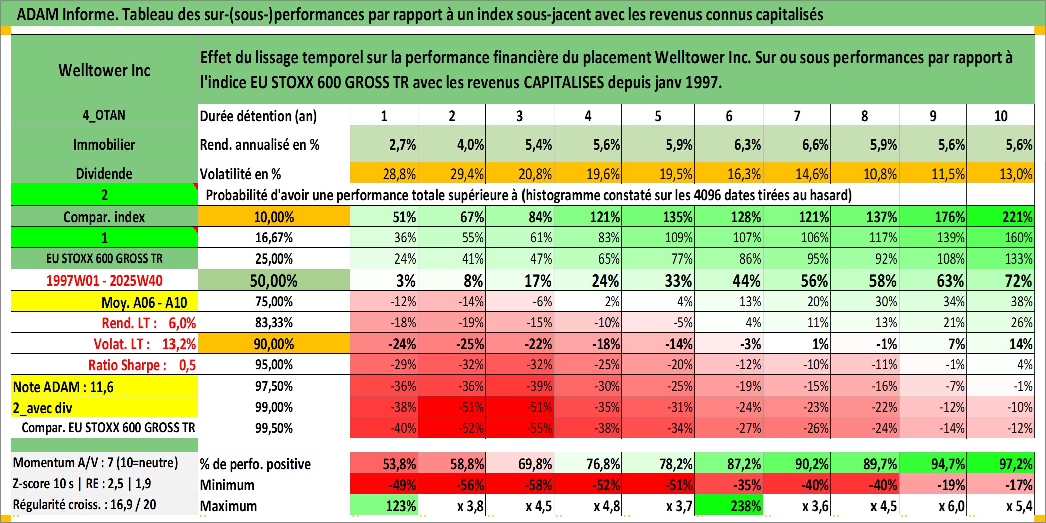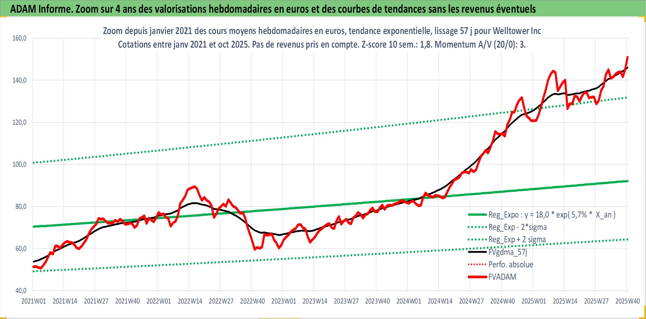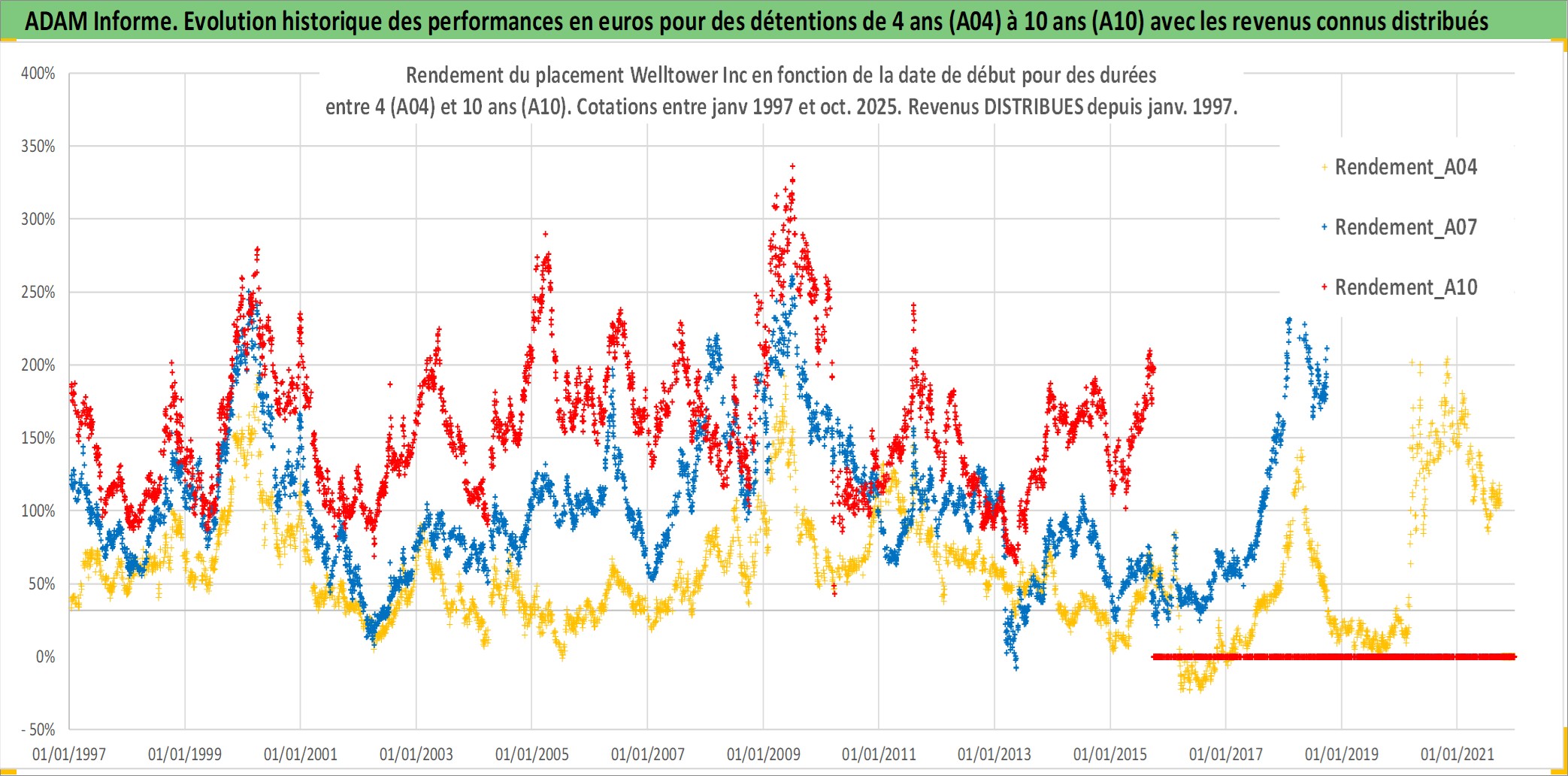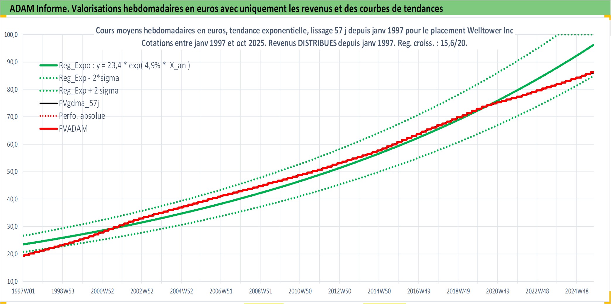 Site dédié aux investisseursPage dédiée sur site financeAnalyse des valorisations hebdomadaires de l'action Welltower Inc. Cet actif est cote en USD. Les valorisations sont en contrevaleur EURO et couvrent les semaines 1997W01 a 2025W40. Les revenus de cet actif financier sont pris en compte depuis la semaine 1997W05. La note globale ESG de cet actif est estimee a 15.0 (apres rebasage entre 0 et 20).