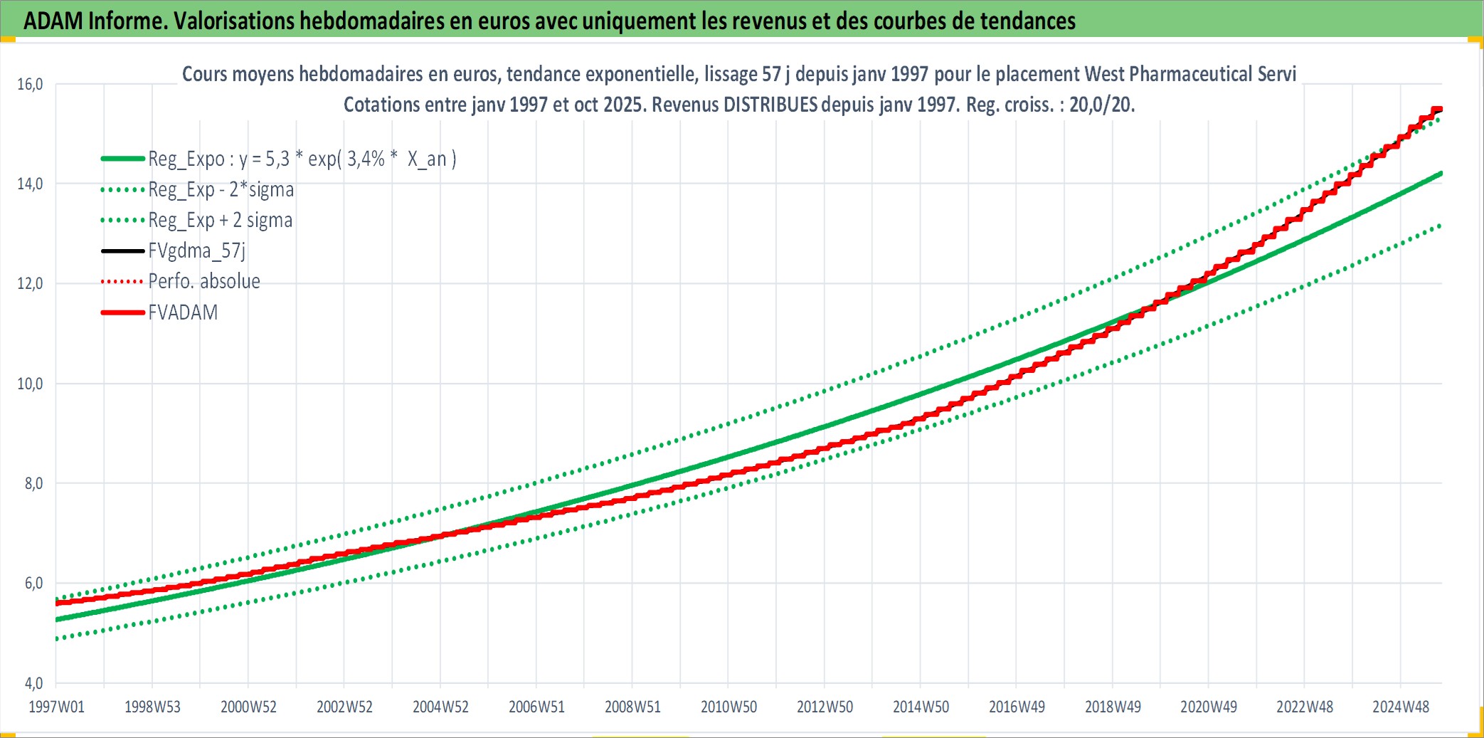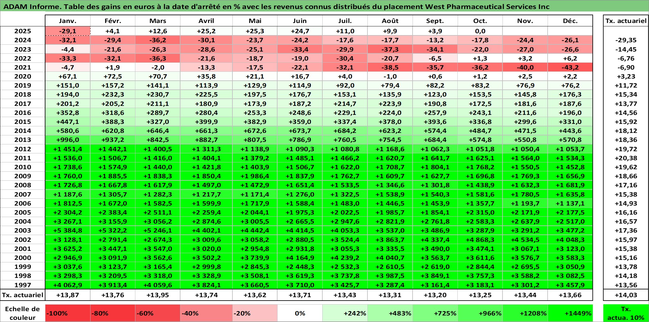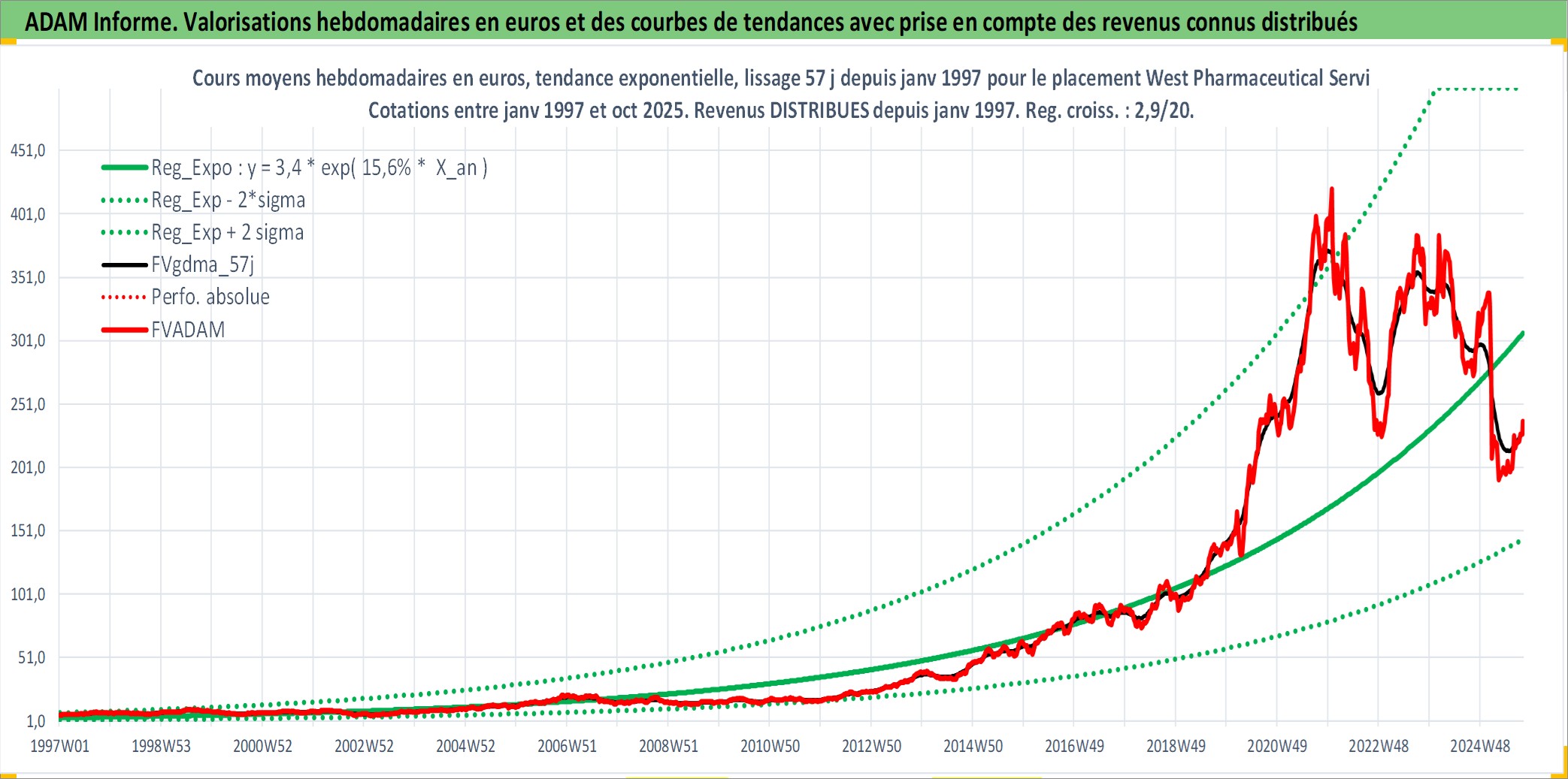 Site dédié aux investisseursPage dédiée sur site financeAnalyse des valorisations hebdomadaires de l'action West Pharmaceutical Services Inc. Cet actif est cote en USD. Les valorisations sont en contrevaleur EURO et couvrent les semaines 1997W01 a 2025W40. Les revenus de cet actif financier sont pris en compte depuis la semaine 1997W03. La note ESG de cet actif n'est pas connue.