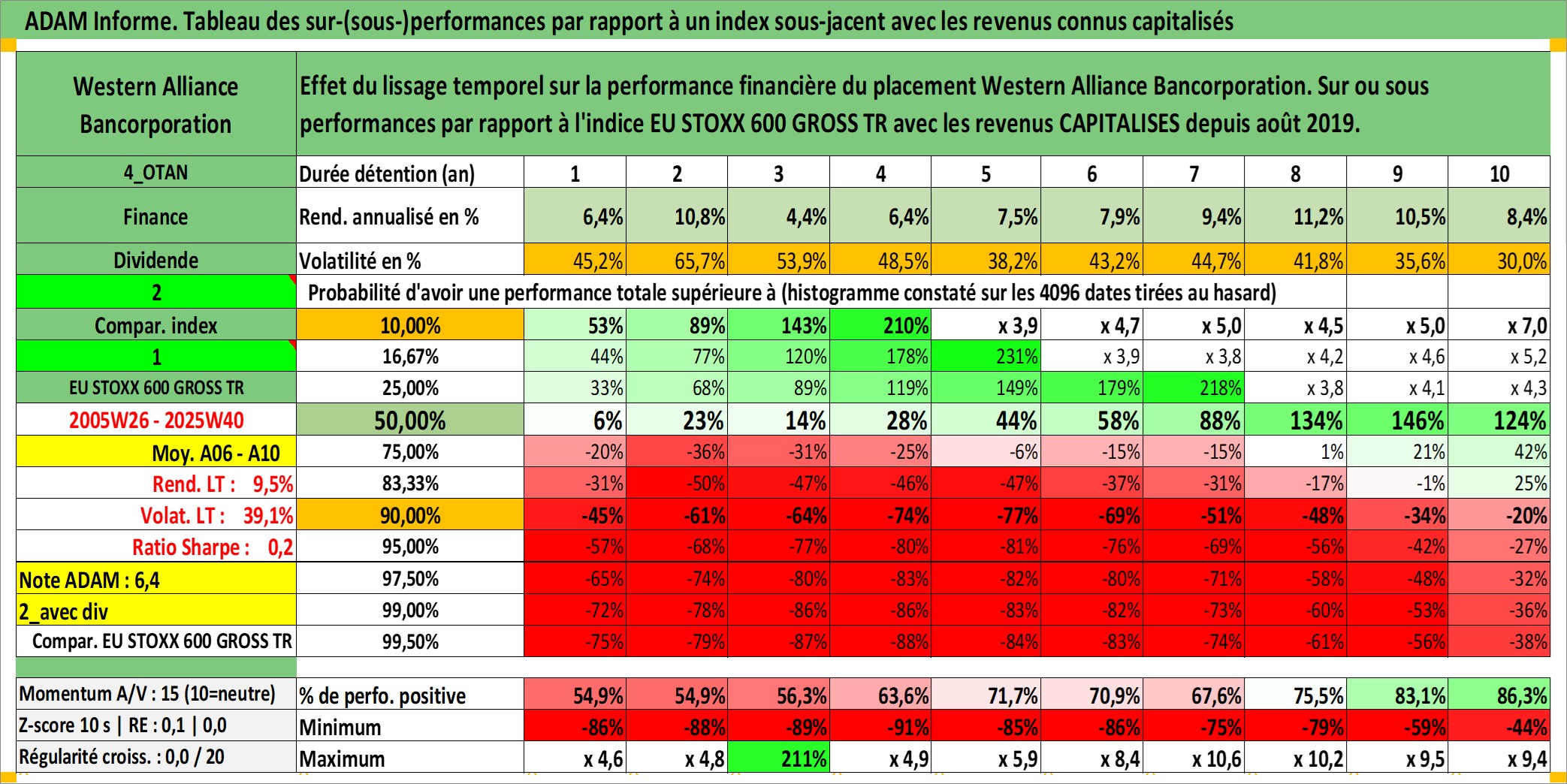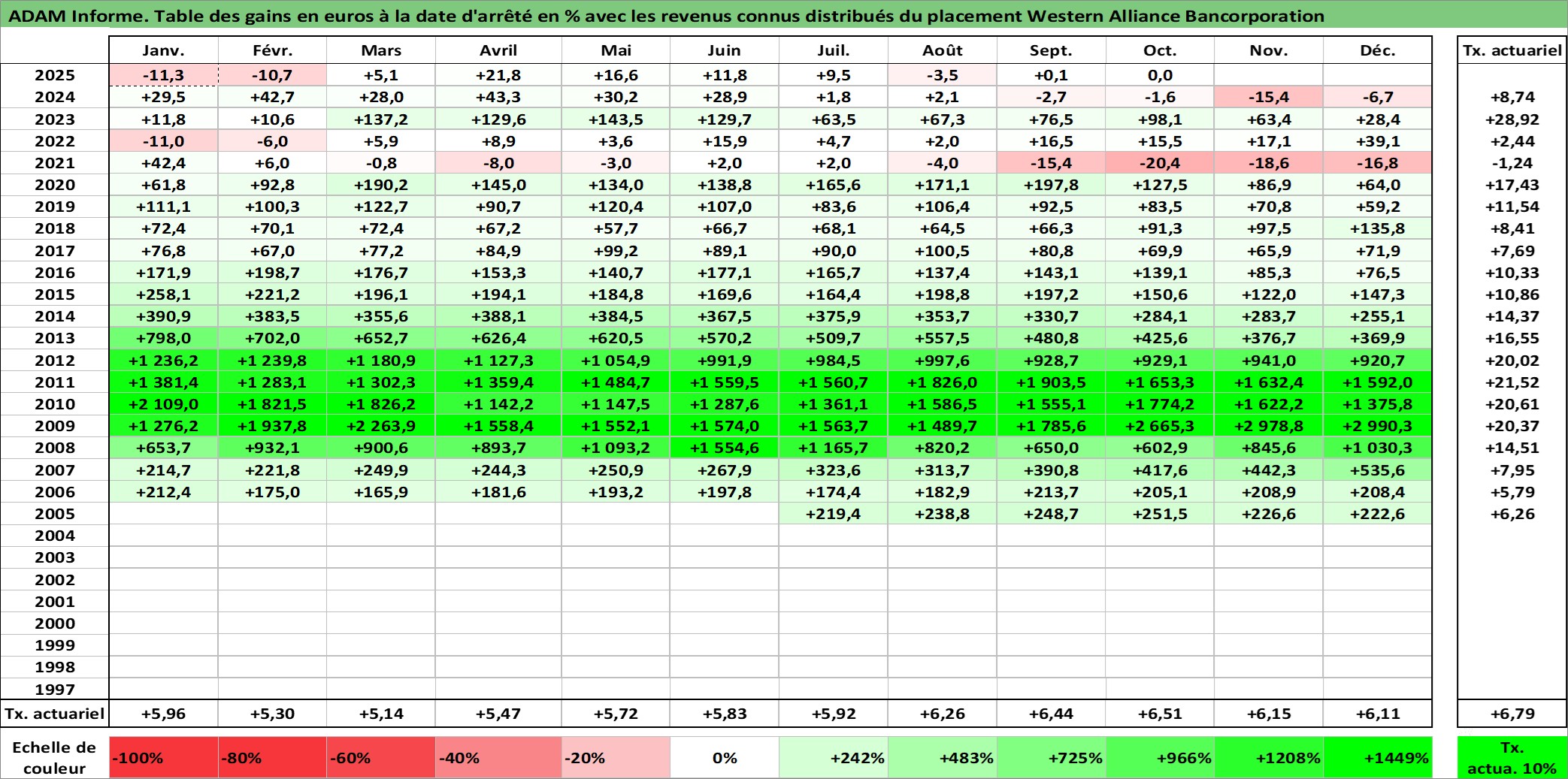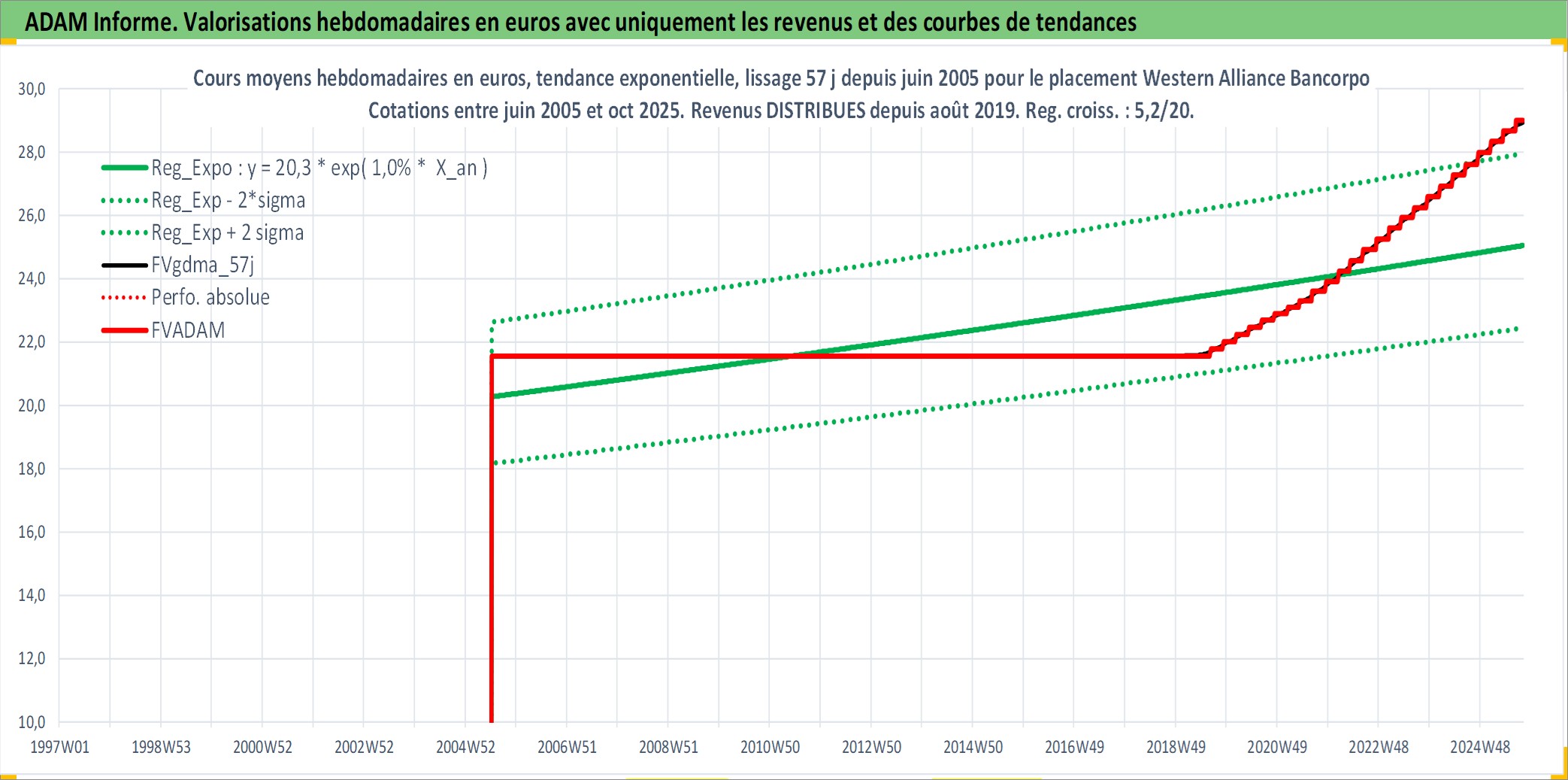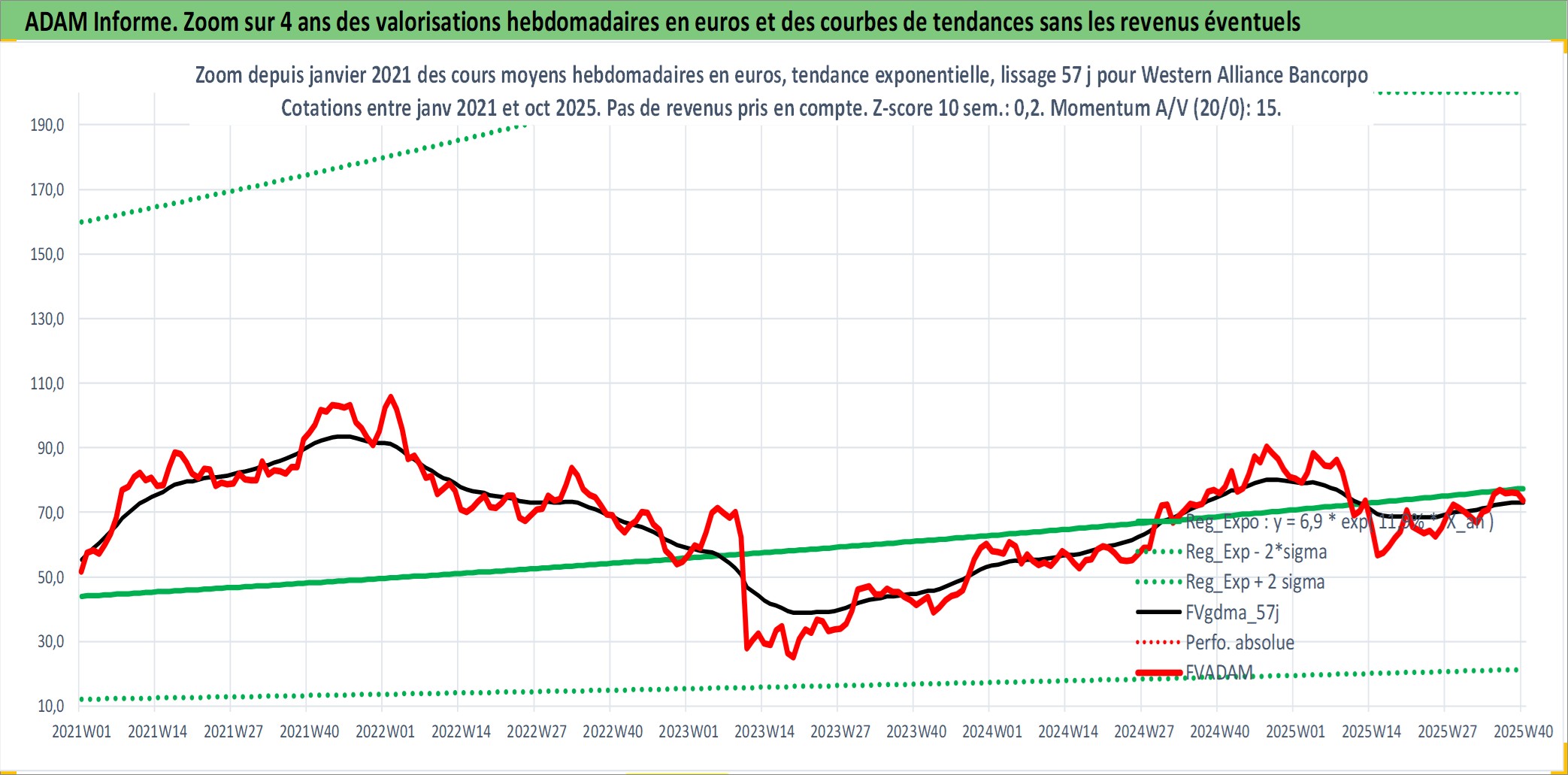 Site dédié aux investisseursPage dédiée sur site financeAnalyse des valorisations hebdomadaires de l'action Western Alliance Bancorporation. Cet actif est cote en USD. Les valorisations sont en contrevaleur EURO et couvrent les semaines 2005W26 a 2025W40. Les revenus de cet actif financier sont pris en compte depuis la semaine 2019W33. La note ESG de cet actif n'est pas connue.