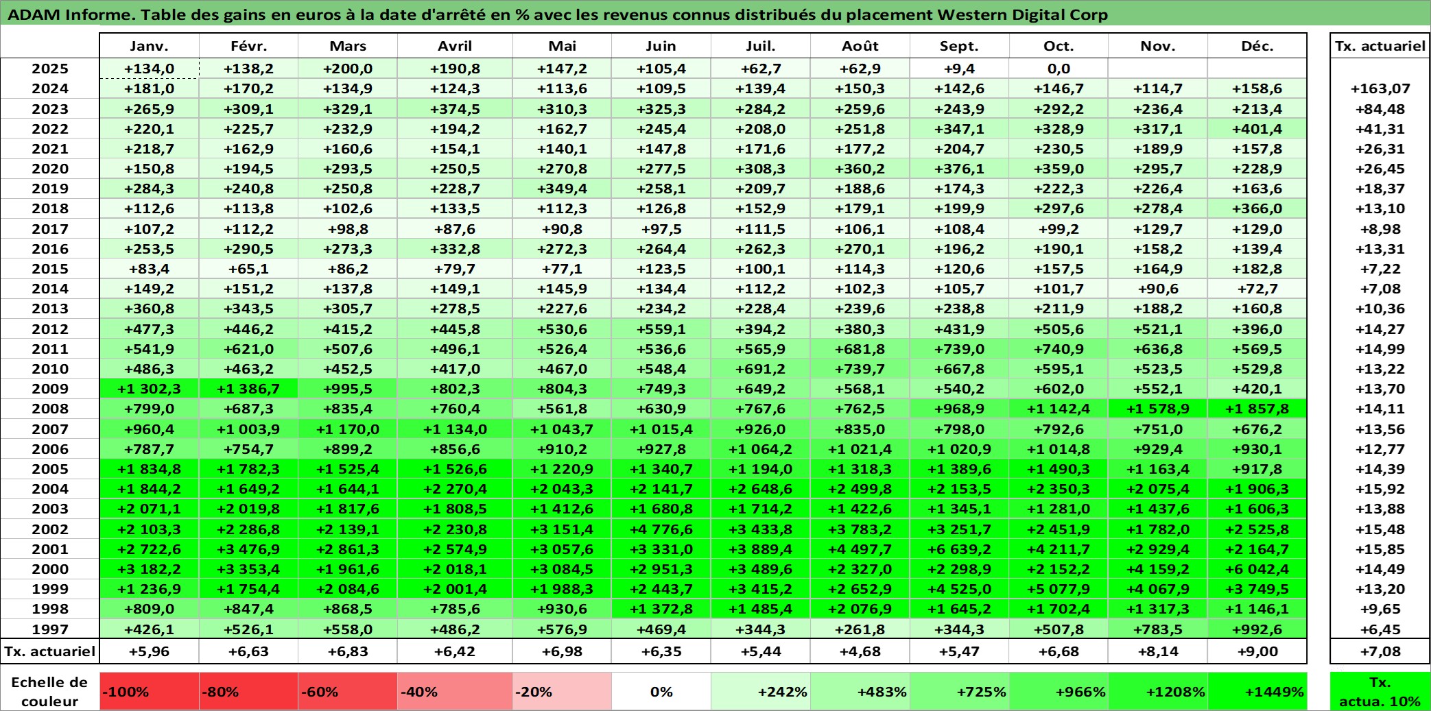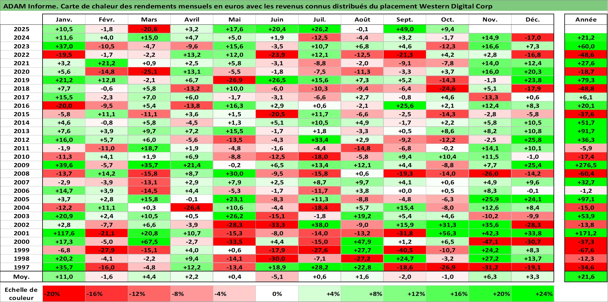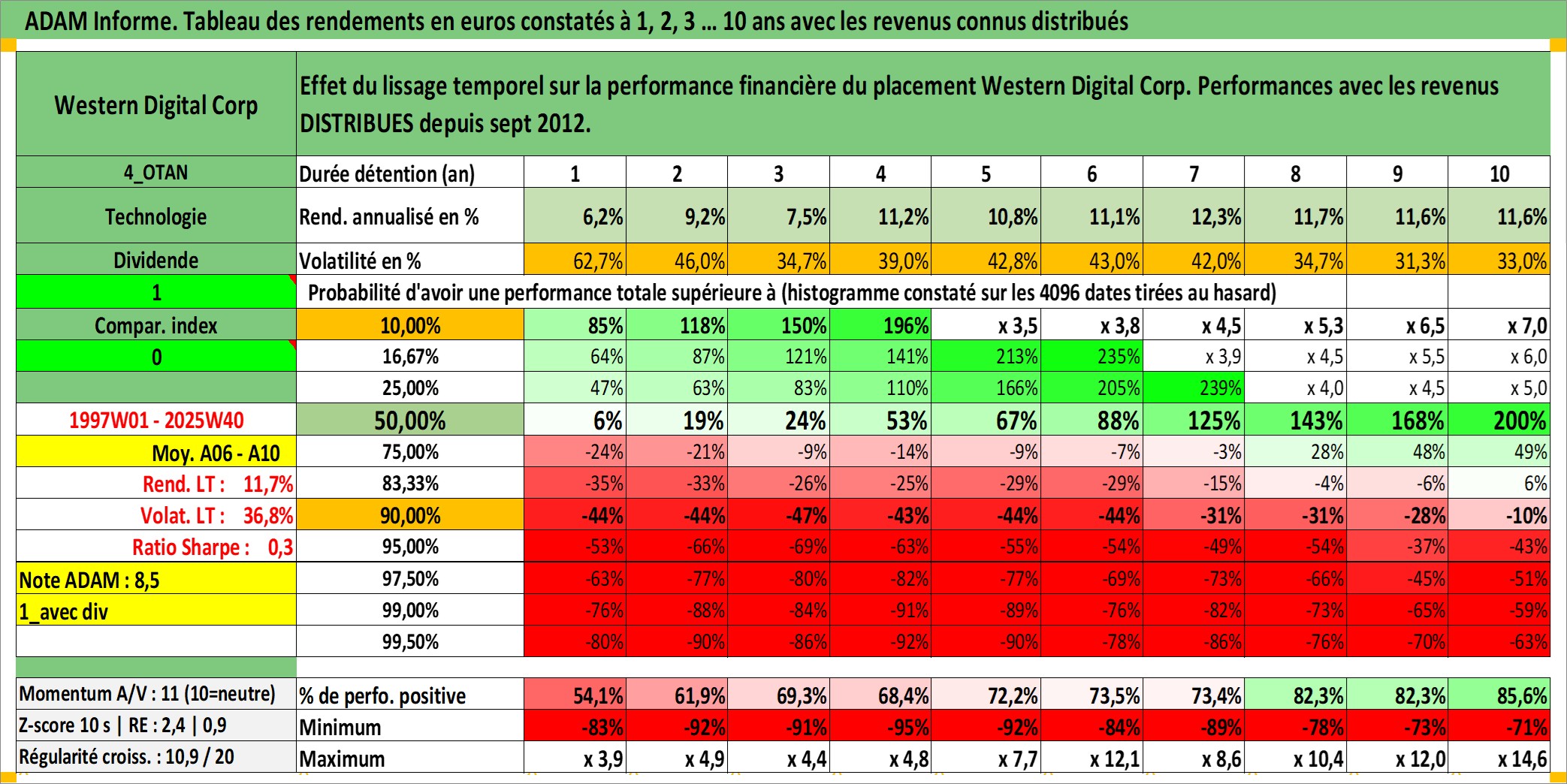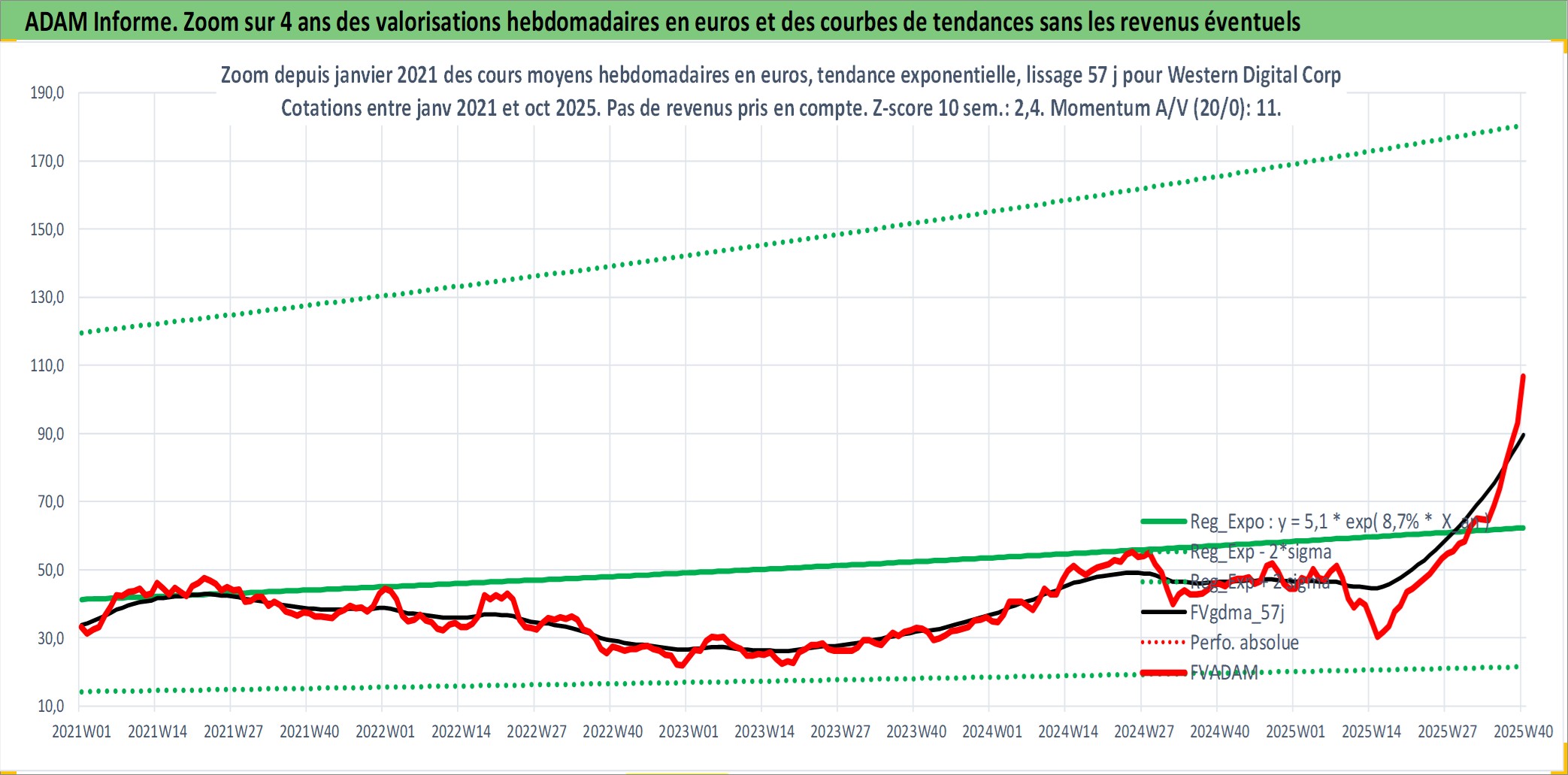 Site dédié aux investisseursPage dédiée sur site financeAnalyse des valorisations hebdomadaires de l'action Western Digital Corp. Cet actif est cote en USD. Les valorisations sont en contrevaleur EURO et couvrent les semaines 1997W01 a 2025W40. Les revenus de cet actif financier sont pris en compte depuis la semaine 2012W39. La note globale ESG de cet actif est estimee a 16.0 (apres rebasage entre 0 et 20).