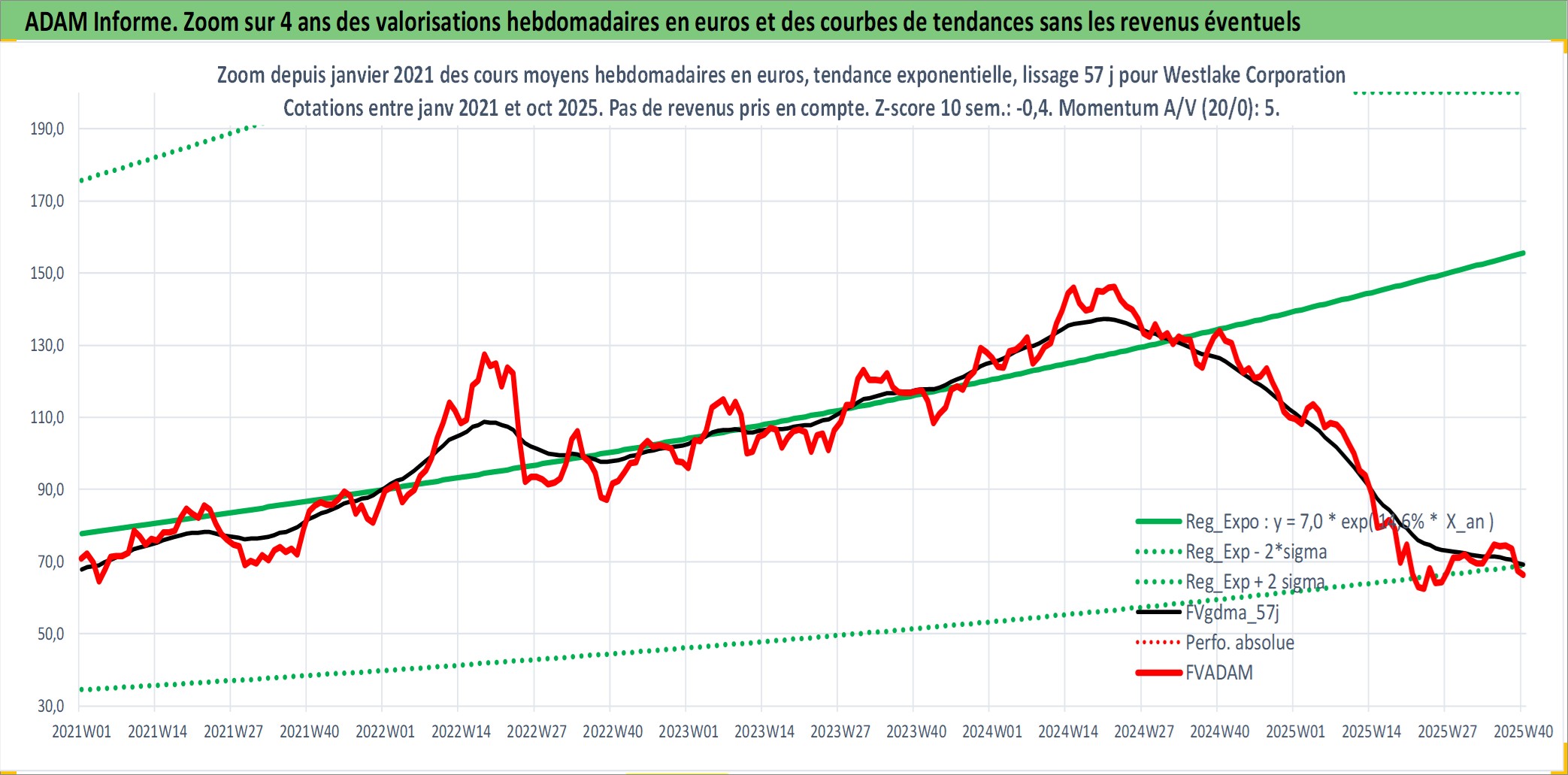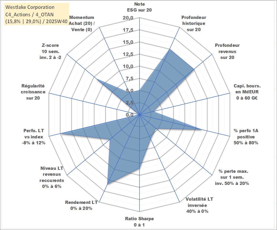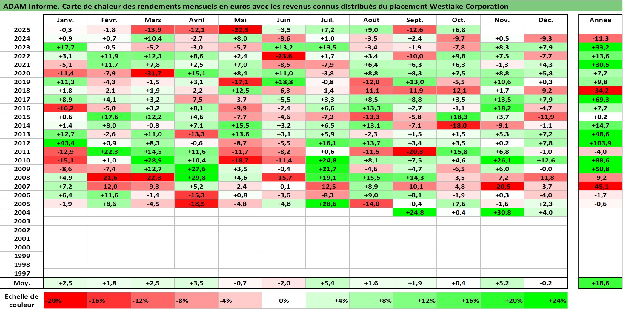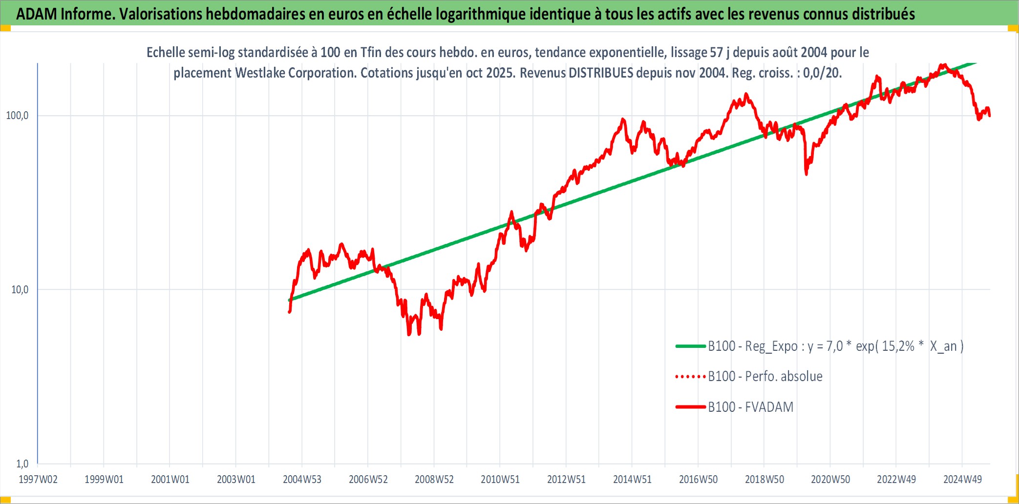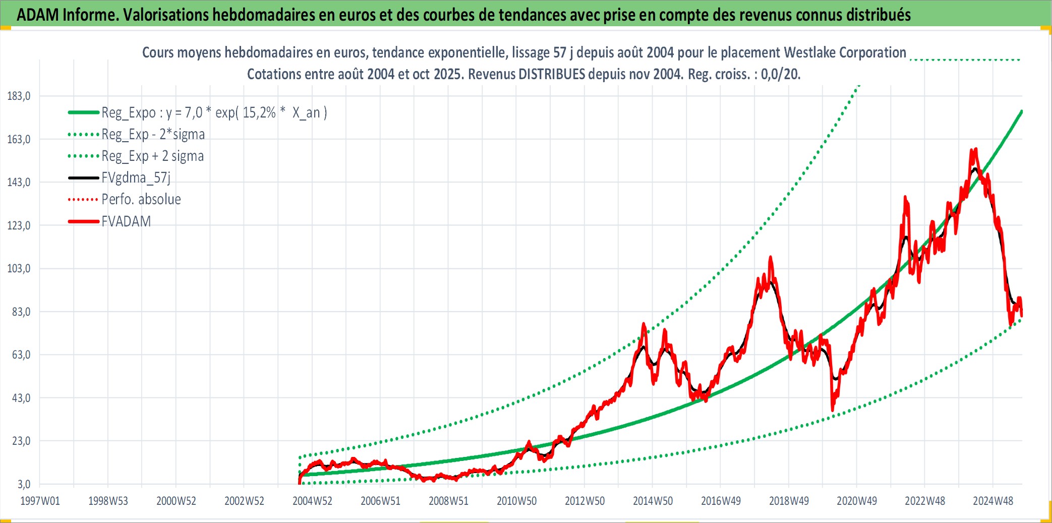 Site dédié aux investisseursPage dédiée sur site financeAnalyse des valorisations hebdomadaires de l'action Westlake Corporation. Cet actif est cote en USD. Les valorisations sont en contrevaleur EURO et couvrent les semaines 2004W33 a 2025W40. Les revenus de cet actif financier sont pris en compte depuis la semaine 2004W47. La note globale ESG de cet actif est estimee a 5.0 (apres rebasage entre 0 et 20).