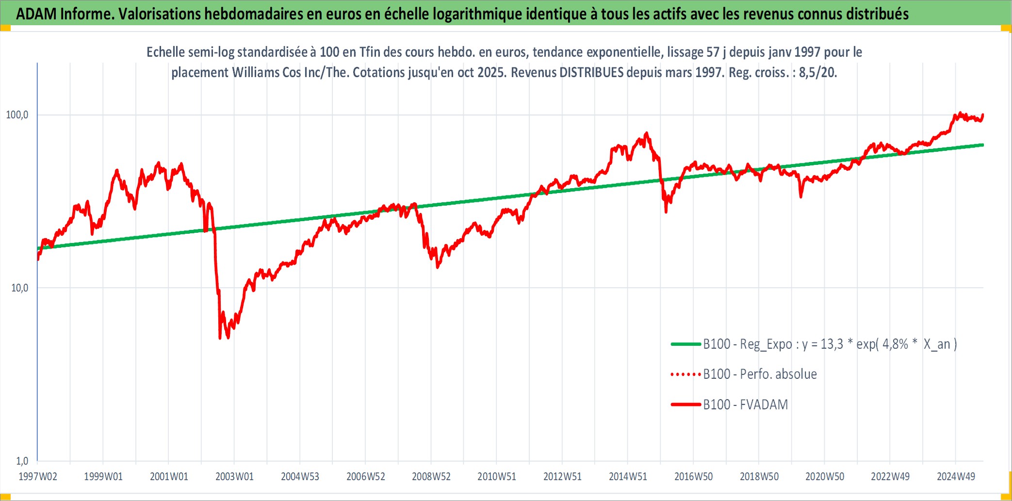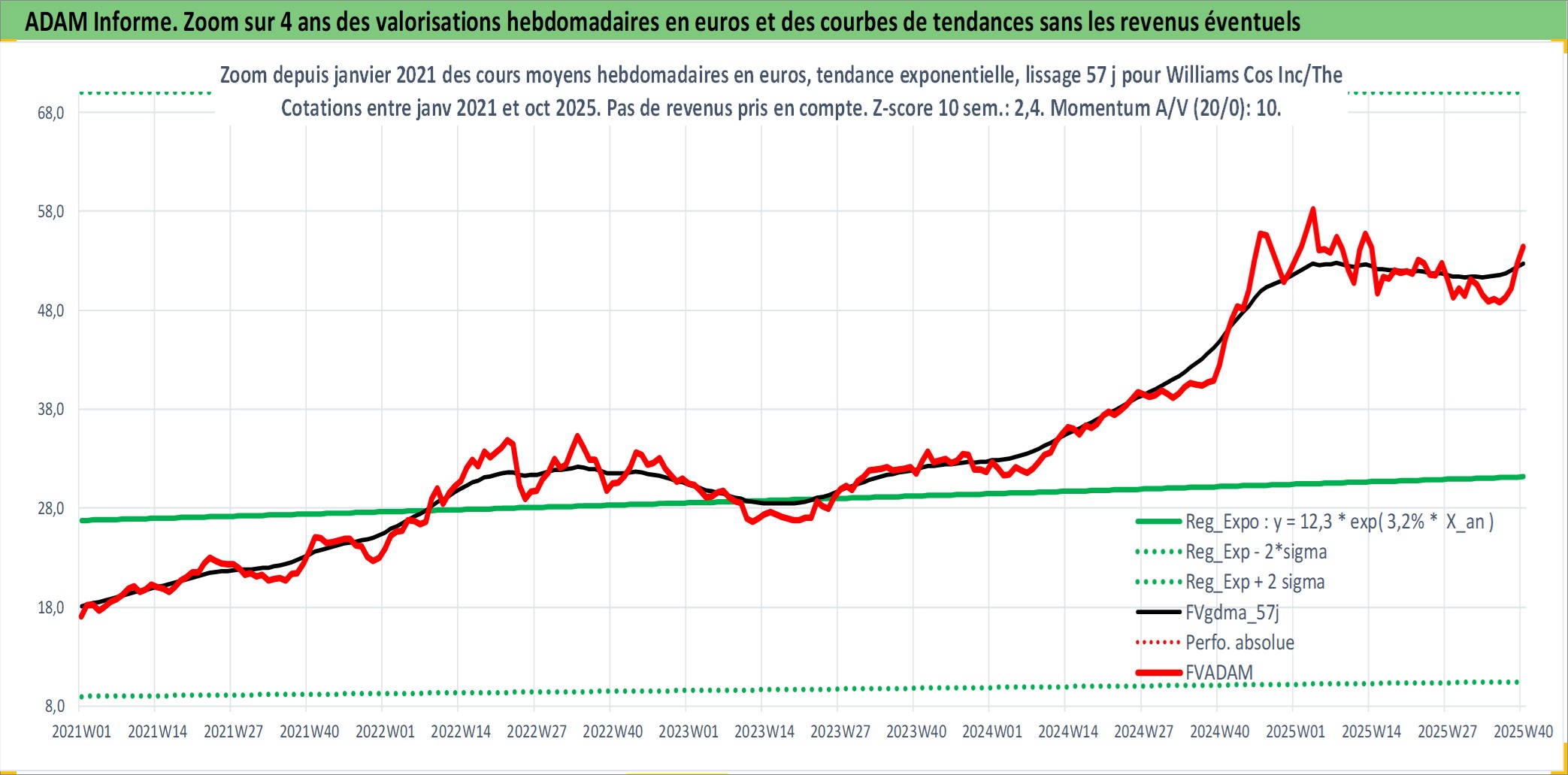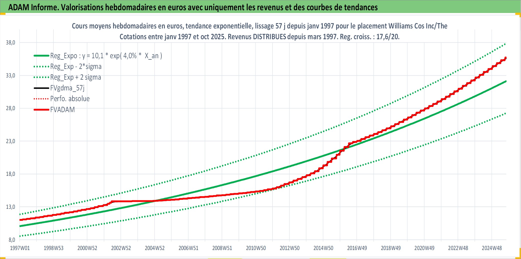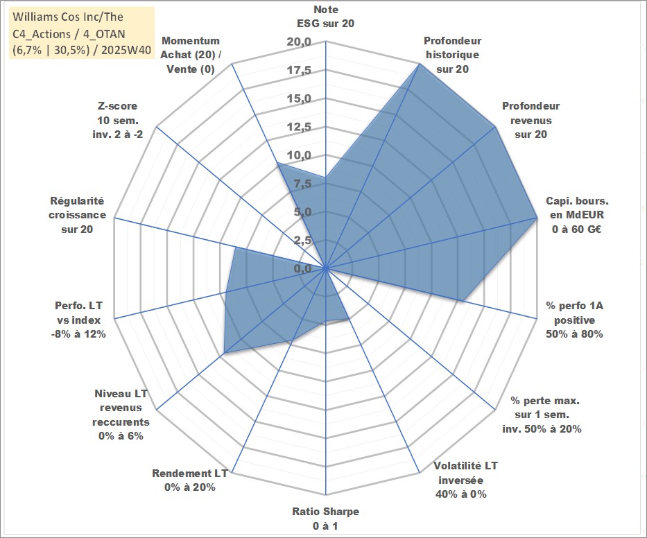 Site dédié aux investisseursPage dédiée sur site financeAnalyse des valorisations hebdomadaires de l'action Williams Cos Inc/The. Cet actif est cote en USD. Les valorisations sont en contrevaleur EURO et couvrent les semaines 1997W01 a 2025W40. Les revenus de cet actif financier sont pris en compte depuis la semaine 1997W10. La note globale ESG de cet actif est estimee a 8.0 (apres rebasage entre 0 et 20).