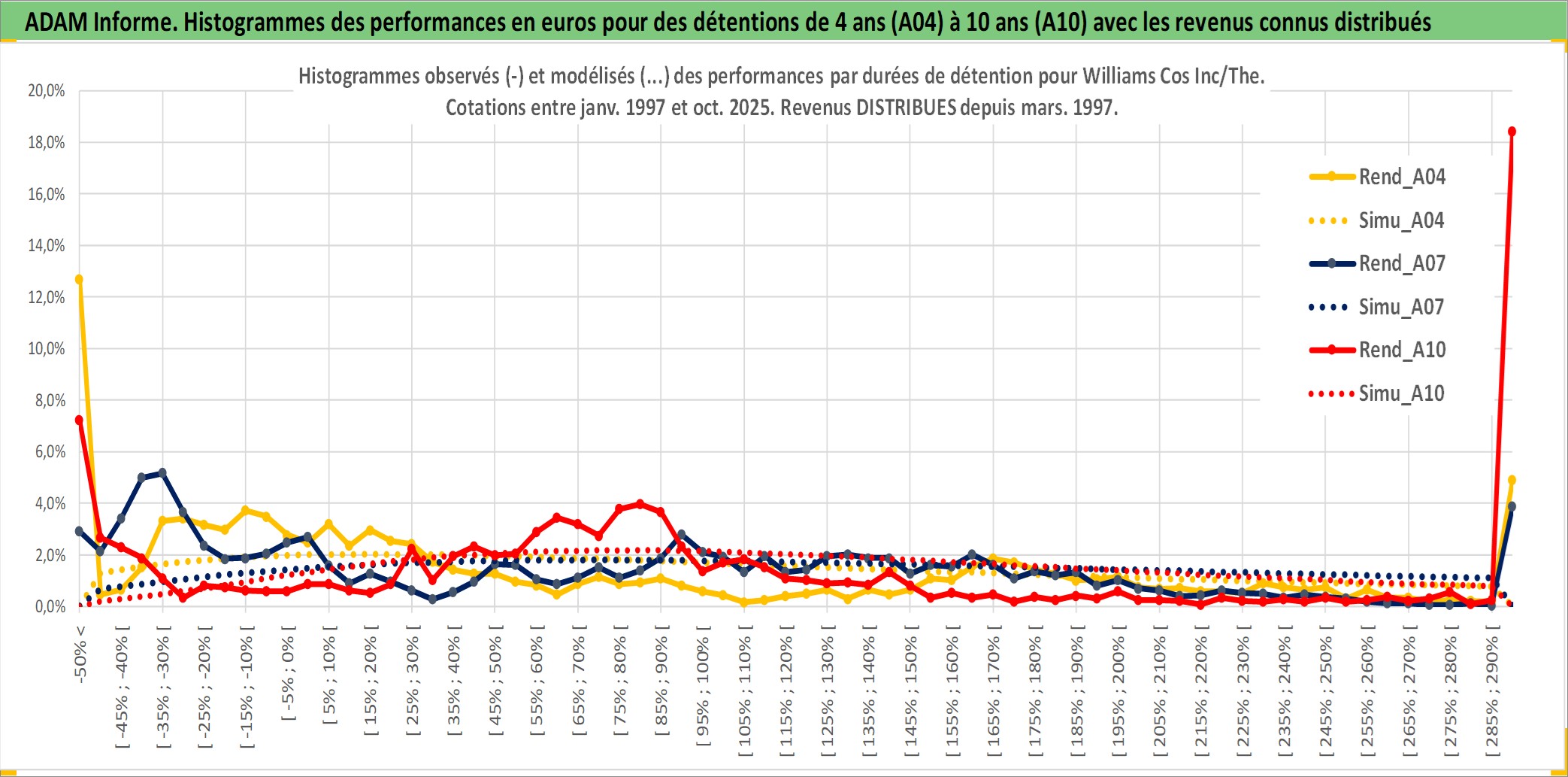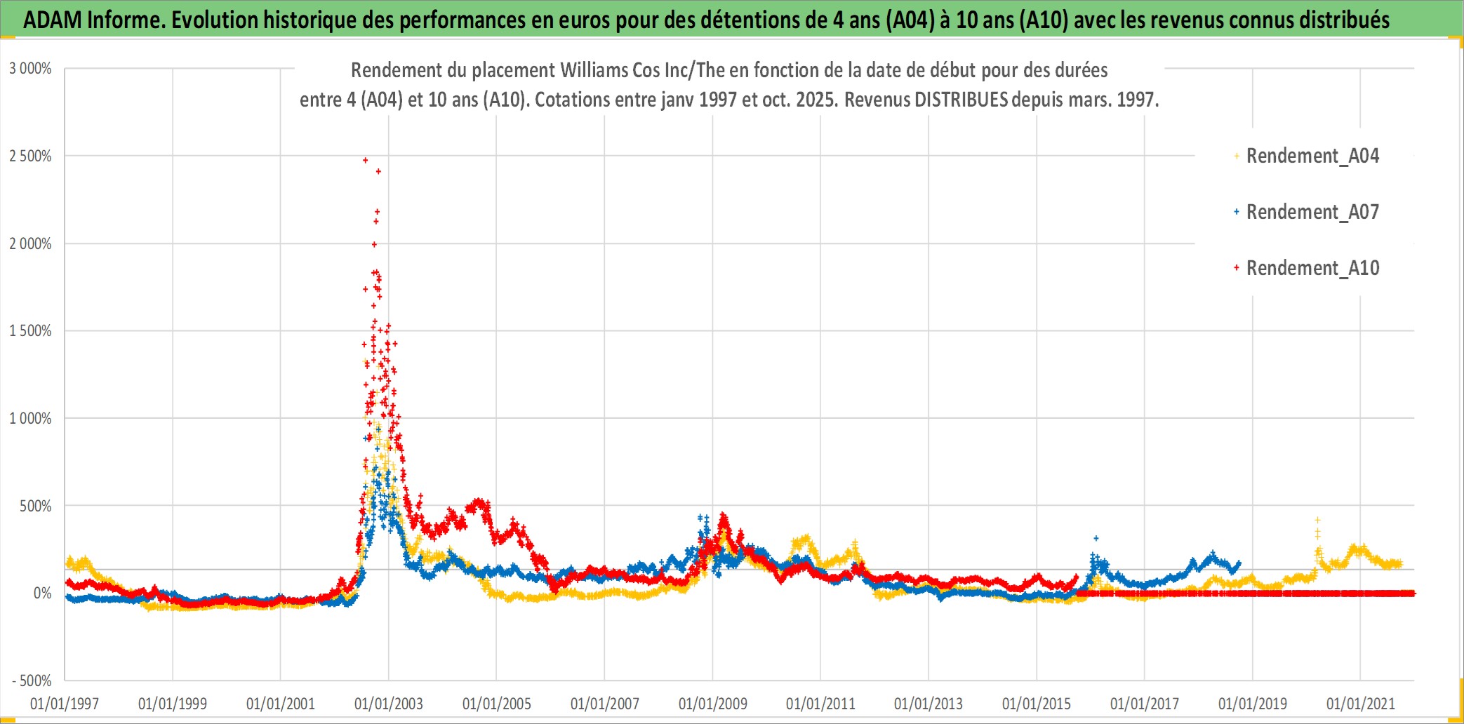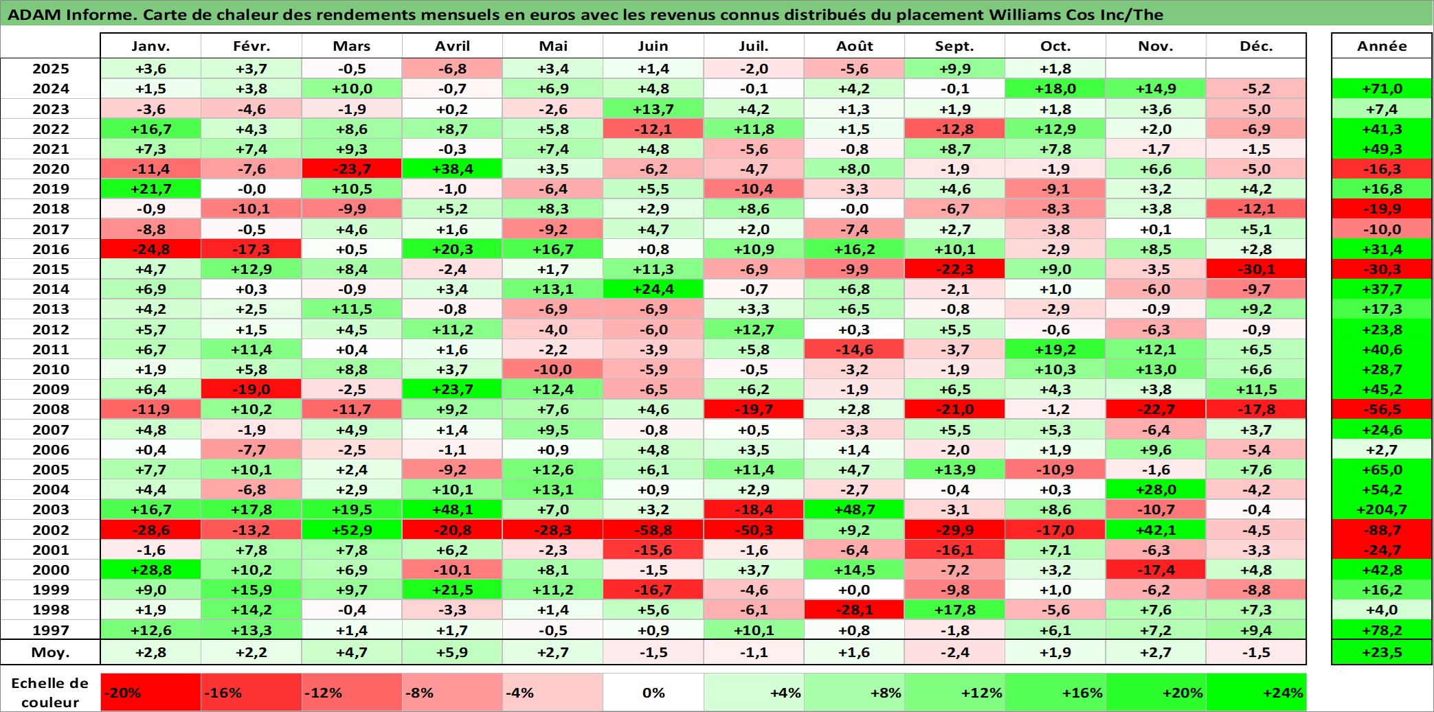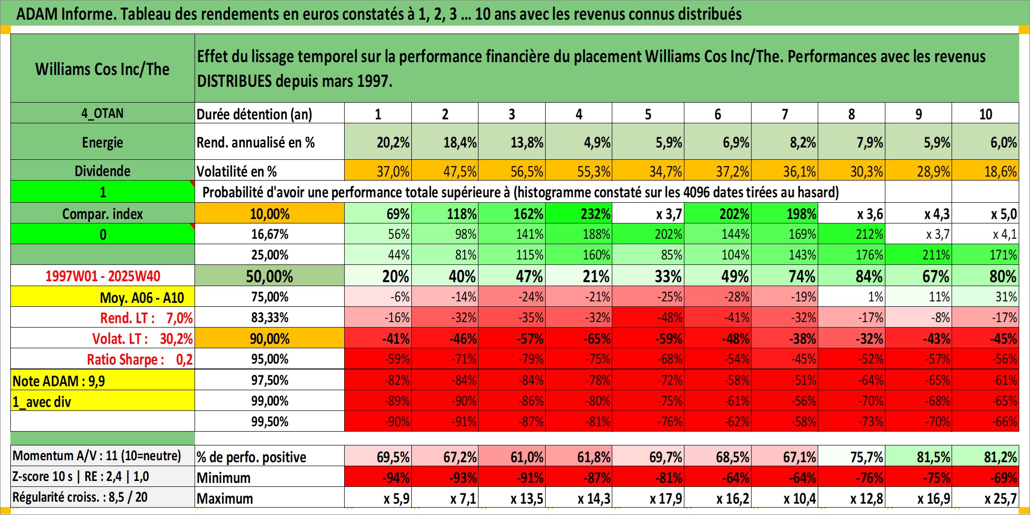 Site dédié aux investisseursPage dédiée sur site financeAnalyse des valorisations hebdomadaires de l'action Williams Cos Inc/The. Cet actif est cote en USD. Les valorisations sont en contrevaleur EURO et couvrent les semaines 1997W01 a 2025W40. Les revenus de cet actif financier sont pris en compte depuis la semaine 1997W10. La note globale ESG de cet actif est estimee a 8.0 (apres rebasage entre 0 et 20).