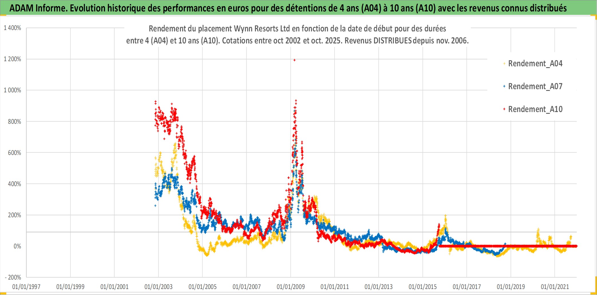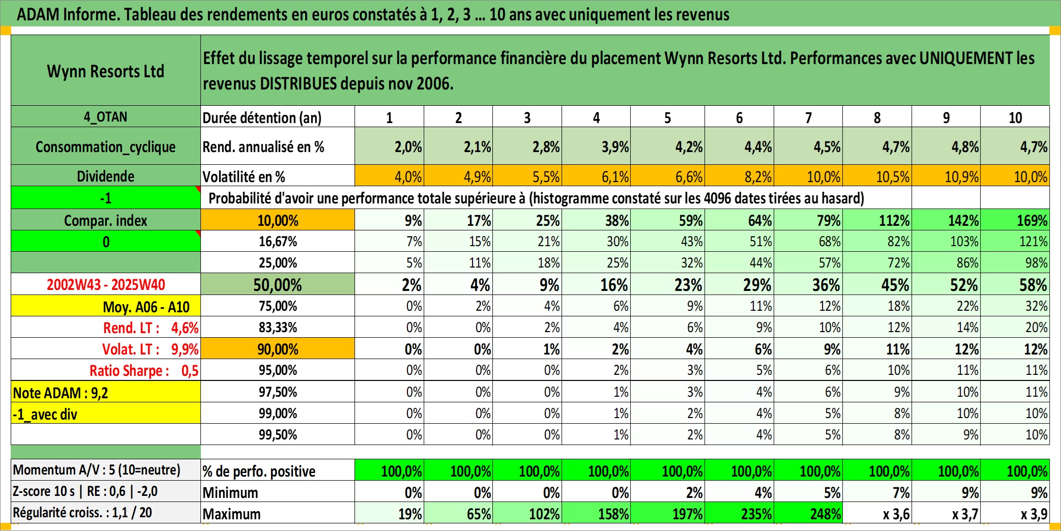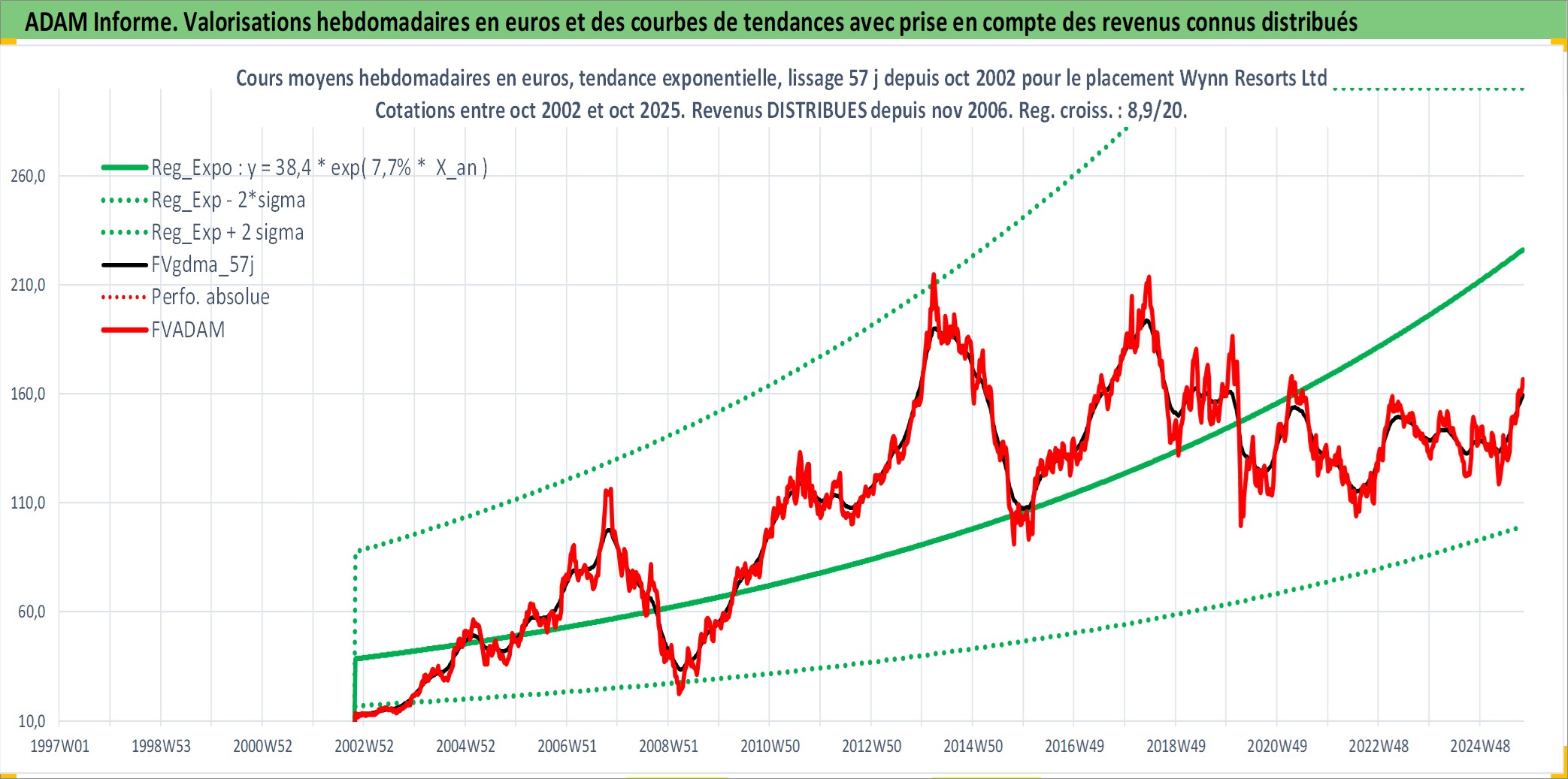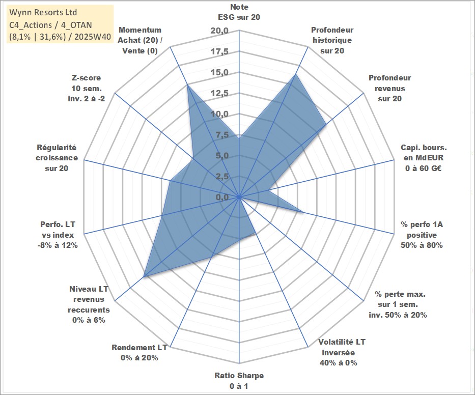 Site dédié aux investisseursPage dédiée sur site financeAnalyse des valorisations hebdomadaires de l'action Wynn Resorts Ltd. Cet actif est cote en USD. Les valorisations sont en contrevaleur EURO et couvrent les semaines 2002W43 a 2025W40. Les revenus de cet actif financier sont pris en compte depuis la semaine 2006W47. La note globale ESG de cet actif est estimee a 7.0 (apres rebasage entre 0 et 20).