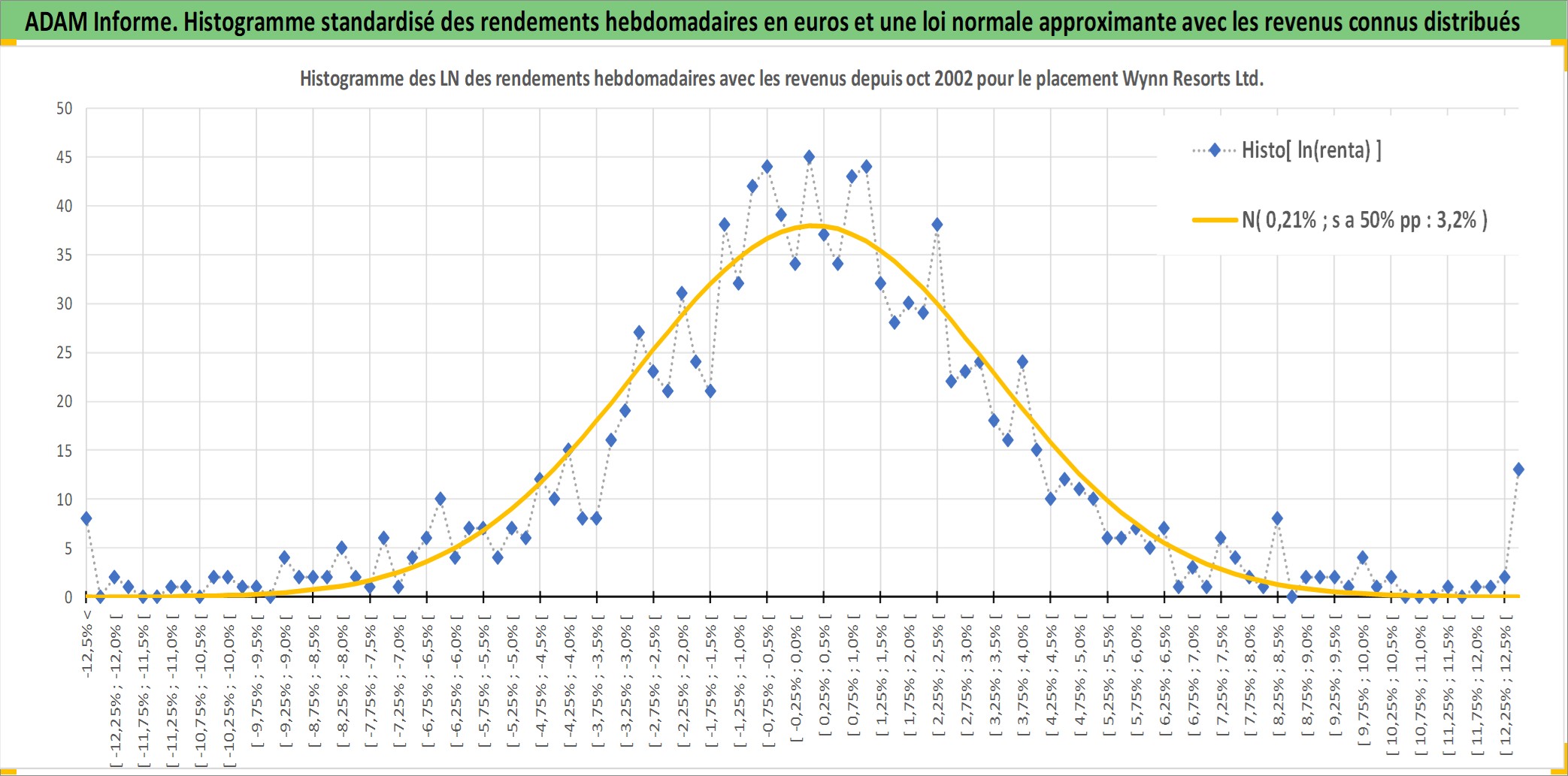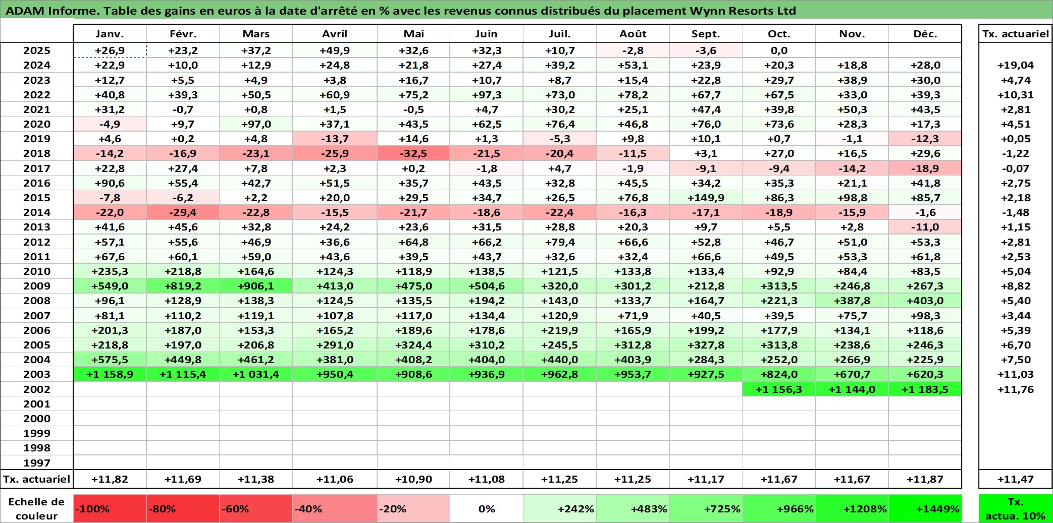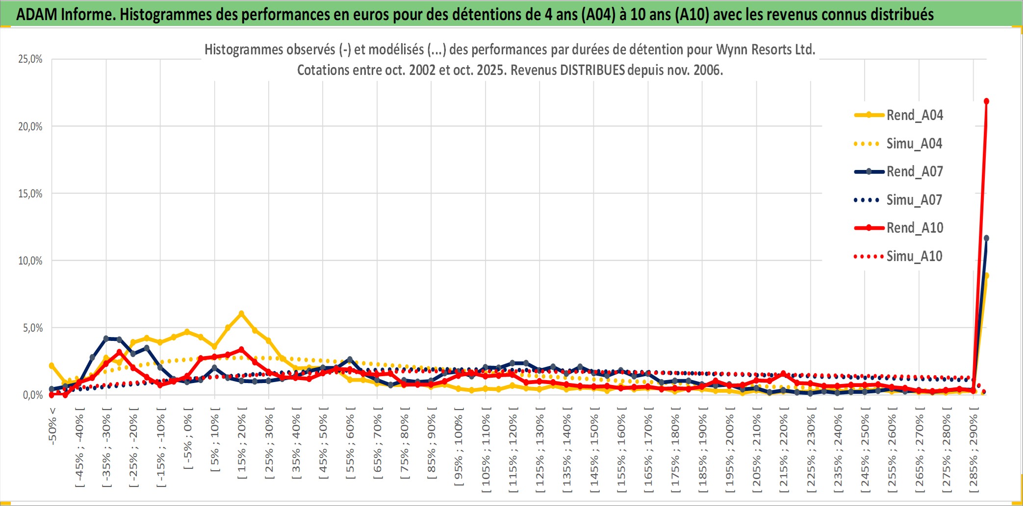 Site dédié aux investisseursPage dédiée sur site financeAnalyse des valorisations hebdomadaires de l'action Wynn Resorts Ltd. Cet actif est cote en USD. Les valorisations sont en contrevaleur EURO et couvrent les semaines 2002W43 a 2025W40. Les revenus de cet actif financier sont pris en compte depuis la semaine 2006W47. La note globale ESG de cet actif est estimee a 7.0 (apres rebasage entre 0 et 20).