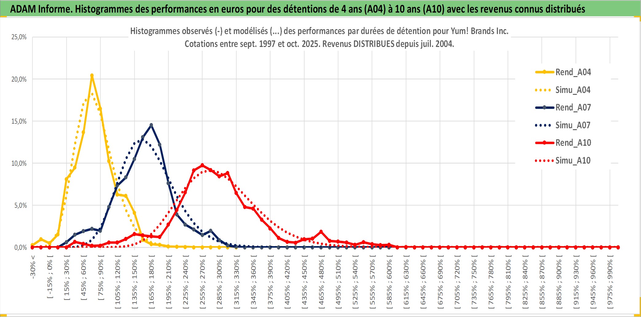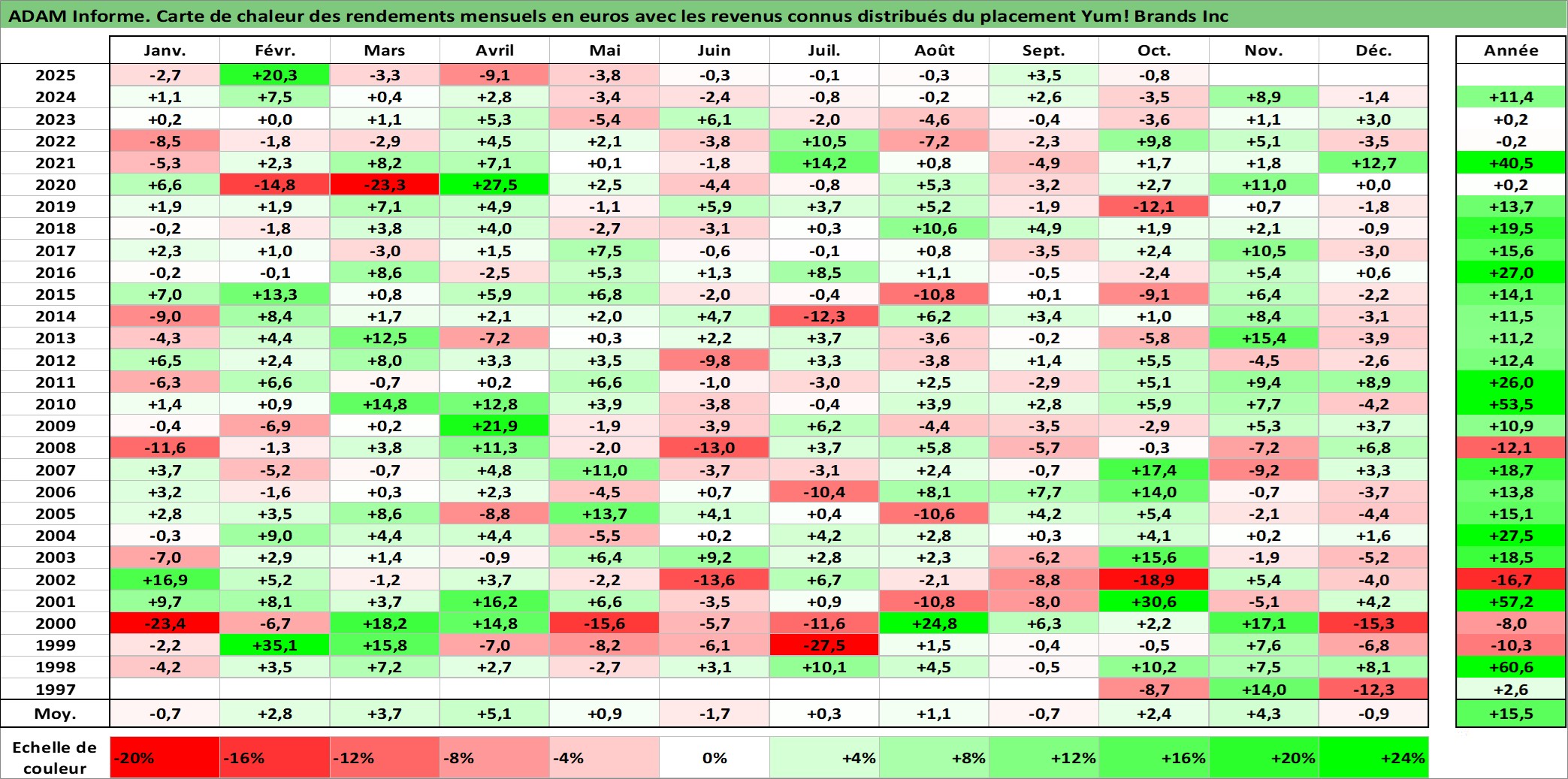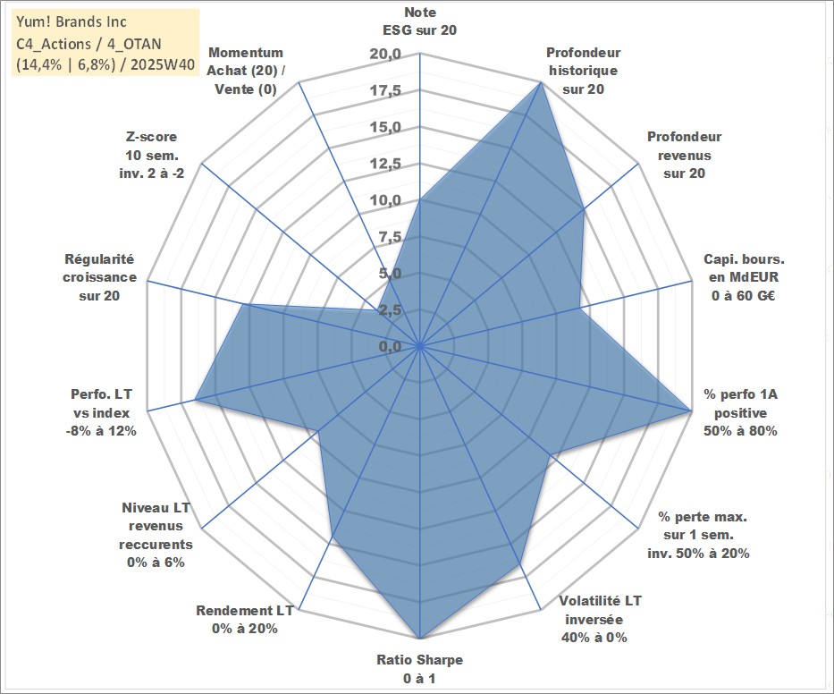 Site dédié aux investisseursPage dédiée sur site financeAnalyse des valorisations hebdomadaires de l'action Yum! Brands Inc. Cet actif est cote en USD. Les valorisations sont en contrevaleur EURO et couvrent les semaines 1997W38 a 2025W40. Les revenus de cet actif financier sont pris en compte depuis la semaine 2004W29. La note globale ESG de cet actif est estimee a 10.0 (apres rebasage entre 0 et 20).