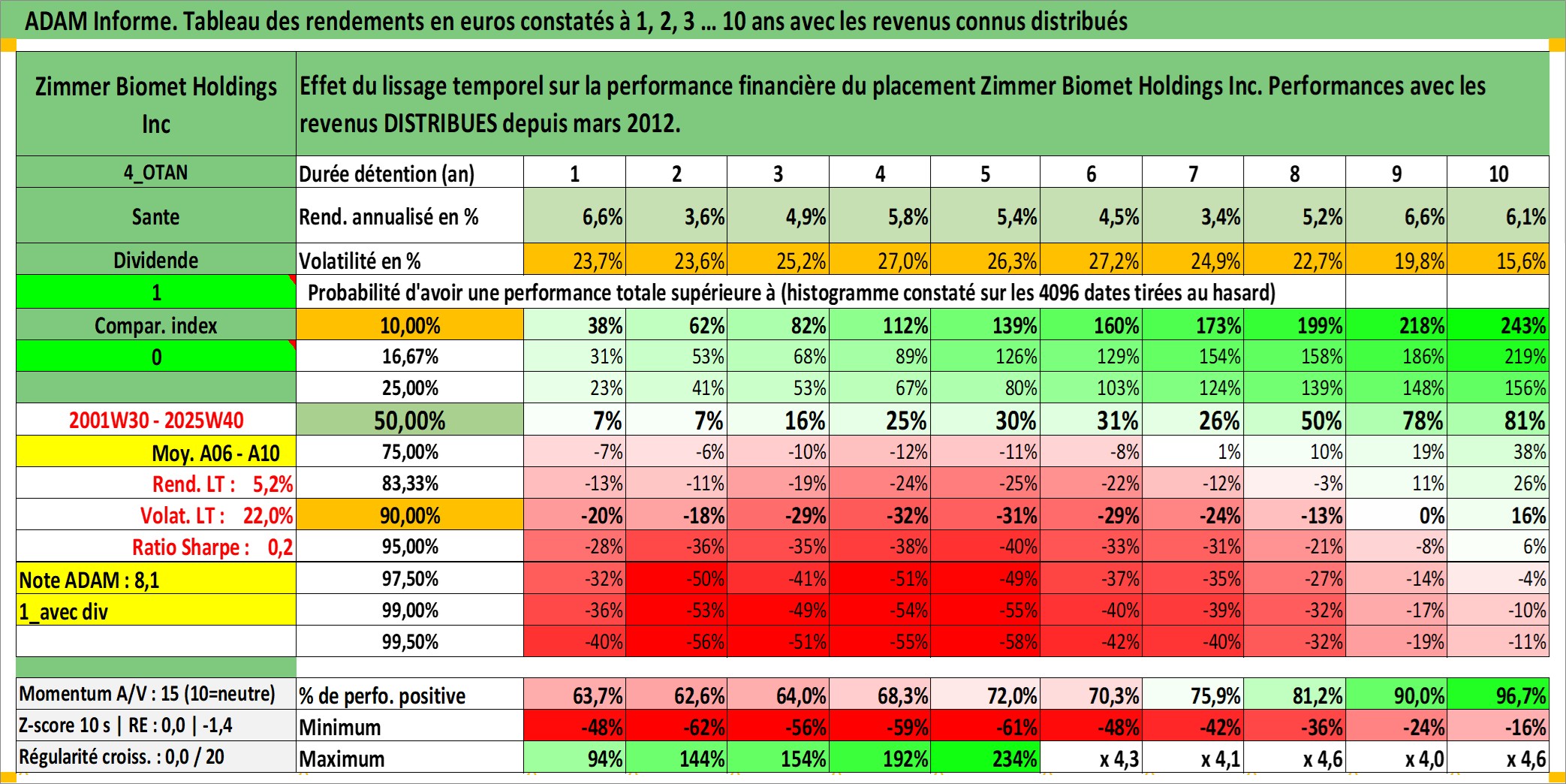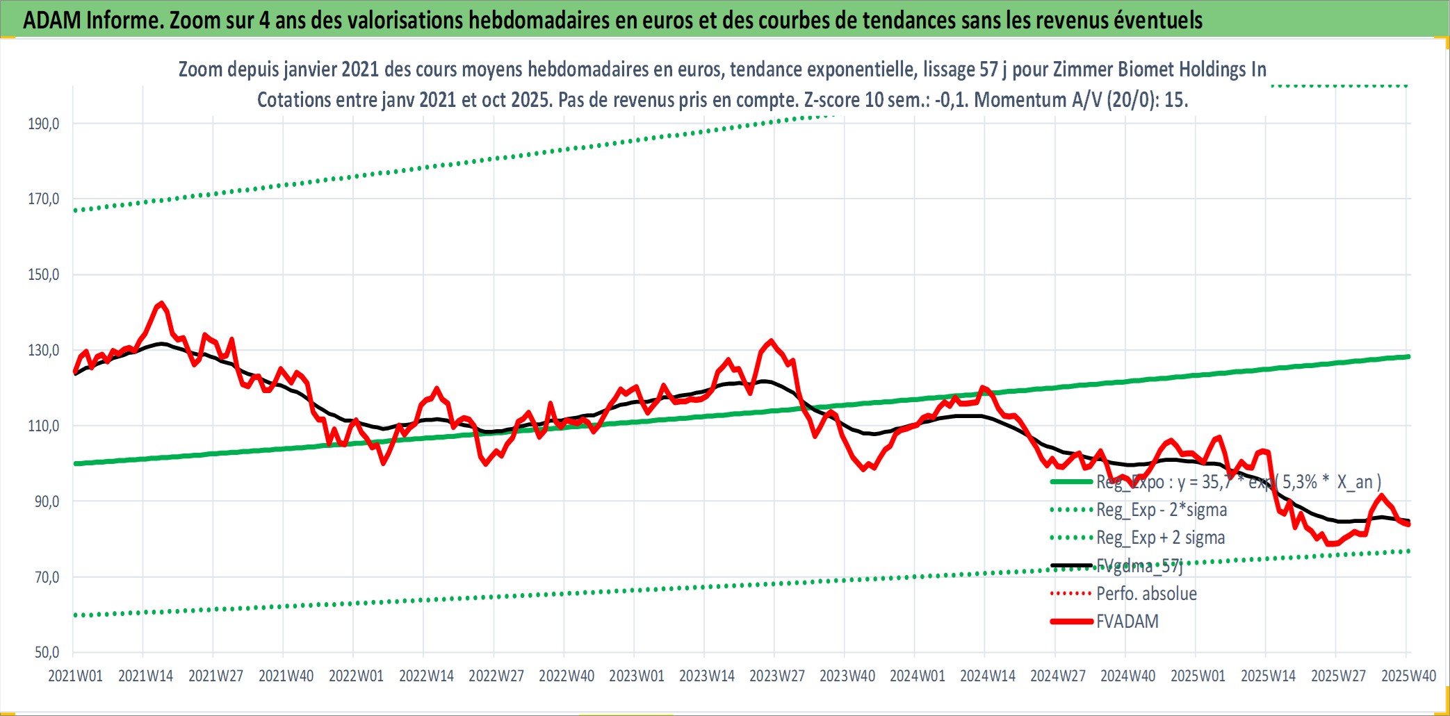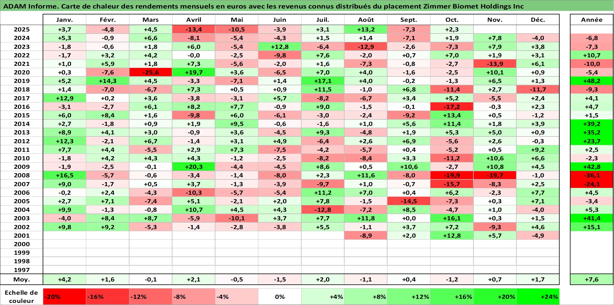 Site dédié aux investisseursPage dédiée sur site financeAnalyse des valorisations hebdomadaires de l'action Zimmer Biomet Holdings Inc. Cet actif est cote en USD. Les valorisations sont en contrevaleur EURO et couvrent les semaines 2001W30 a 2025W40. Les revenus de cet actif financier sont pris en compte depuis la semaine 2012W13. La note globale ESG de cet actif est estimee a 7.0 (apres rebasage entre 0 et 20).