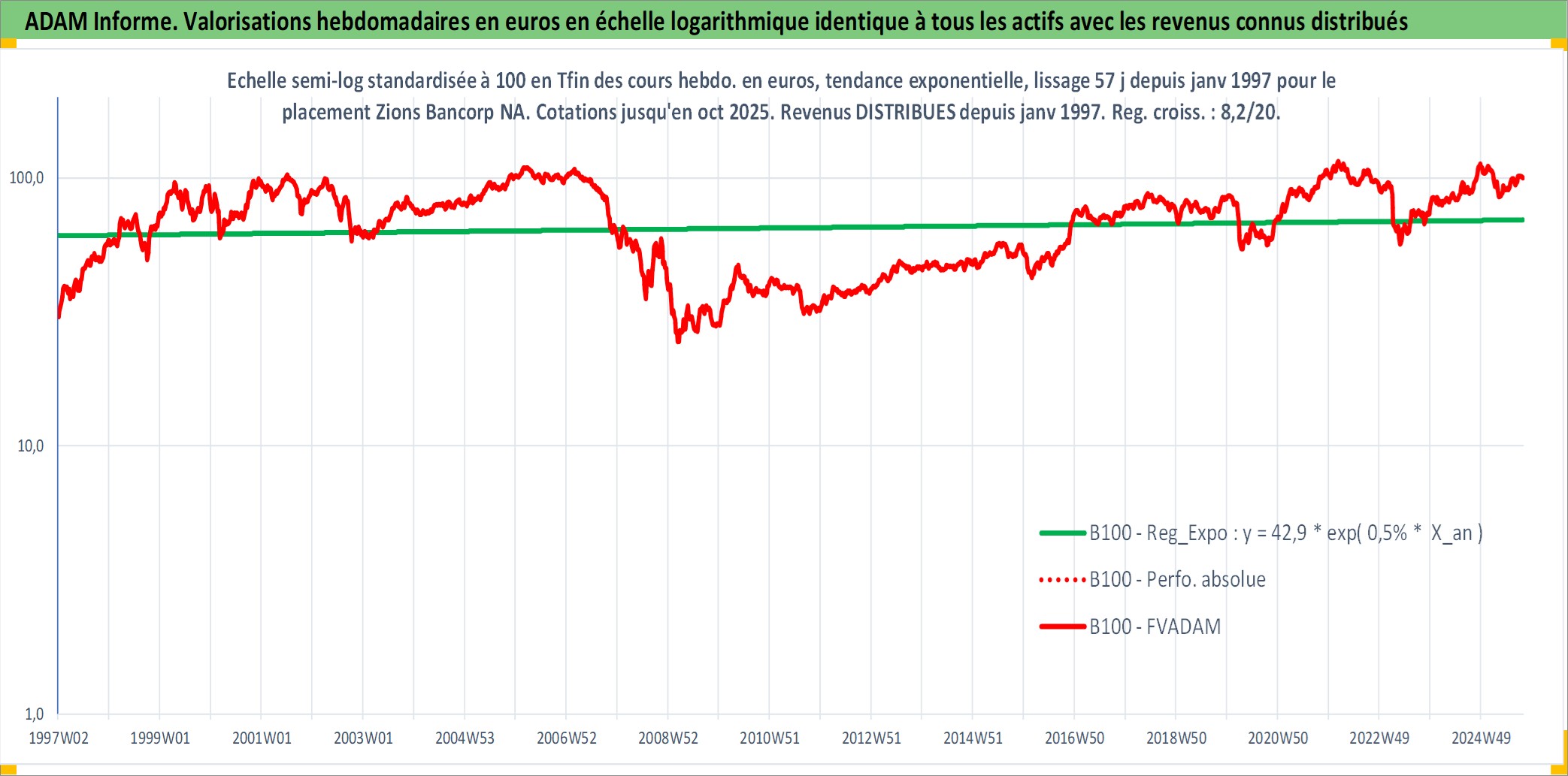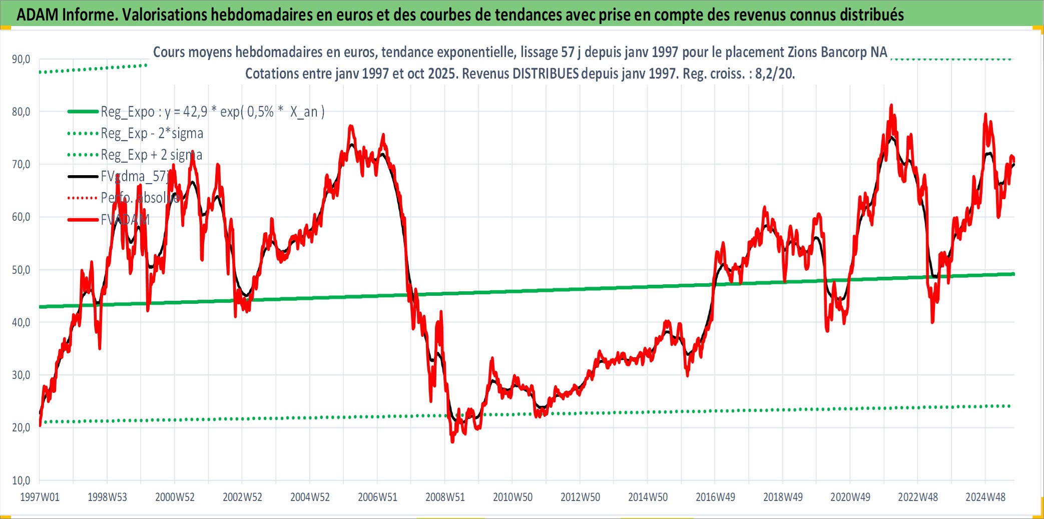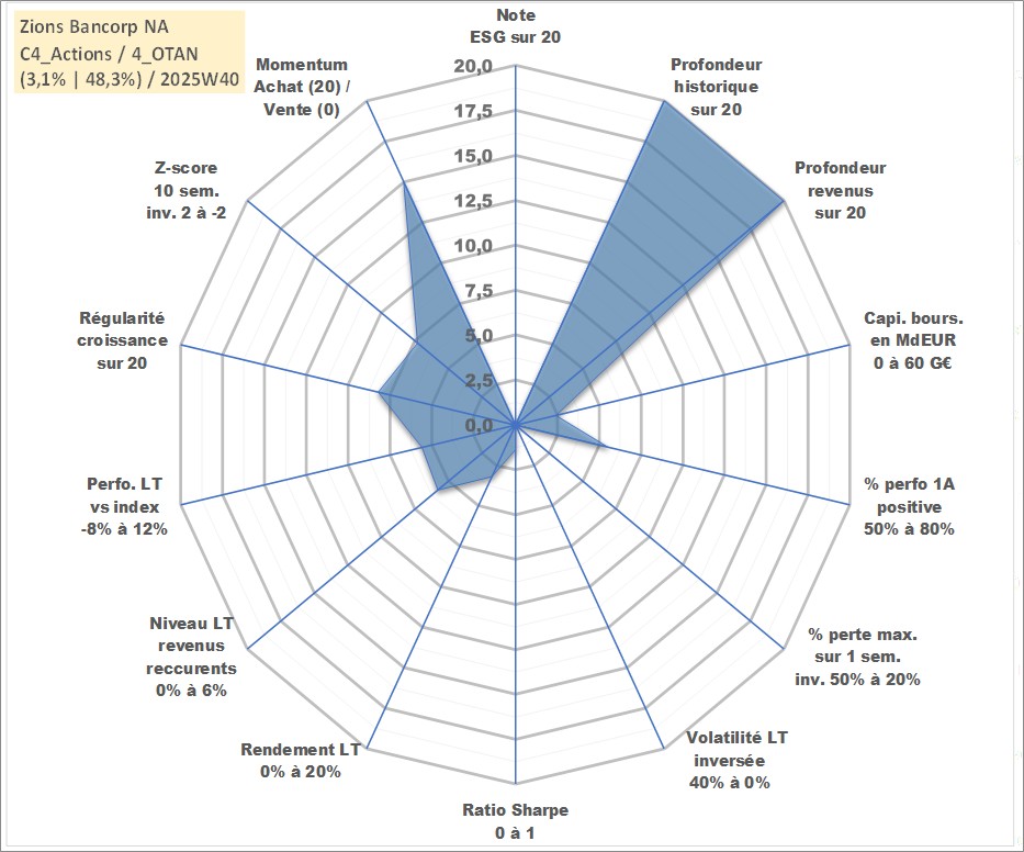 Site dédié aux investisseursPage dédiée sur site financeAnalyse des valorisations hebdomadaires de l'action Zions Bancorp NA. Cet actif est cote en USD. Les valorisations sont en contrevaleur EURO et couvrent les semaines 1997W01 a 2025W40. Les revenus de cet actif financier sont pris en compte depuis la semaine 1997W01. La note ESG de cet actif n'est pas connue.