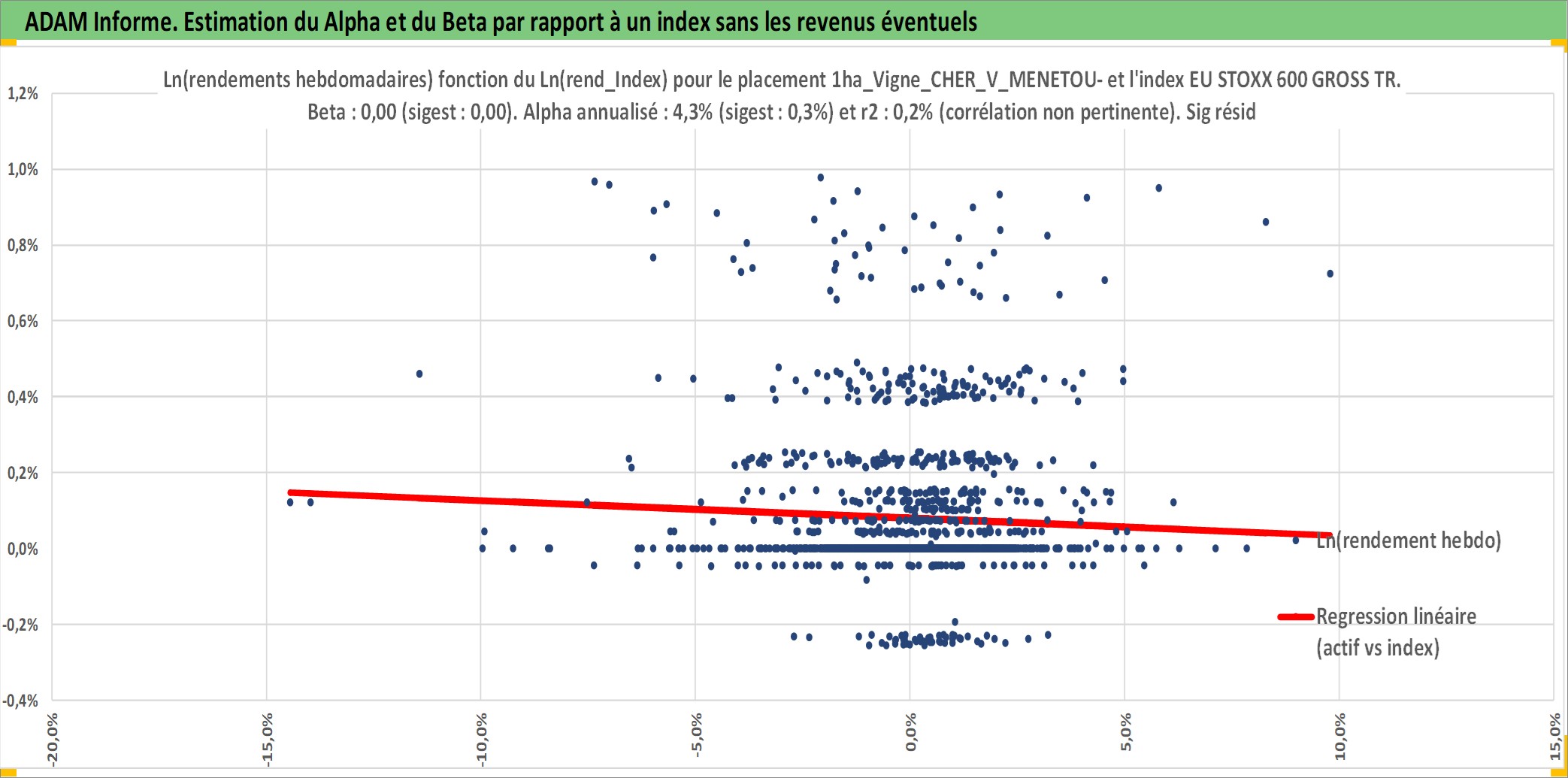Site dédié aux investisseursPage dédiée sur site financeAnalyse des valorisations hebdomadaires de l'actif 1ha_Vigne_CHER_V_MENETOU-SALON. Cet actif est cote en EUR. Les valorisations couvrent les semaines 1997W01 a 2025W40. Les fermages de ce bien foncier sont pris egaux a 2,5% annuels de la valeur venale du bien.
