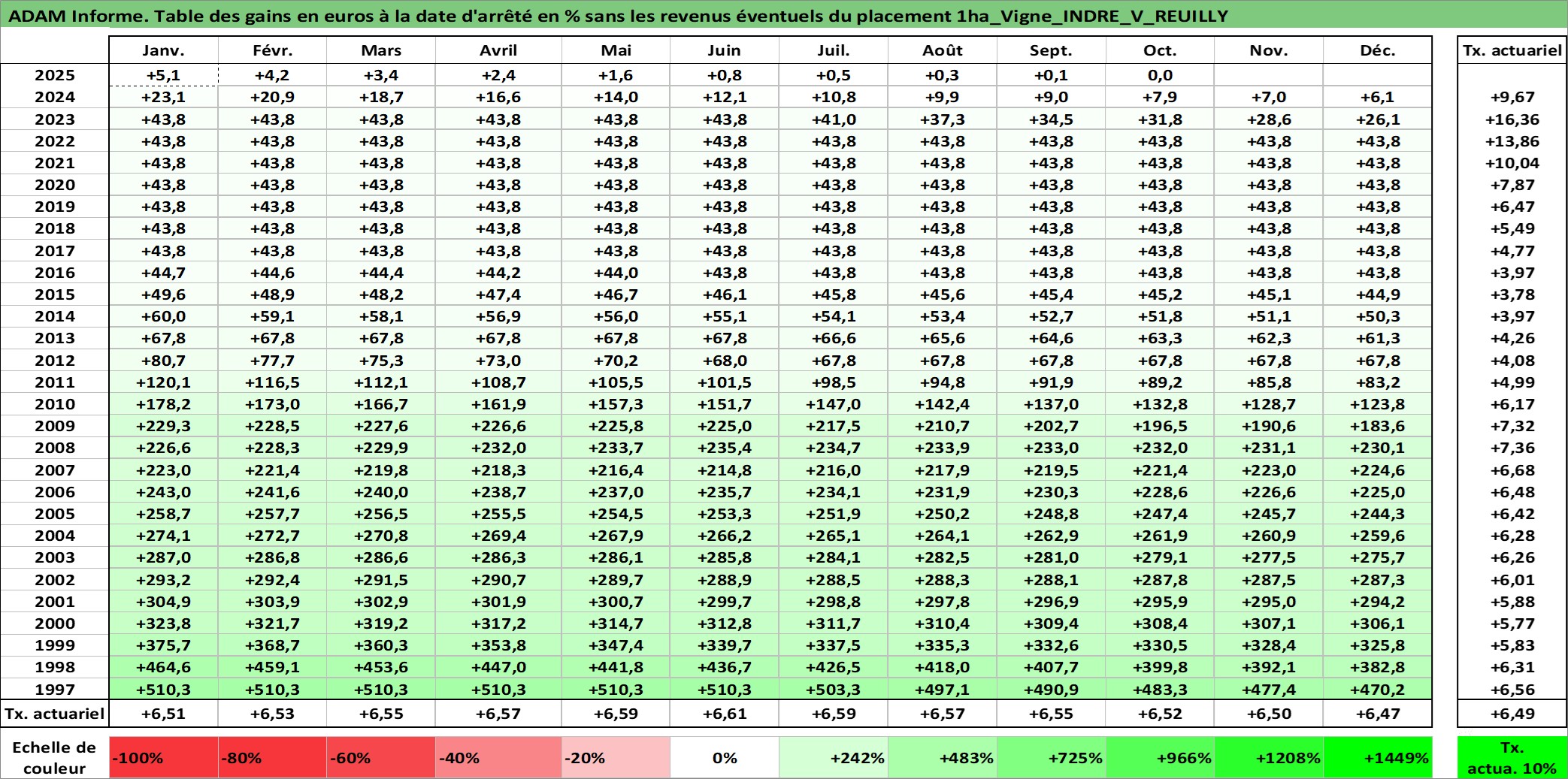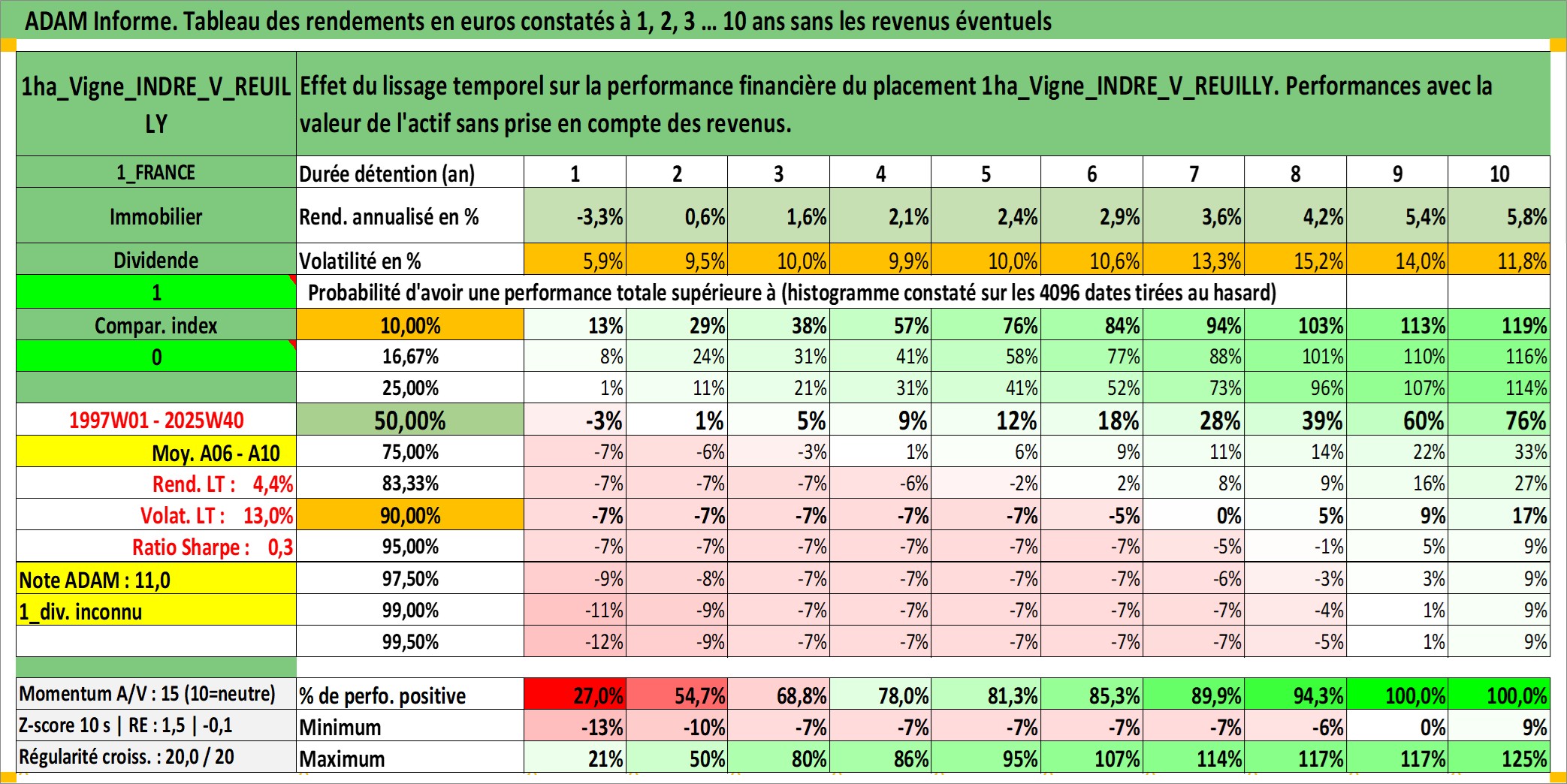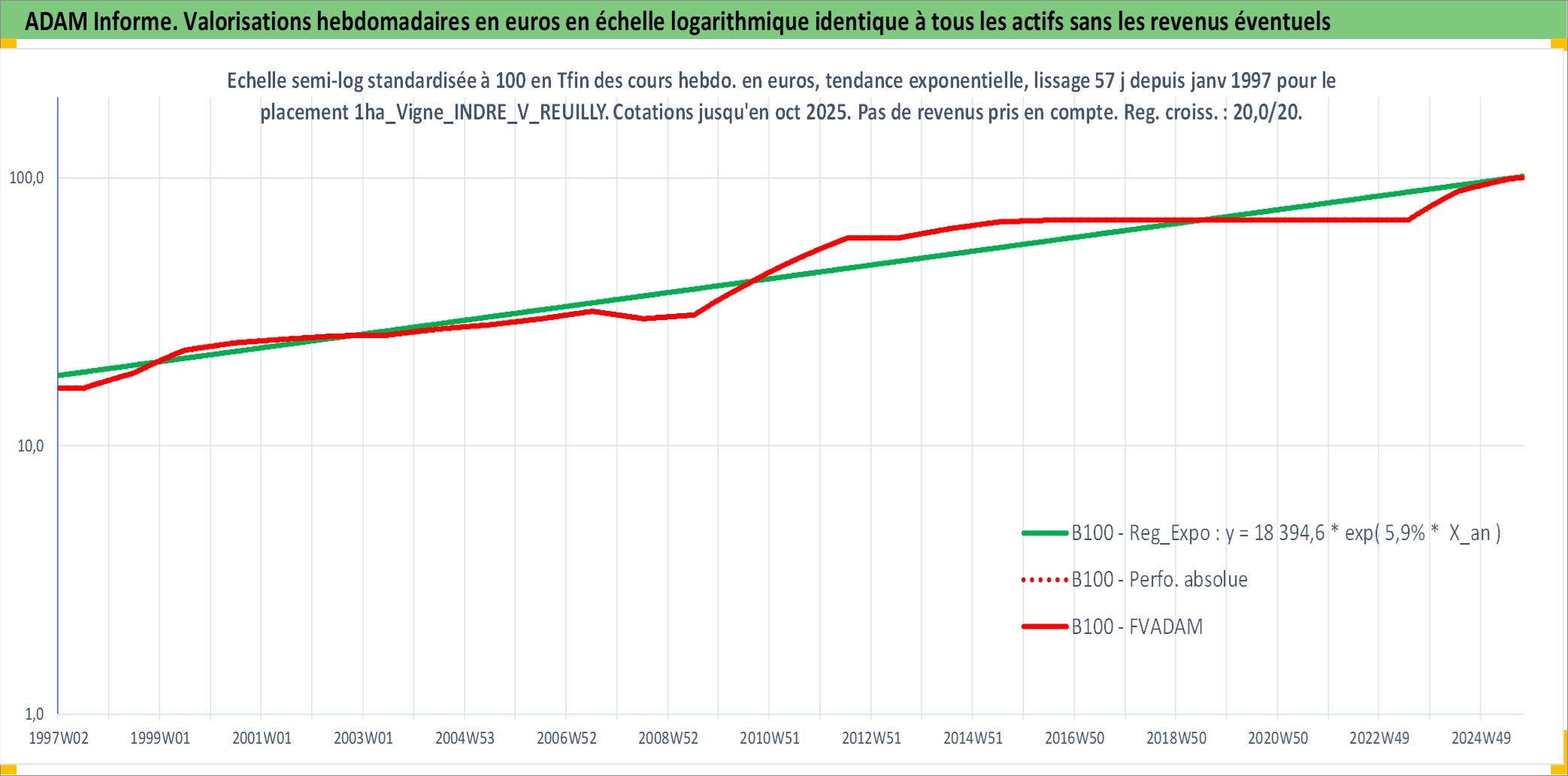 Site dédié aux investisseursPage dédiée sur site financeAnalyse des valorisations hebdomadaires de l'actif 1ha_Vigne_INDRE_V_REUILLY. Cet actif est cote en EUR. Les valorisations couvrent les semaines 1997W01 a 2025W40. Les fermages de ce bien foncier sont pris egaux a 2,5% annuels de la valeur venale du bien.