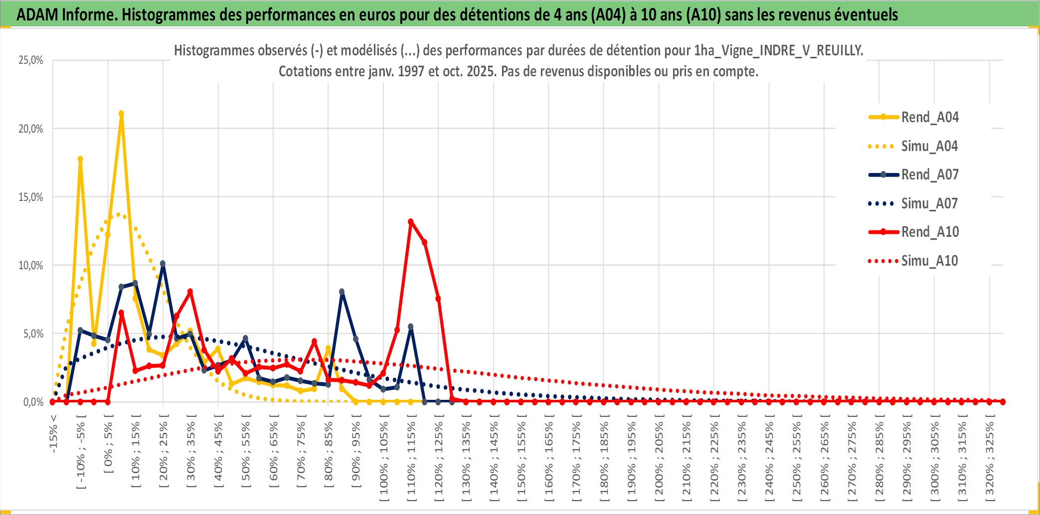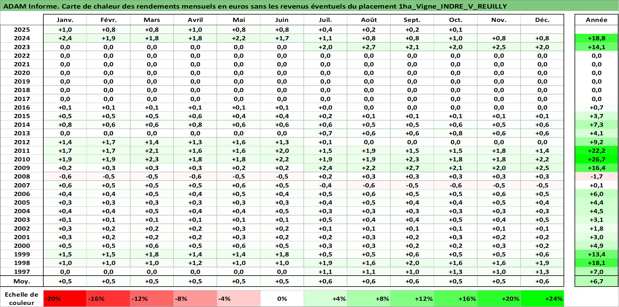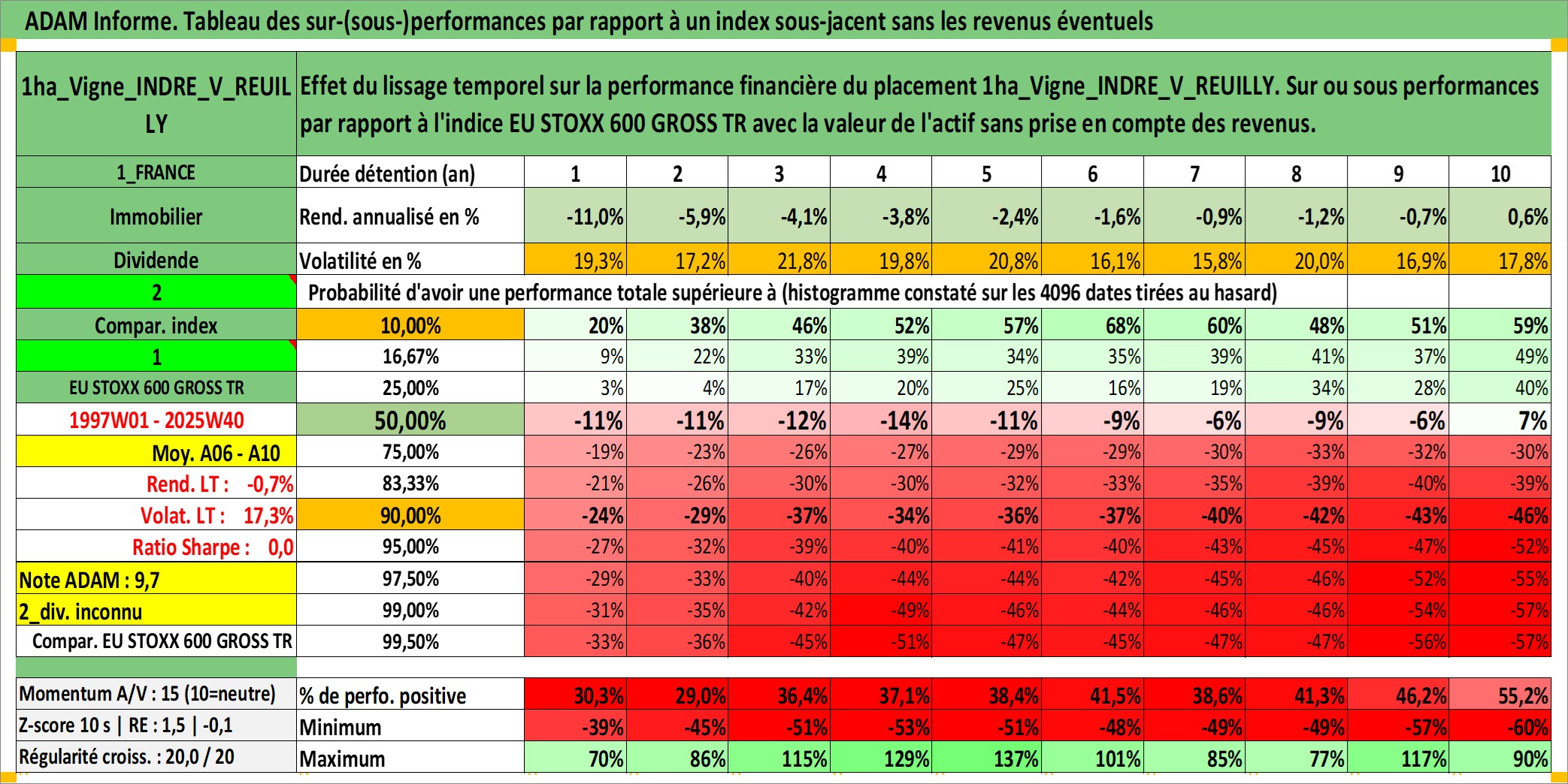 Site dédié aux investisseursPage dédiée sur site financeAnalyse des valorisations hebdomadaires de l'actif 1ha_Vigne_INDRE_V_REUILLY. Cet actif est cote en EUR. Les valorisations couvrent les semaines 1997W01 a 2025W40. Les fermages de ce bien foncier sont pris egaux a 2,5% annuels de la valeur venale du bien.
