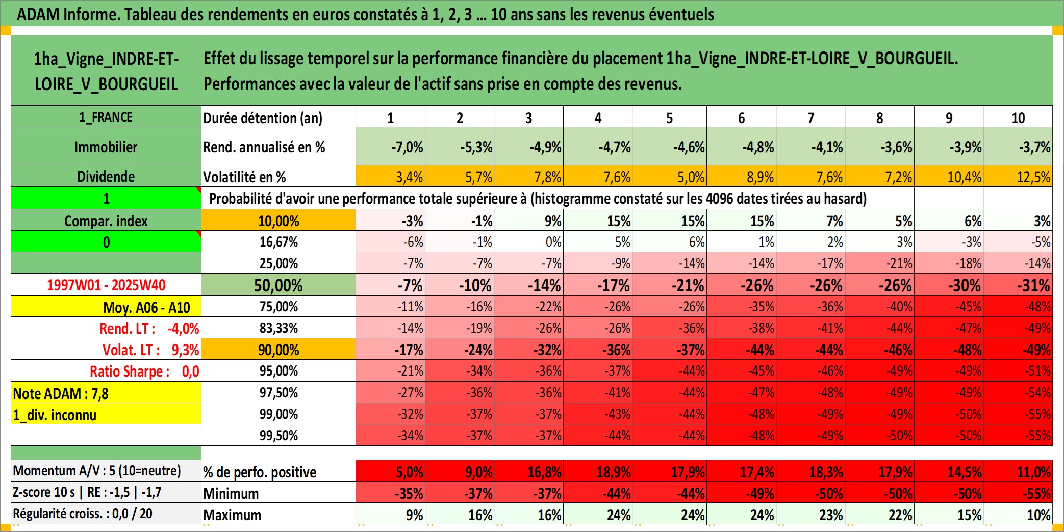 Site dédié aux investisseursPage dédiée sur site financeAnalyse des valorisations hebdomadaires de l'actif 1ha_Vigne_INDRE-ET-LOIRE_V_BOURGUEIL. Cet actif est cote en EUR. Les valorisations couvrent les semaines 1997W01 a 2025W40. Les fermages de ce bien foncier sont pris egaux a 2,5% annuels de la valeur venale du bien.
