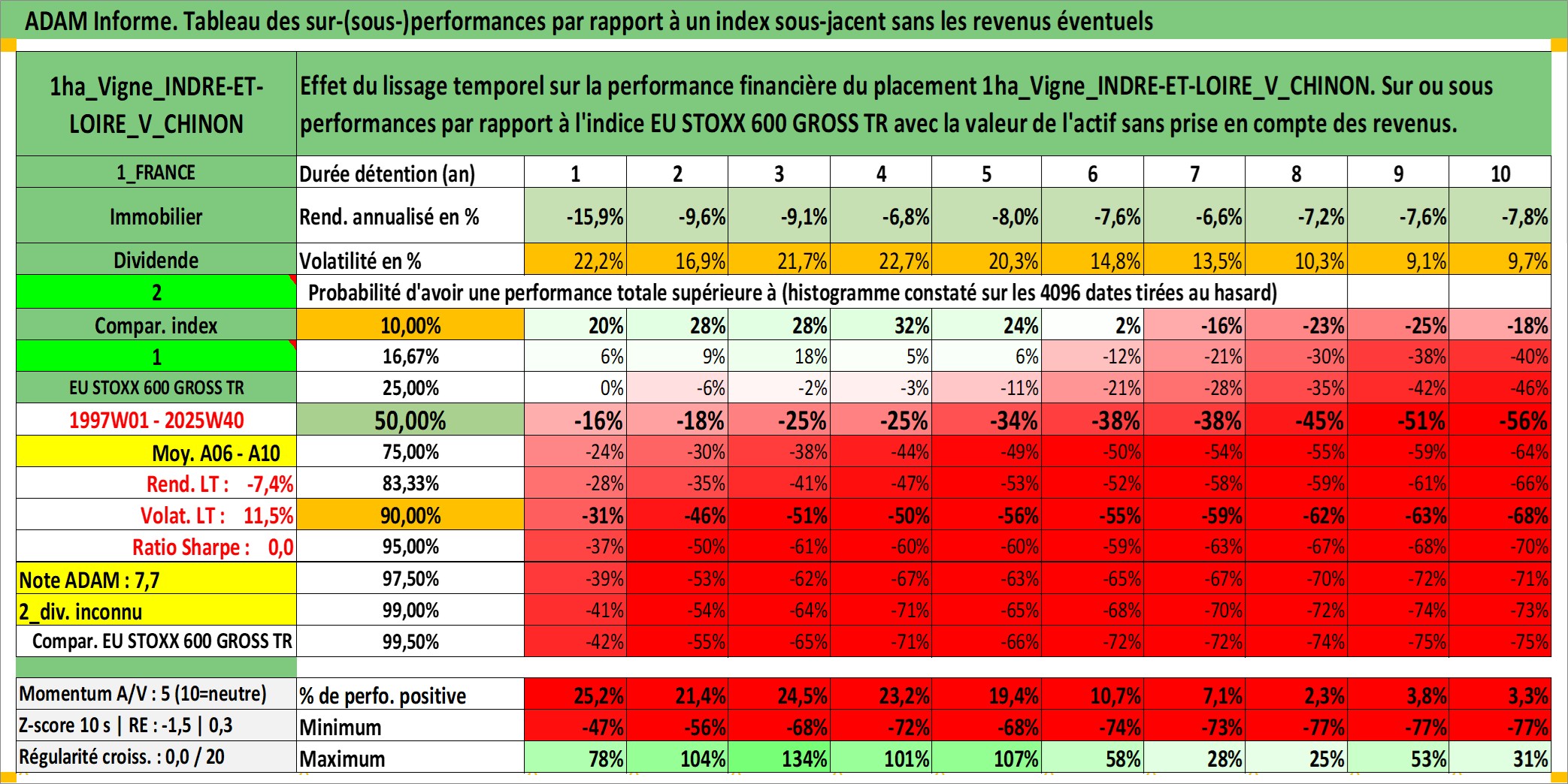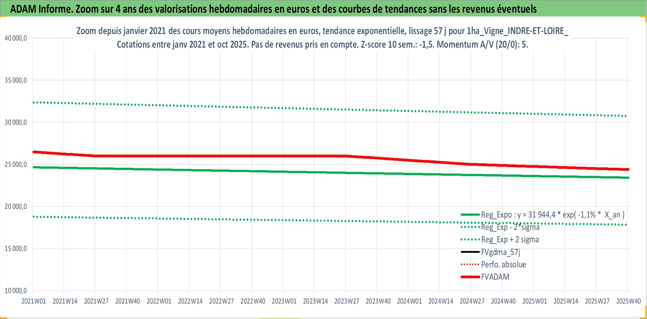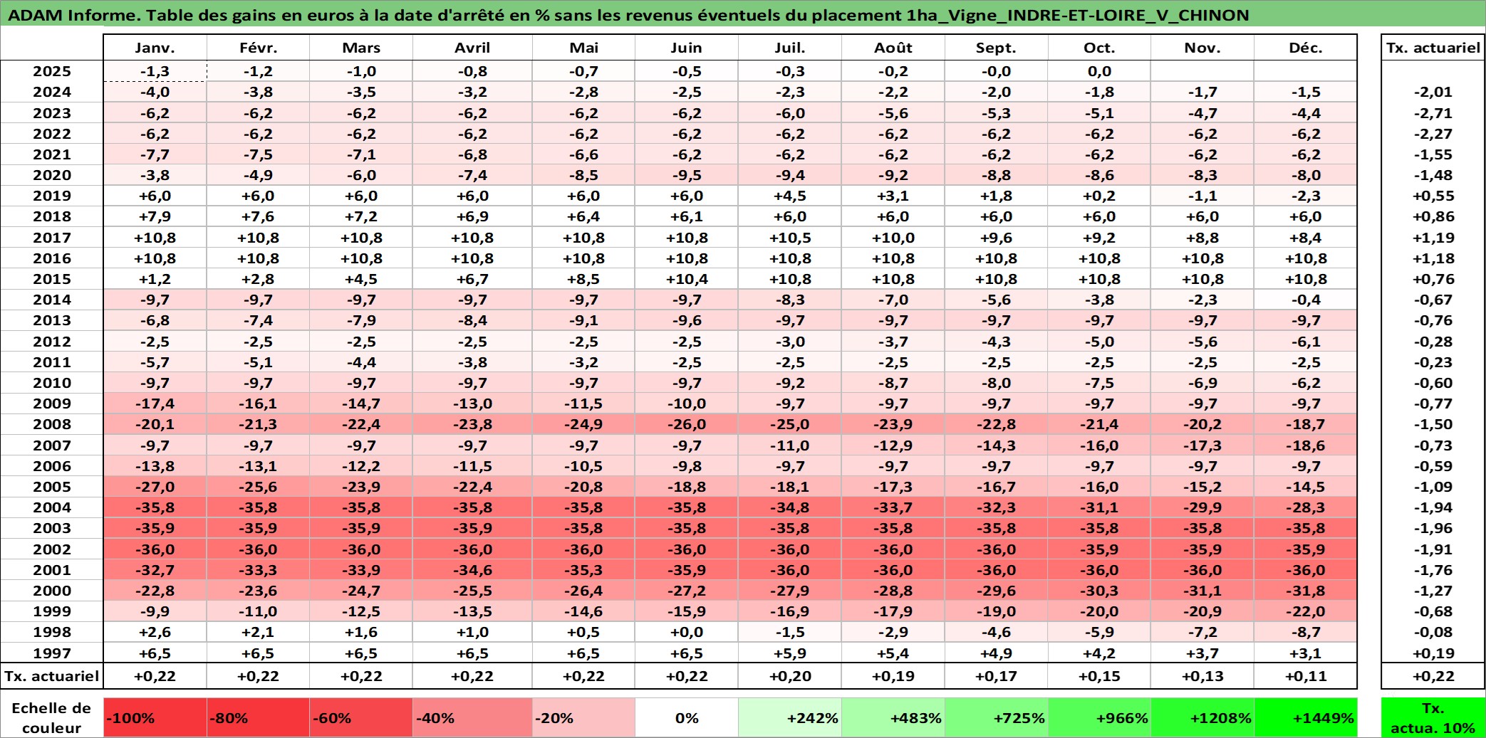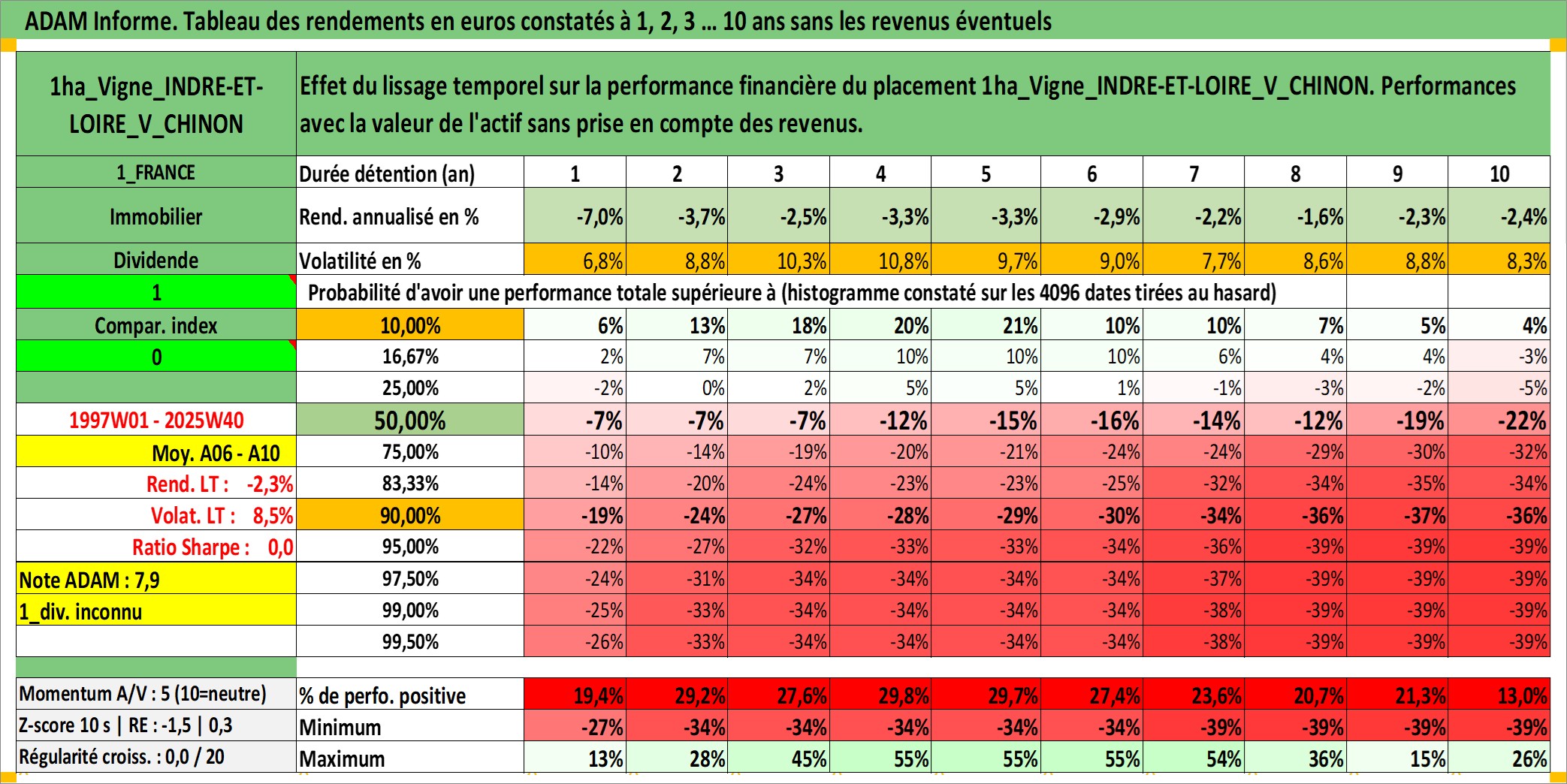 Site dédié aux investisseursPage dédiée sur site financeAnalyse des valorisations hebdomadaires de l'actif 1ha_Vigne_INDRE-ET-LOIRE_V_CHINON. Cet actif est cote en EUR. Les valorisations couvrent les semaines 1997W01 a 2025W40. Les fermages de ce bien foncier sont pris egaux a 2,5% annuels de la valeur venale du bien.