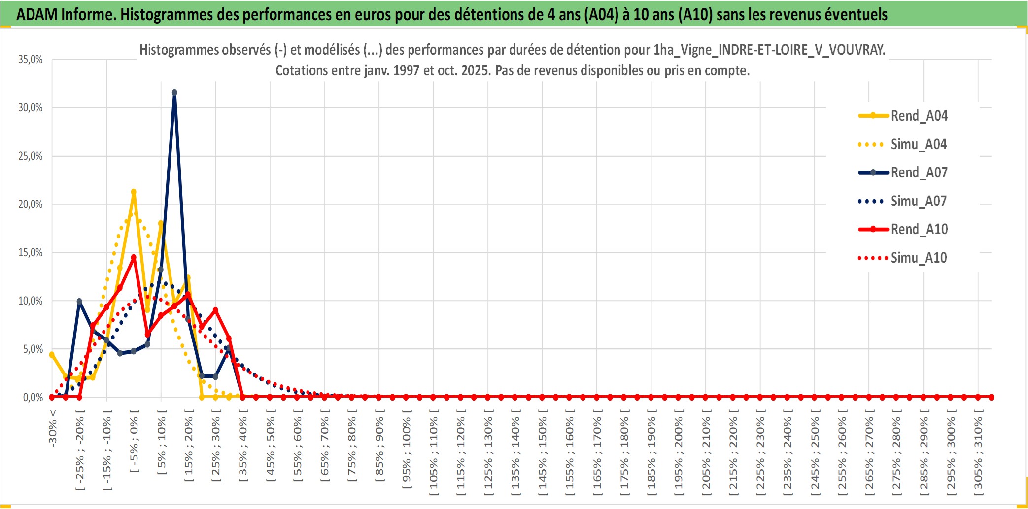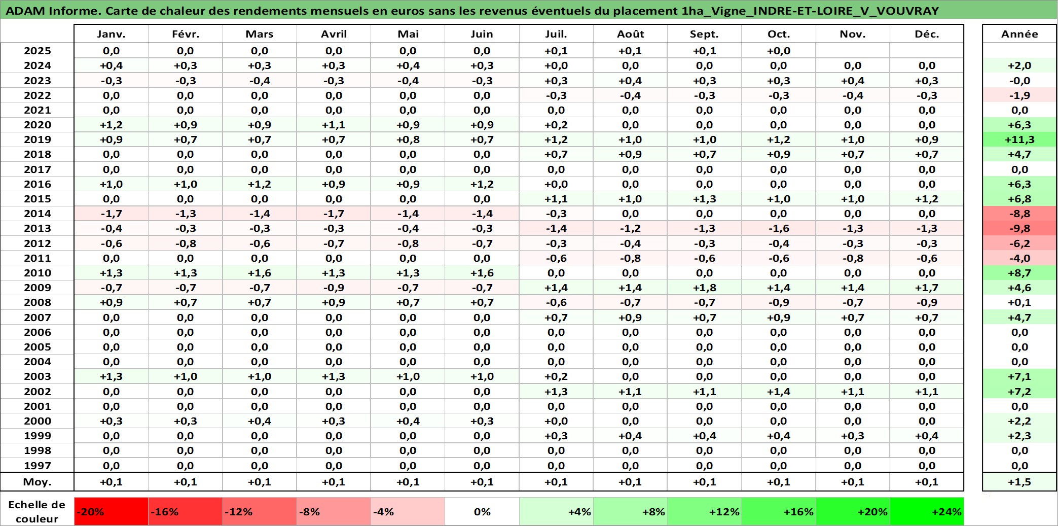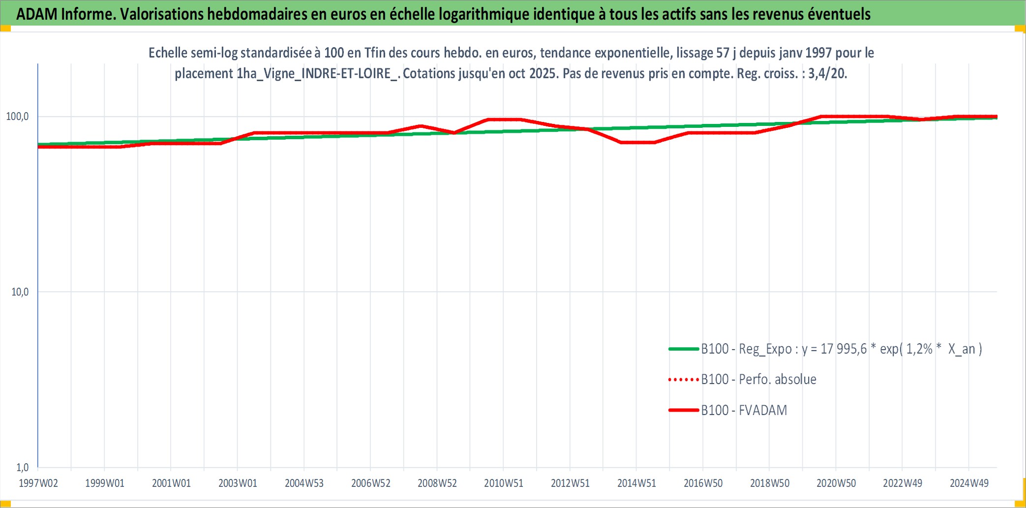 Site dédié aux investisseursPage dédiée sur site financeAnalyse des valorisations hebdomadaires de l'actif 1ha_Vigne_INDRE-ET-LOIRE_V_VOUVRAY. Cet actif est cote en EUR. Les valorisations couvrent les semaines 1997W01 a 2025W40. Les fermages de ce bien foncier sont pris egaux a 2,5% annuels de la valeur venale du bien.