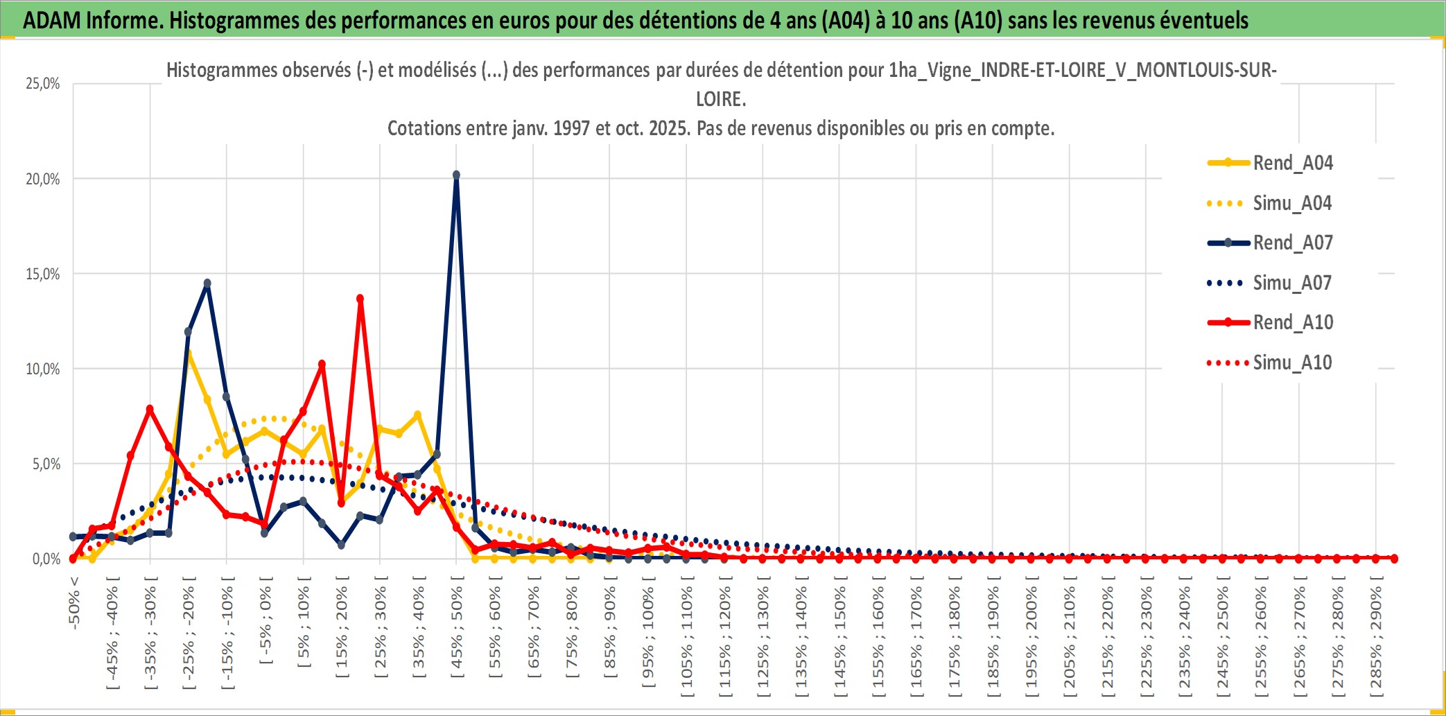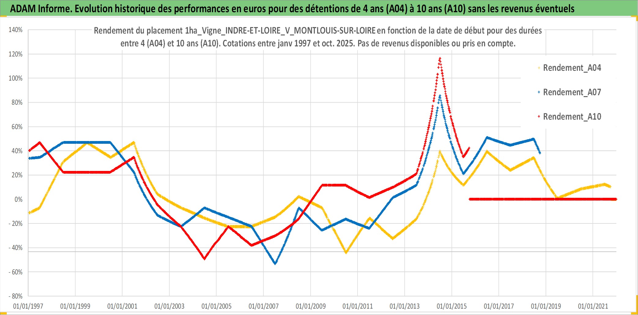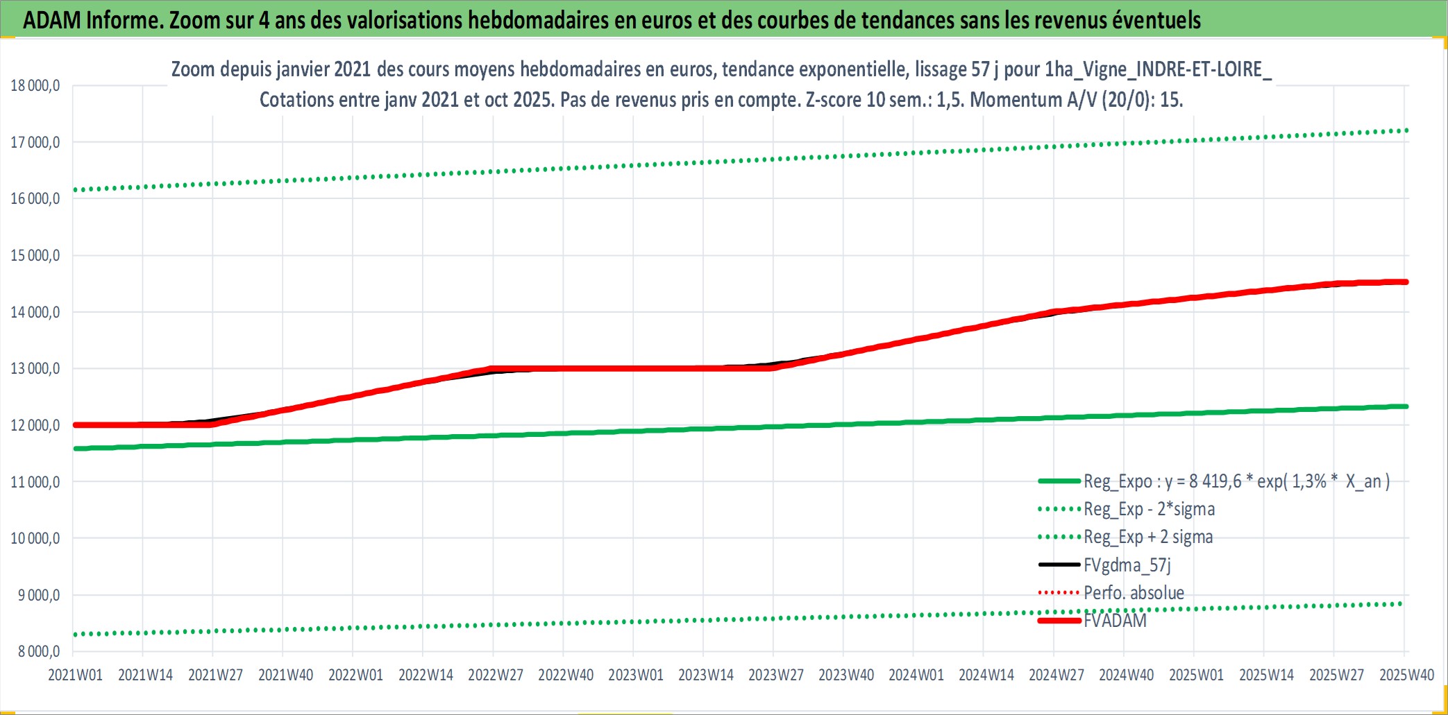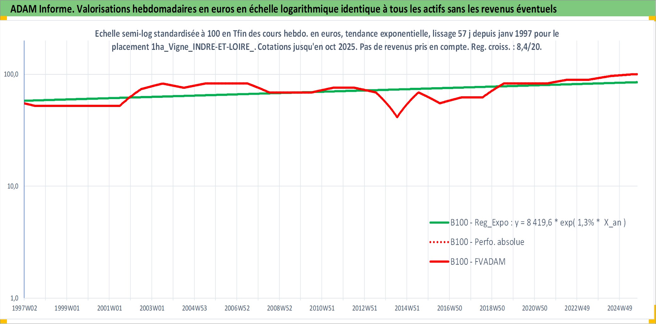 Site dédié aux investisseursPage dédiée sur site financeAnalyse des valorisations hebdomadaires de l'actif 1ha_Vigne_INDRE-ET-LOIRE_V_MONTLOUIS-SUR-LOIRE. Cet actif est cote en EUR. Les valorisations couvrent les semaines 1997W01 a 2025W40. Les fermages de ce bien foncier sont pris egaux a 2,5% annuels de la valeur venale du bien.