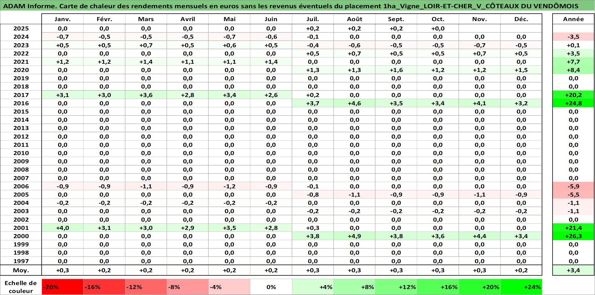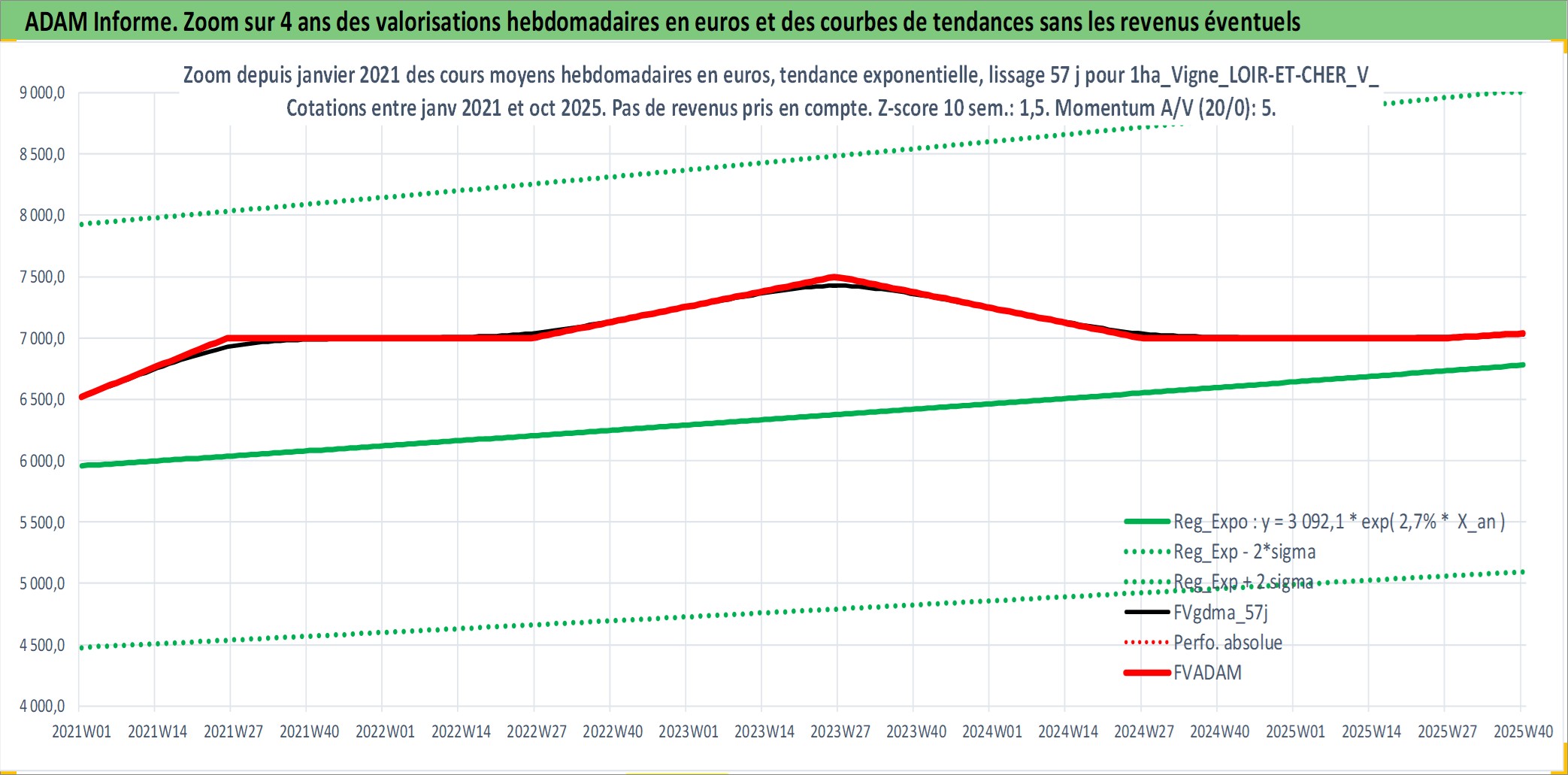 Site dédié aux investisseursPage dédiée sur site financeAnalyse des valorisations hebdomadaires de l'actif 1ha_Vigne_LOIR-ET-CHER_V_CÔTEAUX DU VENDÔMOIS. Cet actif est cote en EUR. Les valorisations couvrent les semaines 1997W01 a 2025W40. Les fermages de ce bien foncier sont pris egaux a 2,5% annuels de la valeur venale du bien.