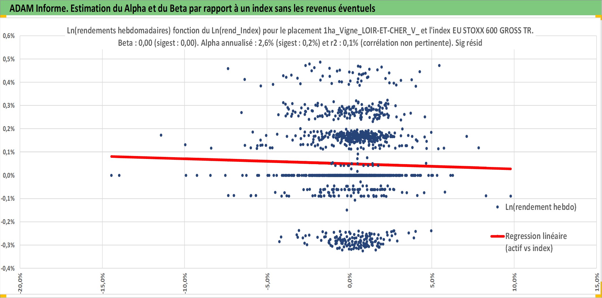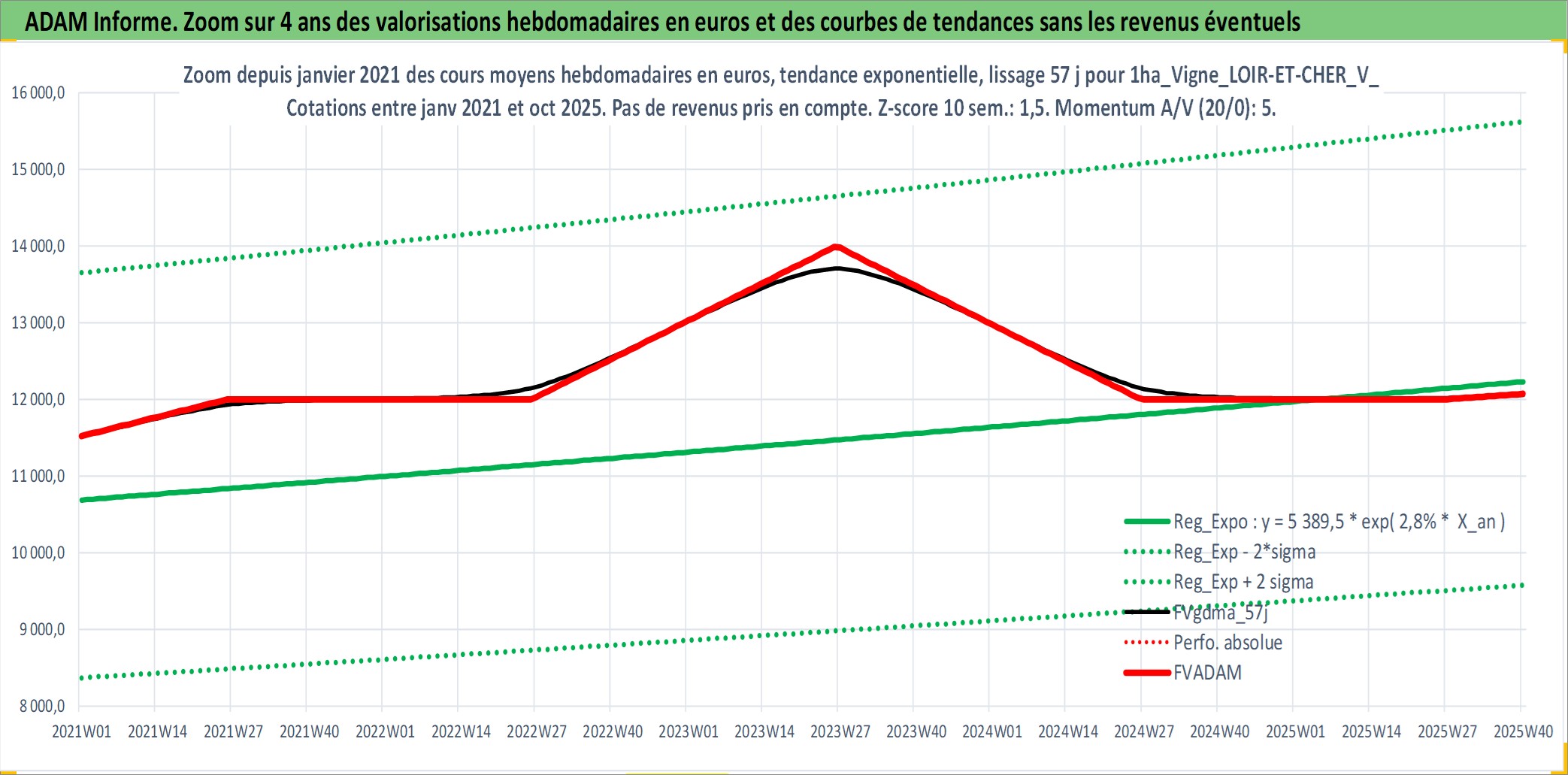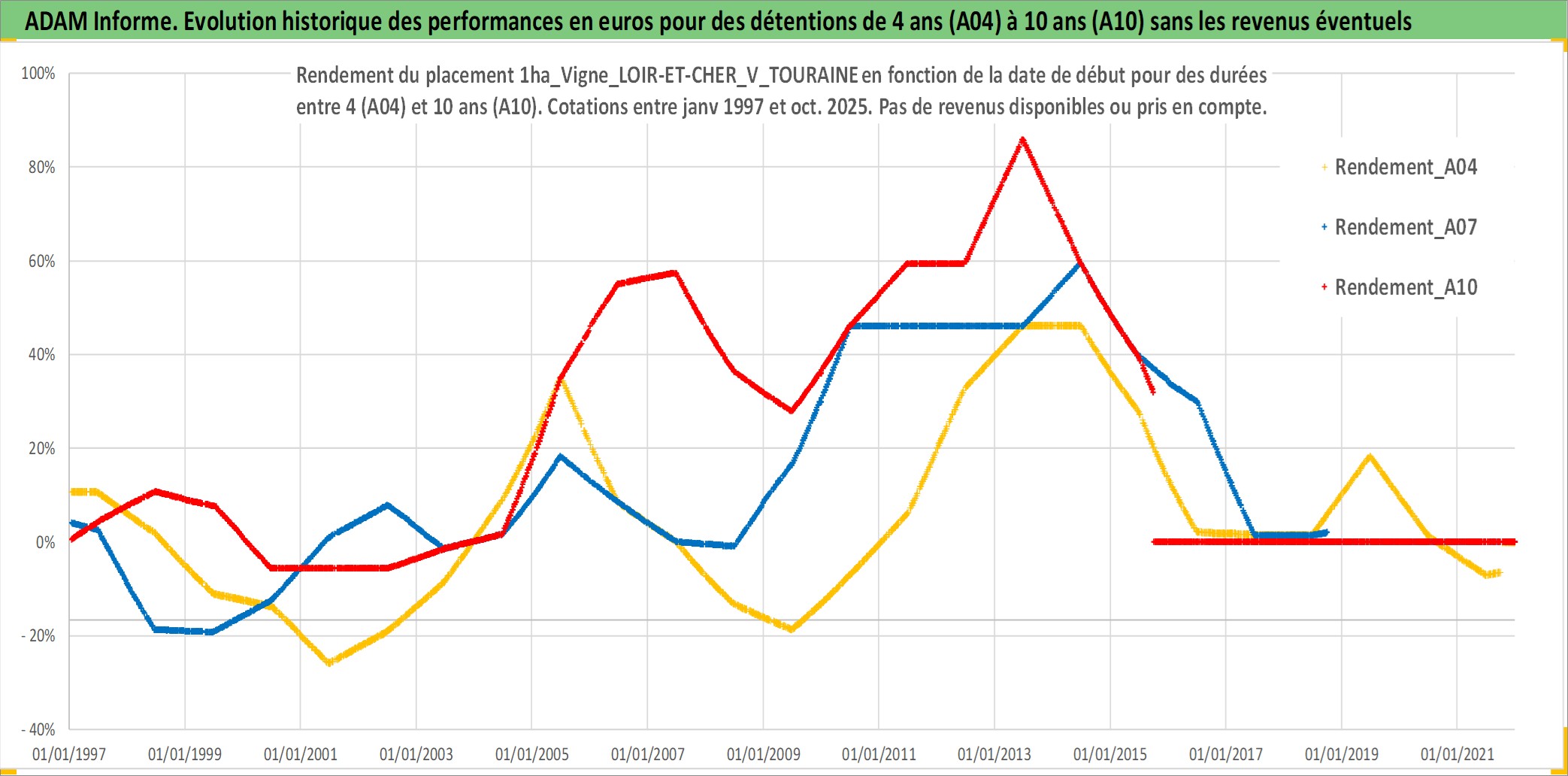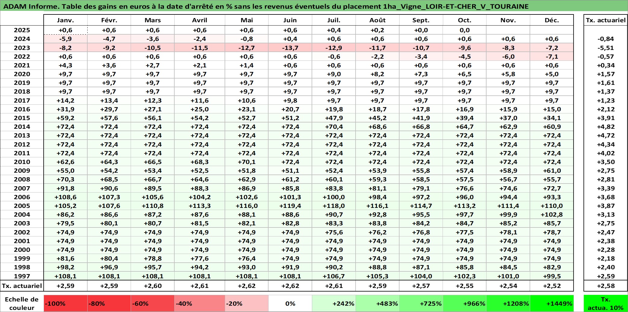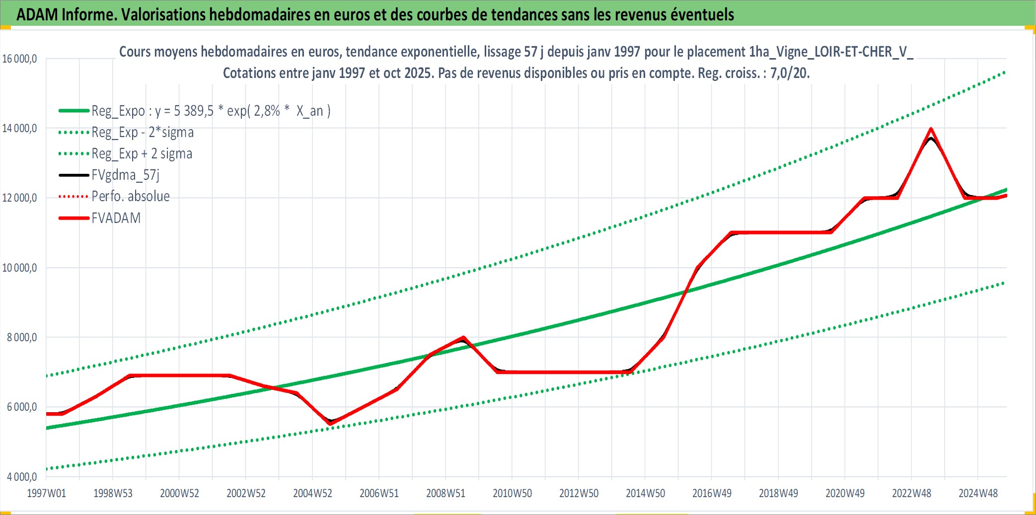 Site dédié aux investisseursPage dédiée sur site financeAnalyse des valorisations hebdomadaires de l'actif 1ha_Vigne_LOIR-ET-CHER_V_TOURAINE. Cet actif est cote en EUR. Les valorisations couvrent les semaines 1997W01 a 2025W40. Les fermages de ce bien foncier sont pris egaux a 2,5% annuels de la valeur venale du bien.