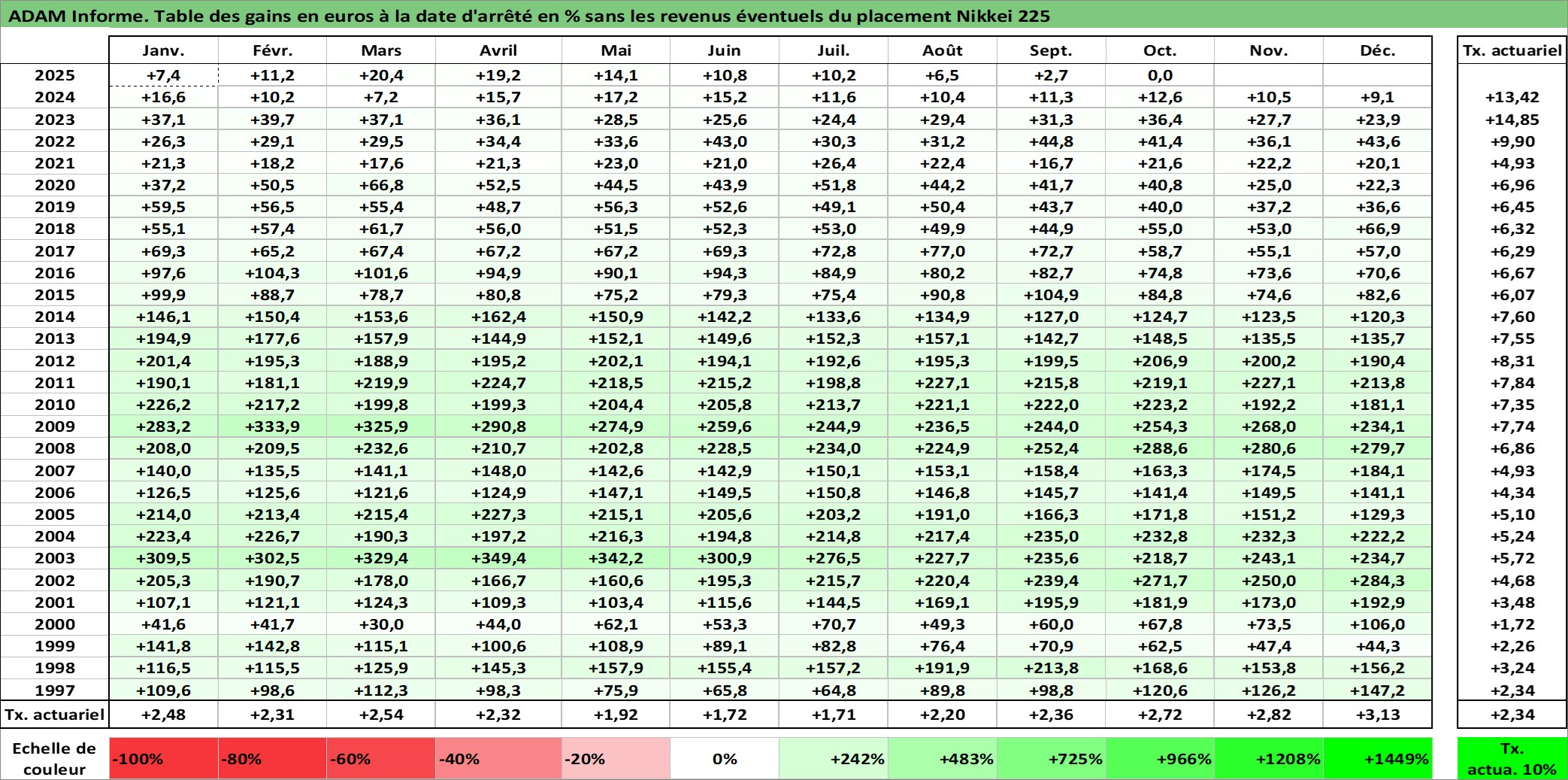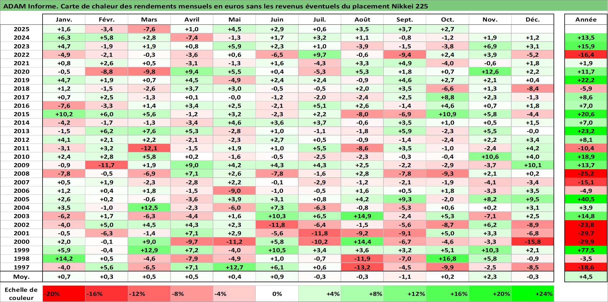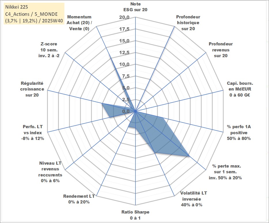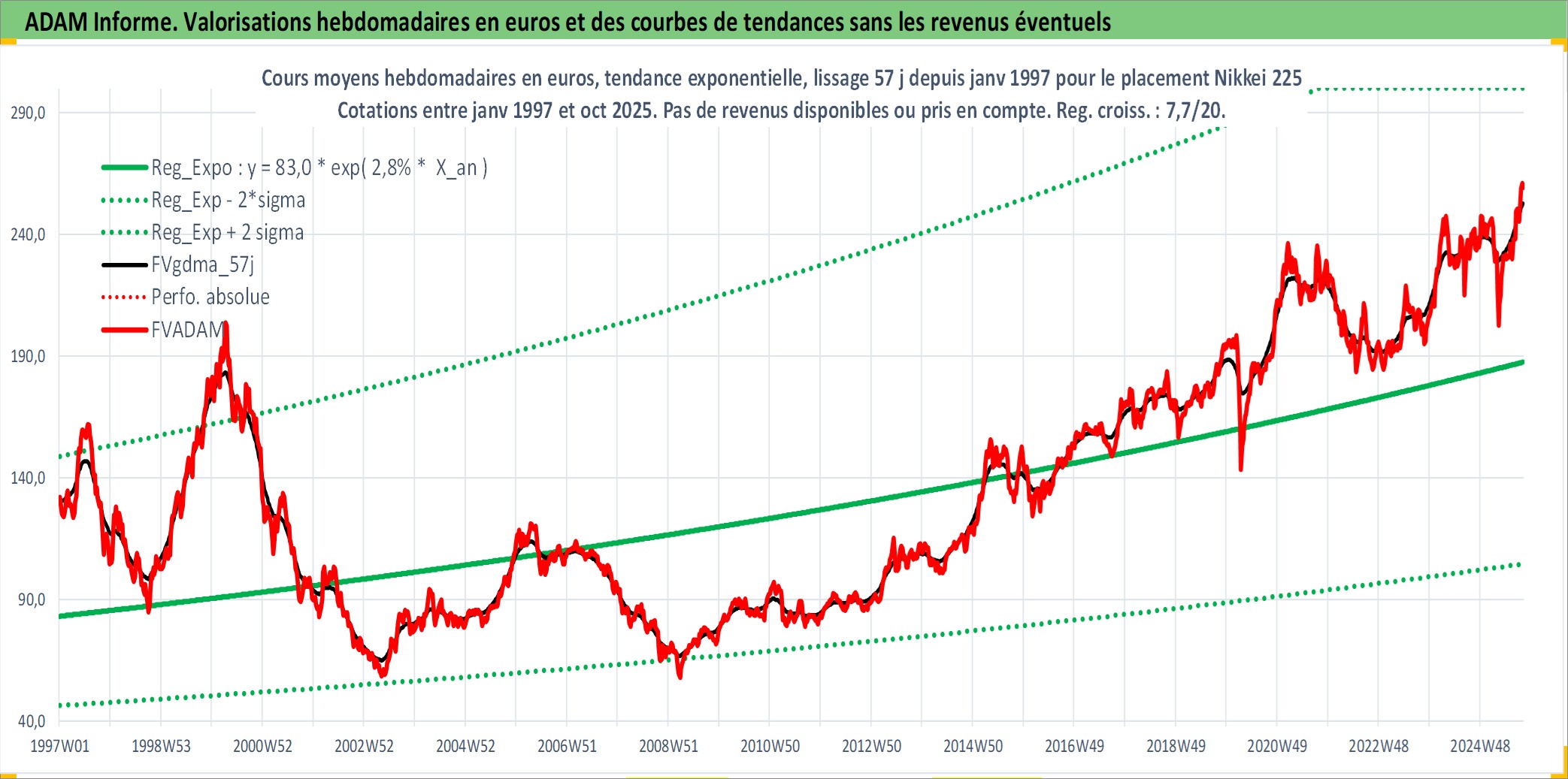 Site dédié aux investisseursPage dédiée sur site financeAnalyse des valorisations hebdomadaires de l'actif Nikkei 225. Cet actif est cote en JPY. Les valorisations sont en contrevaleur EURO et couvrent les semaines 1997W01 a 2025W40. Les revenus de cet actif financier ne sont pas connus car non existants ou non disponibles sur le site Yahoo Finance. La note ESG de cet actif n'est pas connue.